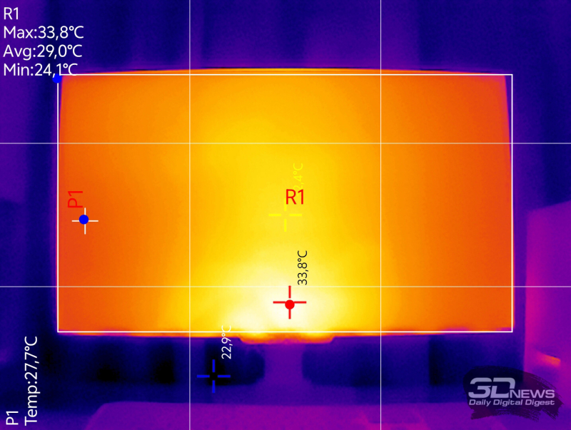 В ходе тестирования средняя температура в помещении площадью 45 м2 составляла 24 градуса. Монитор продолжительное время работал с установленной яркостью на 100 нит в центральной точке экрана. Средняя температура лицевой поверхности экрана в этом случае составила 29 градусов Цельсия, максимальное значение не превысило 34 градусов. Модель нагревается не сильно, ощутимого тепла от поверхности матрицы пользователь не почувствует.