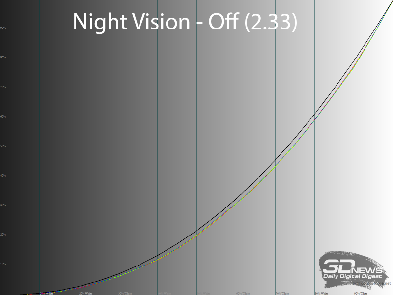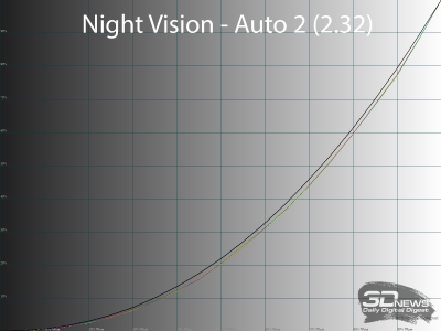 В случае с Night Vision доступно четыре предустановки со следующими значениями: Auto 1, Auto 2, Level 1 и Level 2. Два последних работают в полную силу и обеспечивают значительный подъём в диапазонах 0-40 и 0-50%, при этом сохраняя яркость в светлых областях. Автоматические же режимы на тестовых сценах не отработали вовсе – гамма-кривые остались как при настройках по умолчанию.