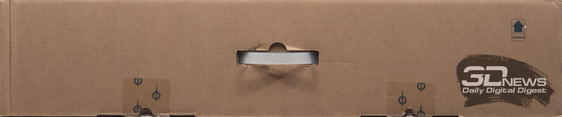 С одной из сторон представлен только крупный логотип бренда, а с другой схематичное представление монитора с двух ракурсов и основные технические характеристики. Для удобства переноски основной упаковки представлена пластиковая ручка.