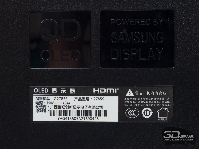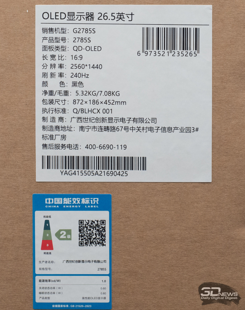 На одной из наклеек размещена важная информация, включающая номер партии, серийный номер, полное название модели монитора, основные ТХ, его массу и страну производства, которой является Китай.