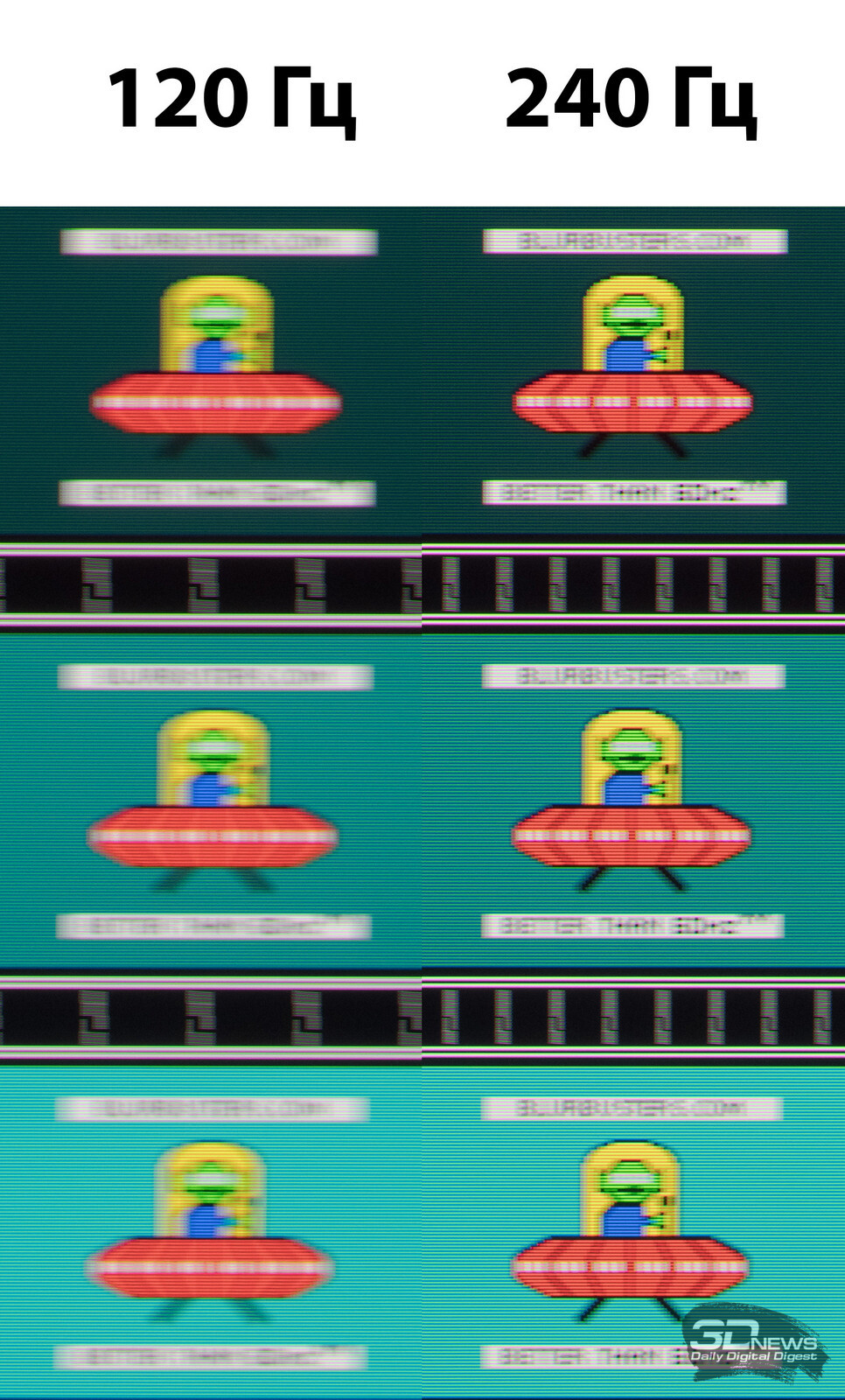 На максимальной частоте развёртки герой обзора демонстрирует минимальное смазывание и отсутствие визуально заметных артефактов. Понижение частоты до 120 Гц быстро разрушает позитивный настрой – плавность уже не та, привычка к повышенной частоте происходит быстро.