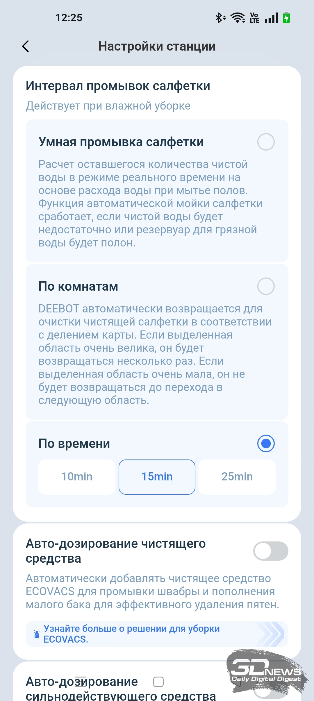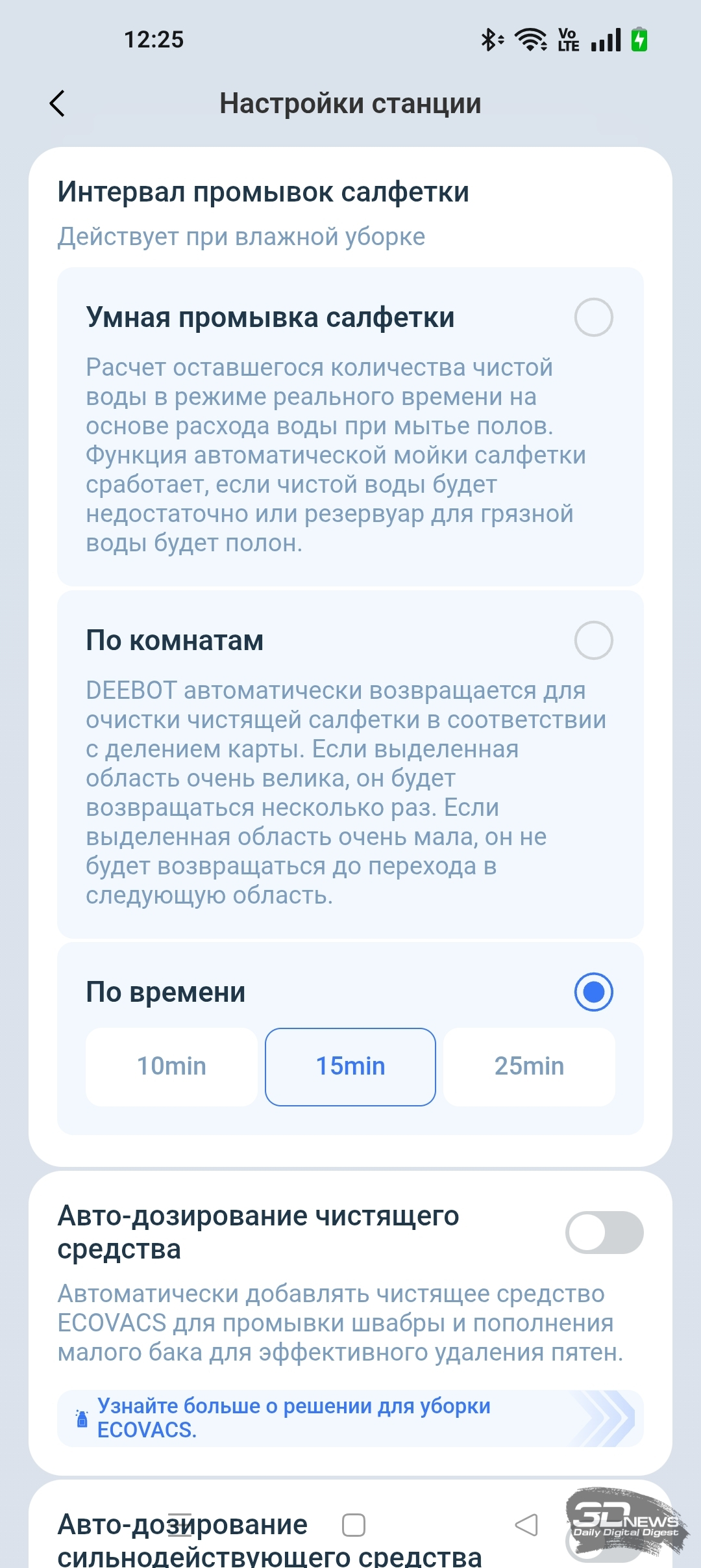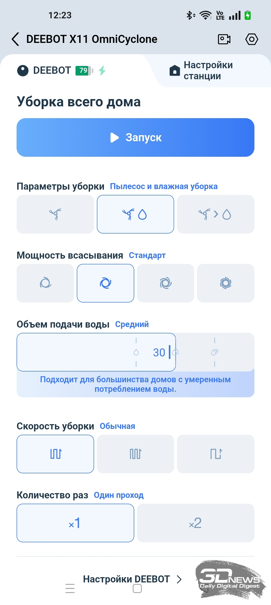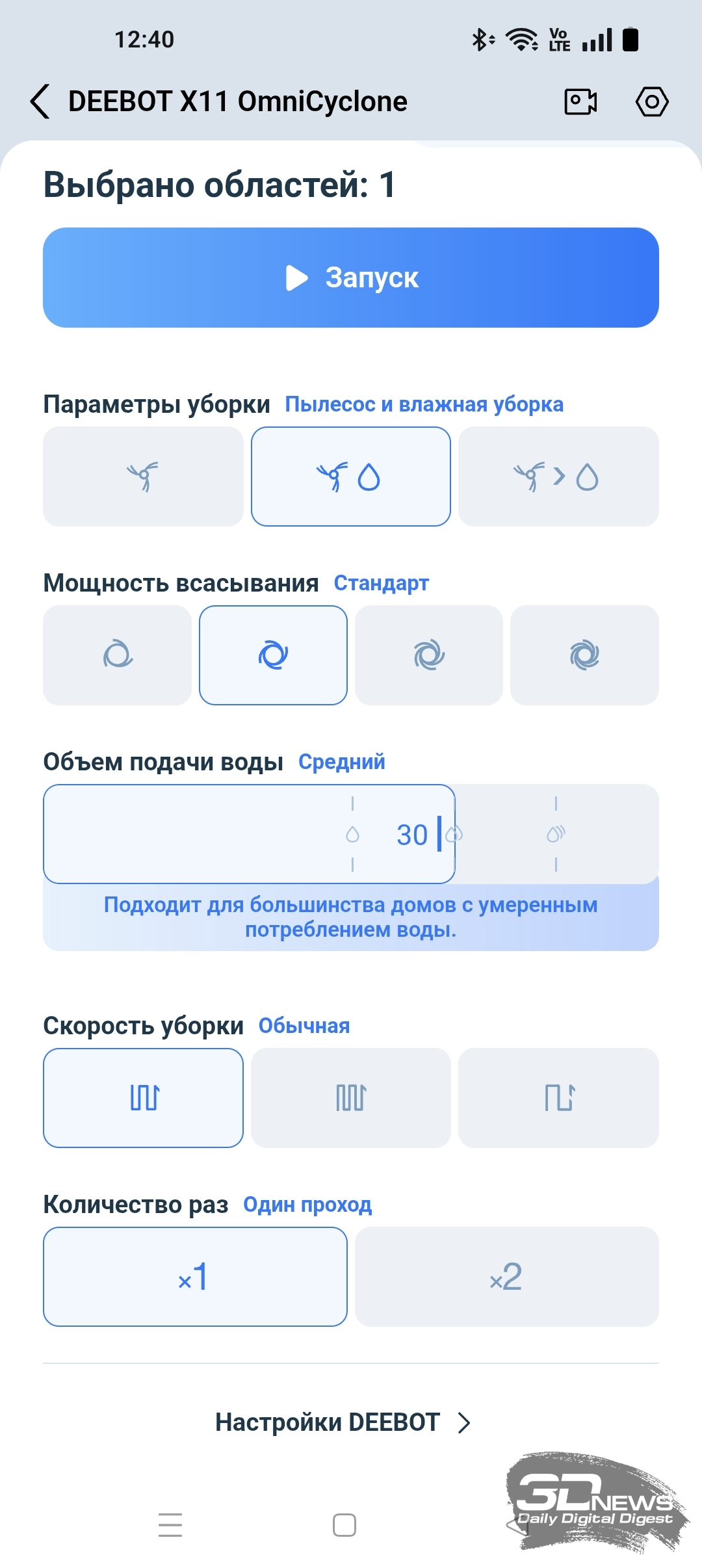 Кроме того, в приложении ECOVACS HOME мы можем регулировать объем подачи воды на салфетку и выбрать один из трех типов тщательности уборки помещения, а также определиться с количеством проходов (один или два).