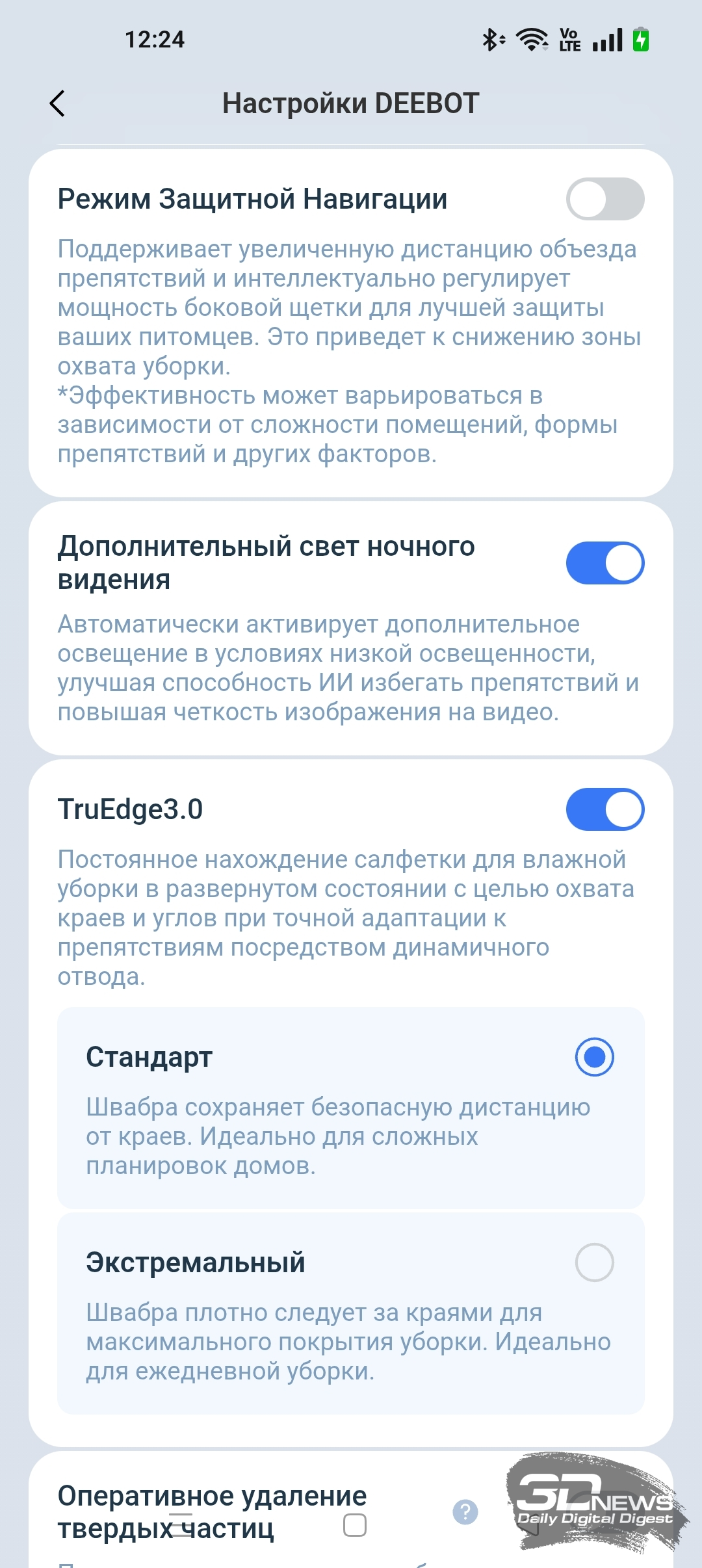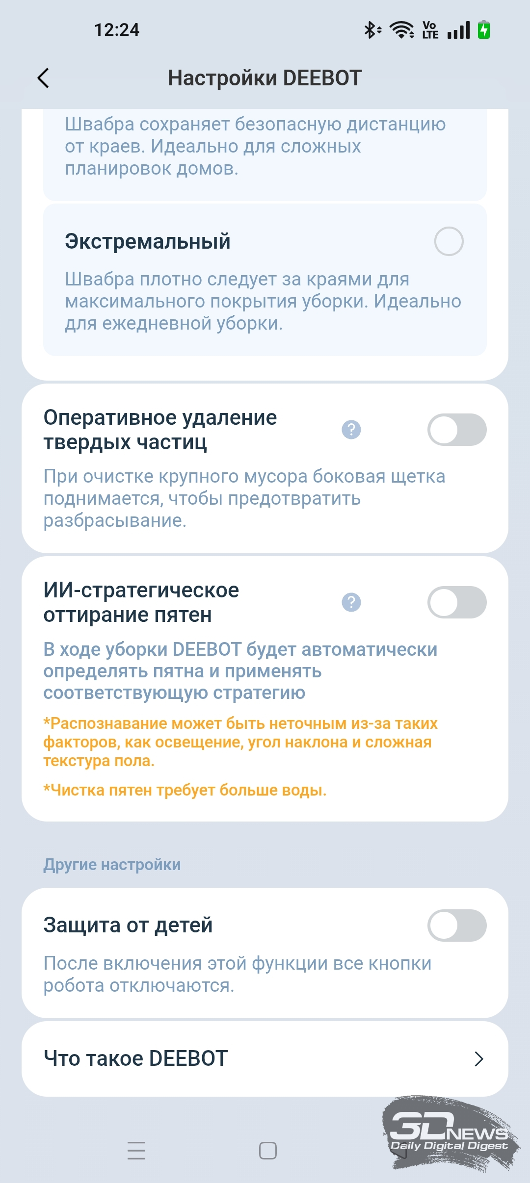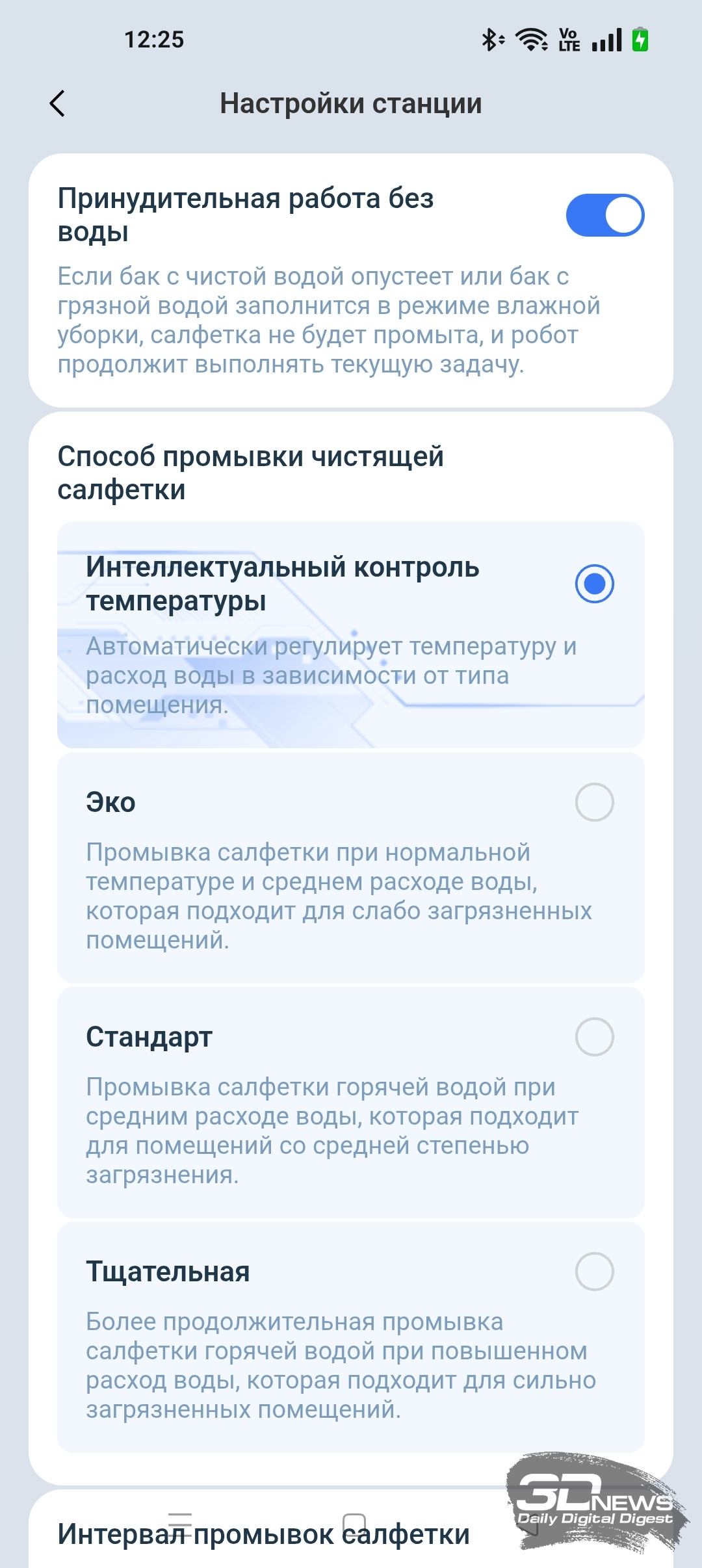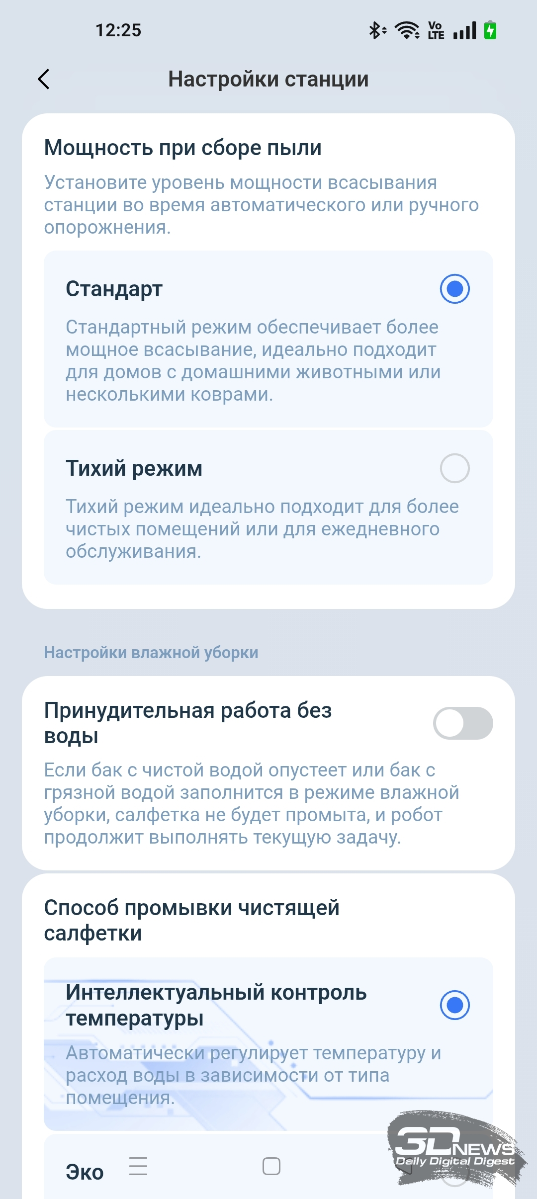 Кроме того, в приложении ECOVACS HOME мы можем регулировать объем подачи воды на салфетку и выбрать один из трех типов тщательности уборки помещения, а также определиться с количеством проходов (один или два).