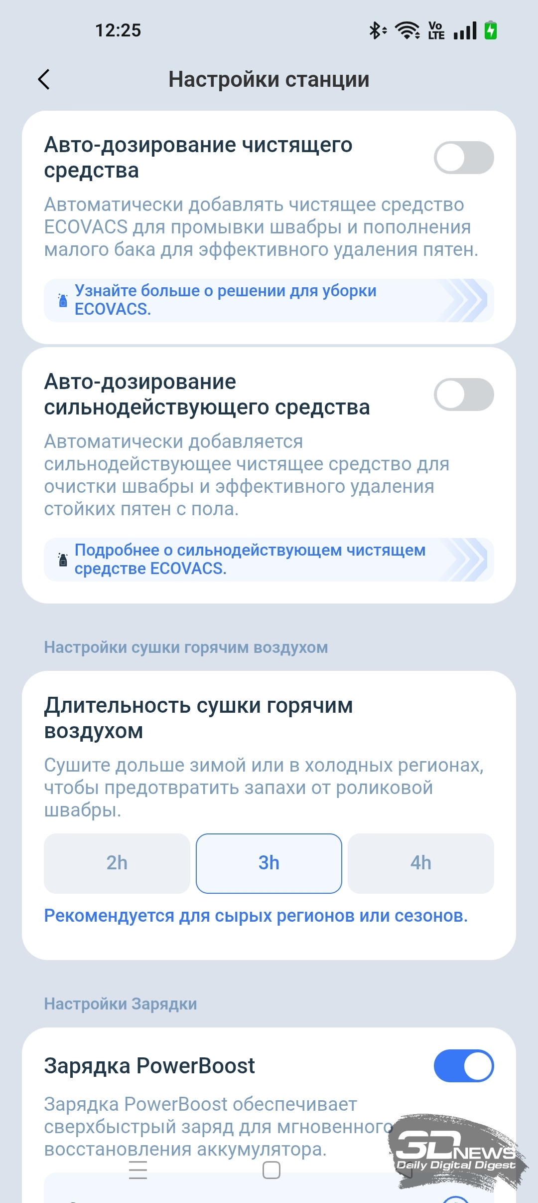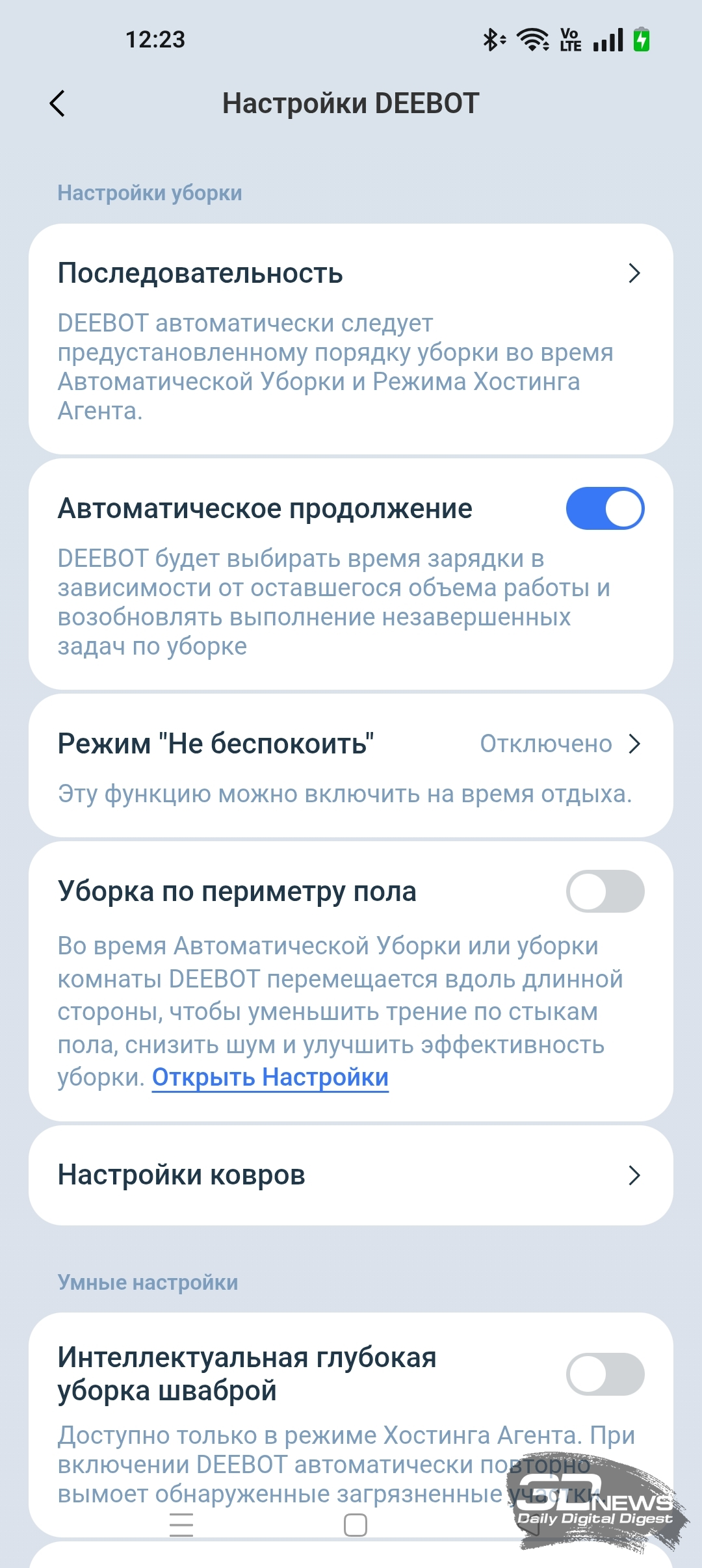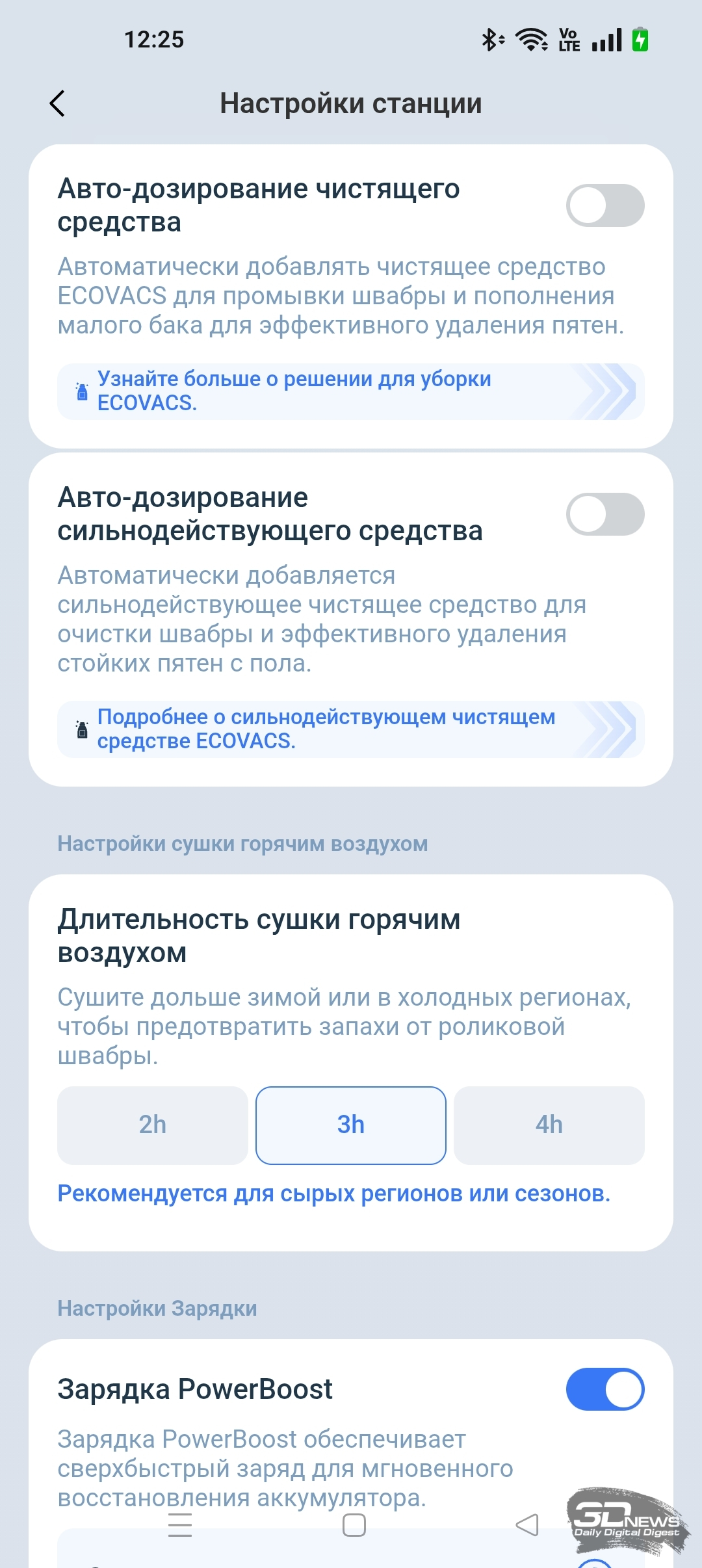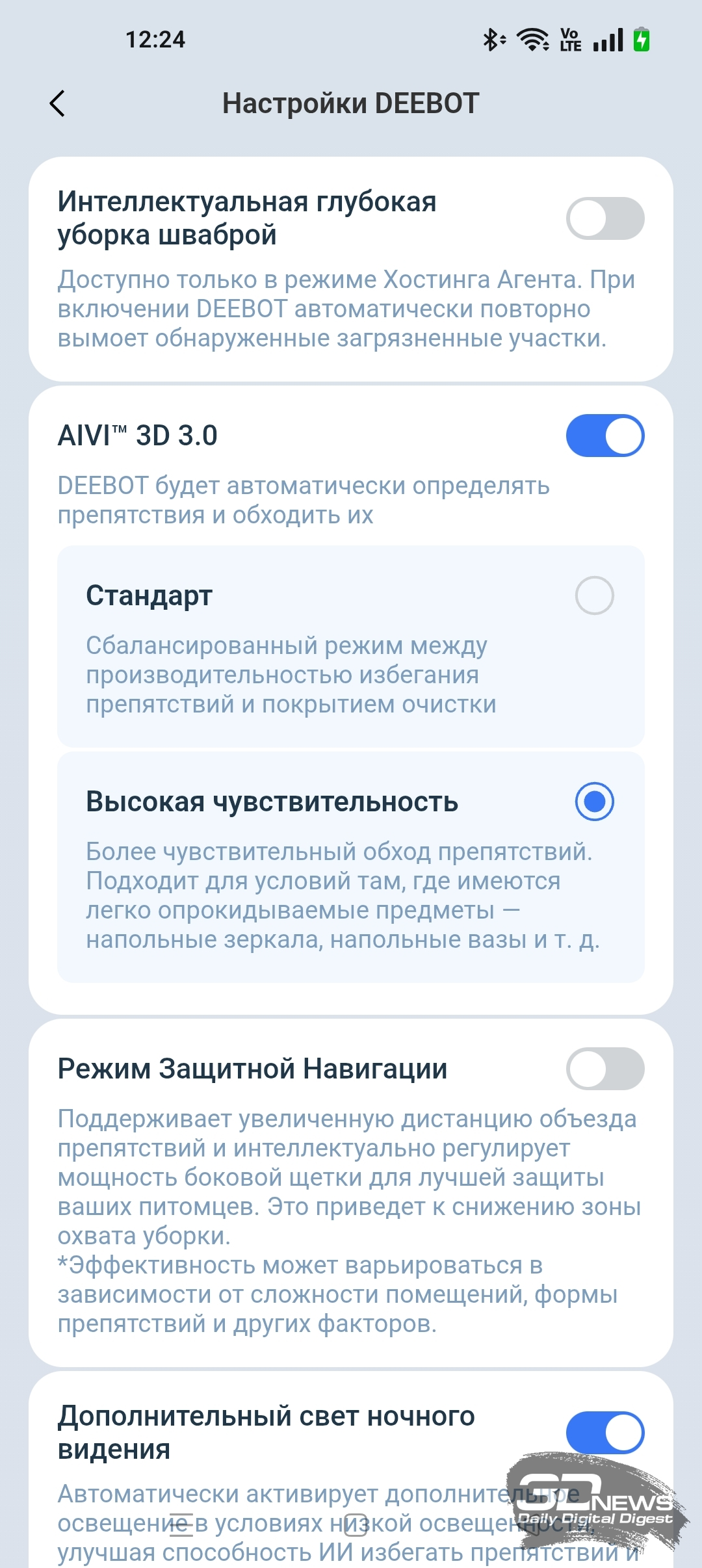 Кроме того, в приложении ECOVACS HOME мы можем регулировать объем подачи воды на салфетку и выбрать один из трех типов тщательности уборки помещения, а также определиться с количеством проходов (один или два).