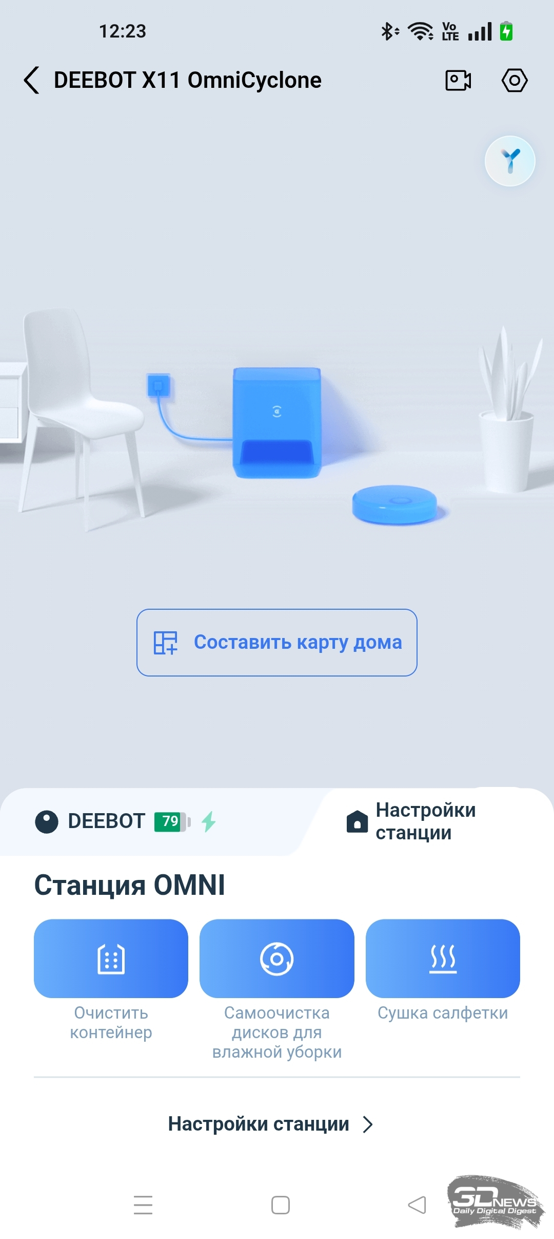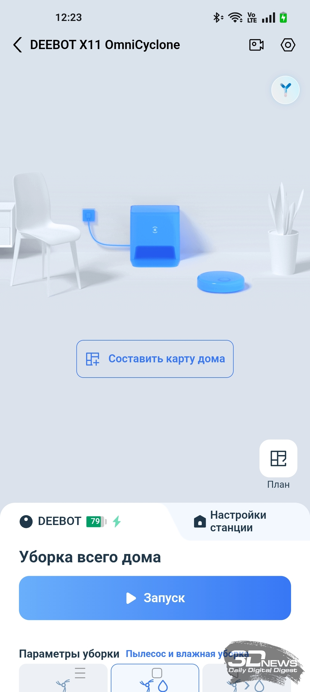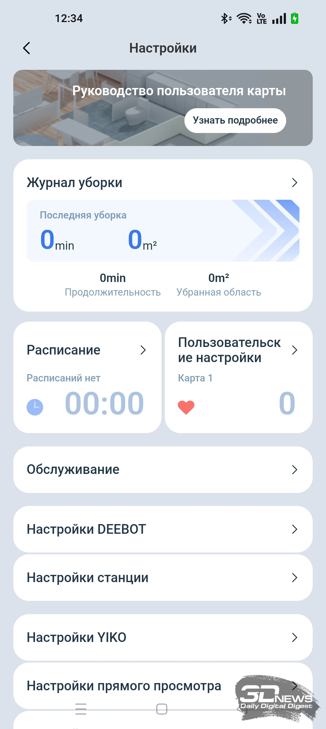 Для полноценной работы устройства необходимо установить на смартфон приложение ECOVACS HOME, доступное для операционных систем Android и iOS. Оно предоставляет пользователю настройки по управлению как роботом-уборщиком, так и станцией самоочистки. Утилита полностью переведена на русский язык и обладает большим числом подсказок. Подключение робота к домашней Wi-Fi-сети с общим SSID точек доступа 2,4 и 5 ГГц и комбинированной защитой WPA2/WPA3 не вызвало никаких проблем, а модель устройства определилась по QR-коду. Вся процедура заняла от силы одну-две минуты — необходимы регистрация в приложении и доступ в интернет.