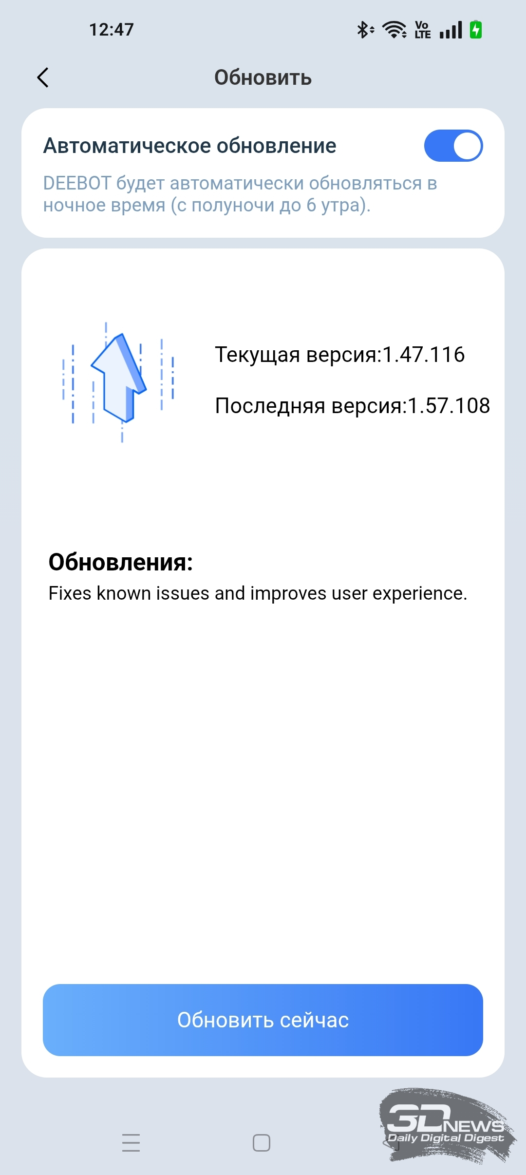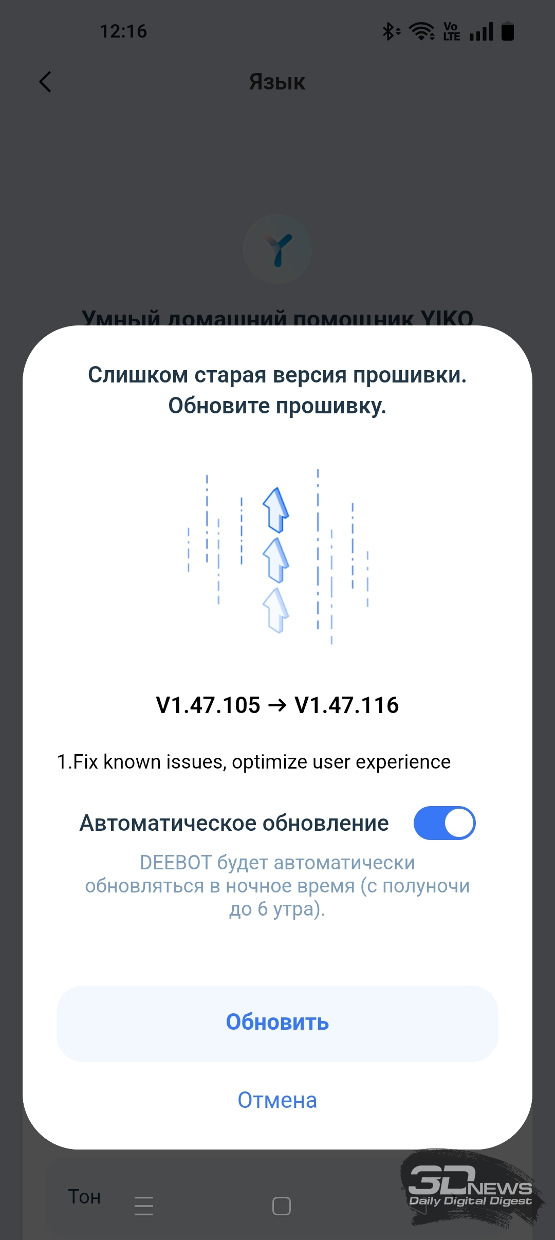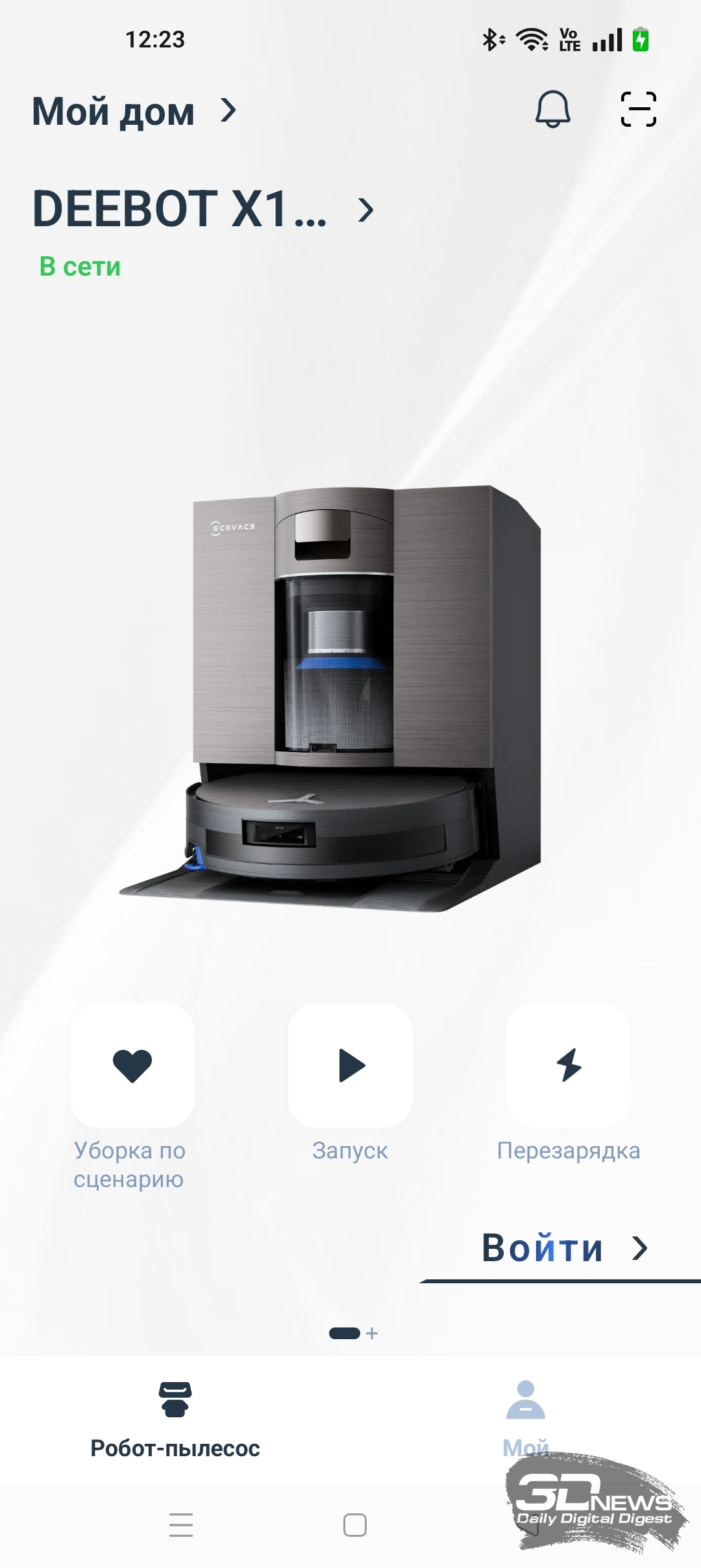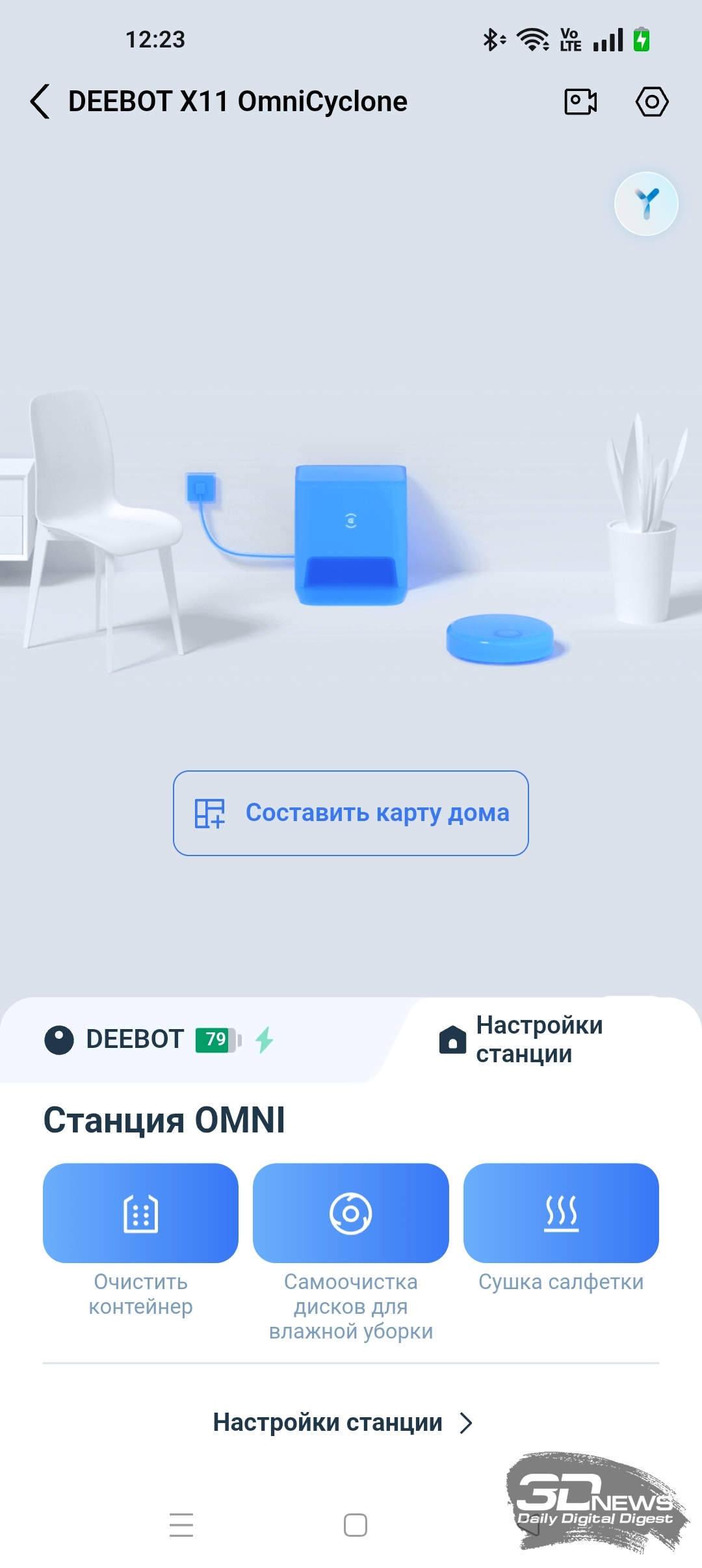 Для полноценной работы устройства необходимо установить на смартфон приложение ECOVACS HOME, доступное для операционных систем Android и iOS. Оно предоставляет пользователю настройки по управлению как роботом-уборщиком, так и станцией самоочистки. Утилита полностью переведена на русский язык и обладает большим числом подсказок. Подключение робота к домашней Wi-Fi-сети с общим SSID точек доступа 2,4 и 5 ГГц и комбинированной защитой WPA2/WPA3 не вызвало никаких проблем, а модель устройства определилась по QR-коду. Вся процедура заняла от силы одну-две минуты — необходимы регистрация в приложении и доступ в интернет.