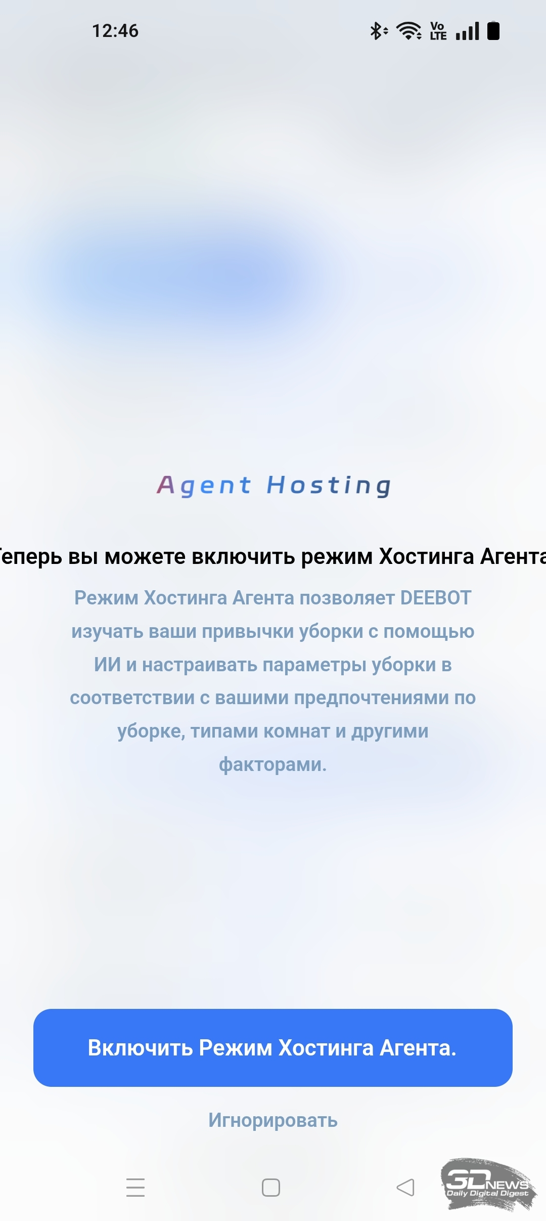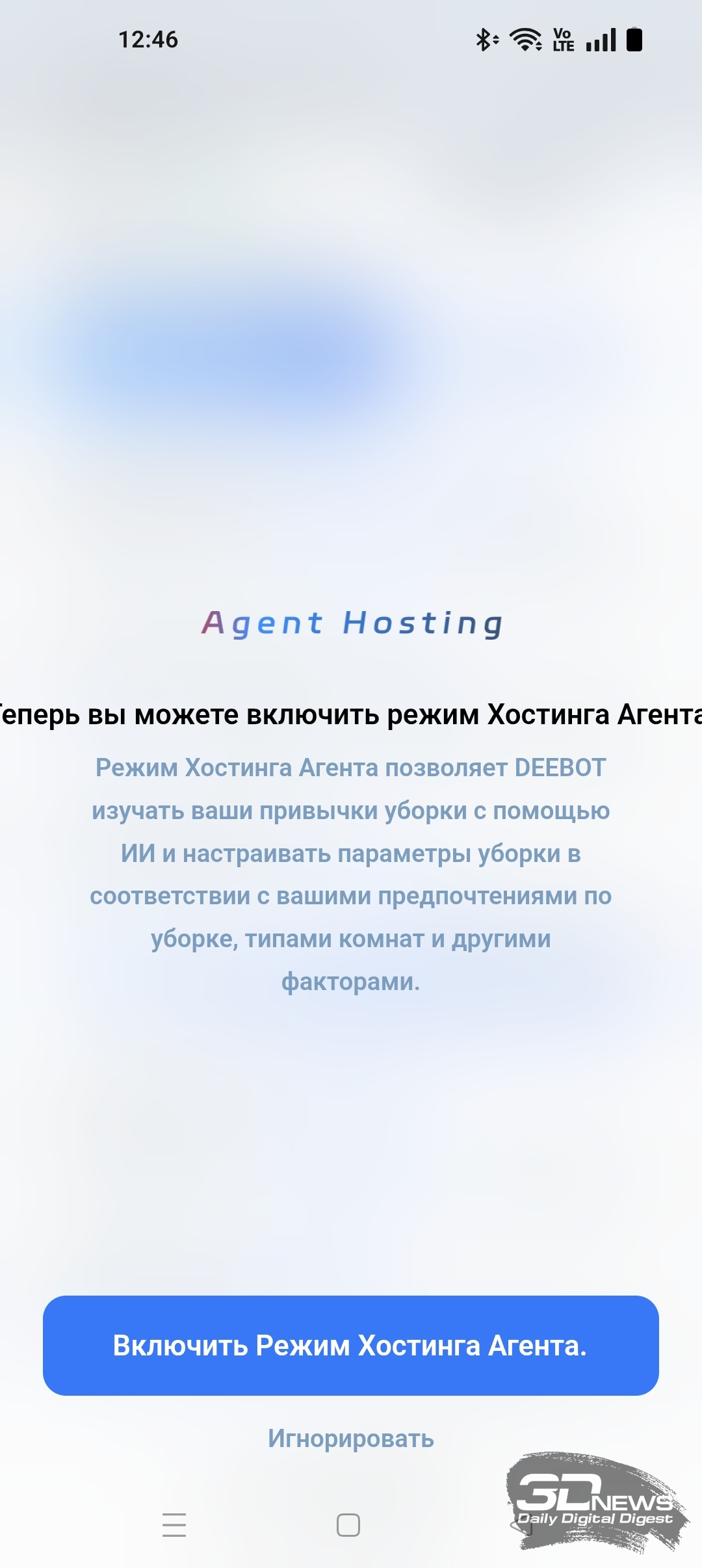 Для однопроходной уборки помещения мы использовали комбинацию одновременной сухой и влажной уборки в режиме «Стандарт» и с обычной скоростью. В итоге DEEBOT X11 OmniCyclone очистил 17 м2 за 24 минуты, потратив при этом 15 % заряда аккумулятора. По окончании уборки приложение предложило включить режим Agent Hosting. Его активация позволяет «Диботу» убирать помещение с помощью искусственного интеллекта. Например, при обнаружении загрязнения определенного типа робот сам решит, какие режимы скорости и мощности ему включать. С каждой уборкой хостинг-режим превращает DEEBOT X11 OmniCyclone в самостоятельного «менеджера уборки», адаптирующегося под привычки владельца.