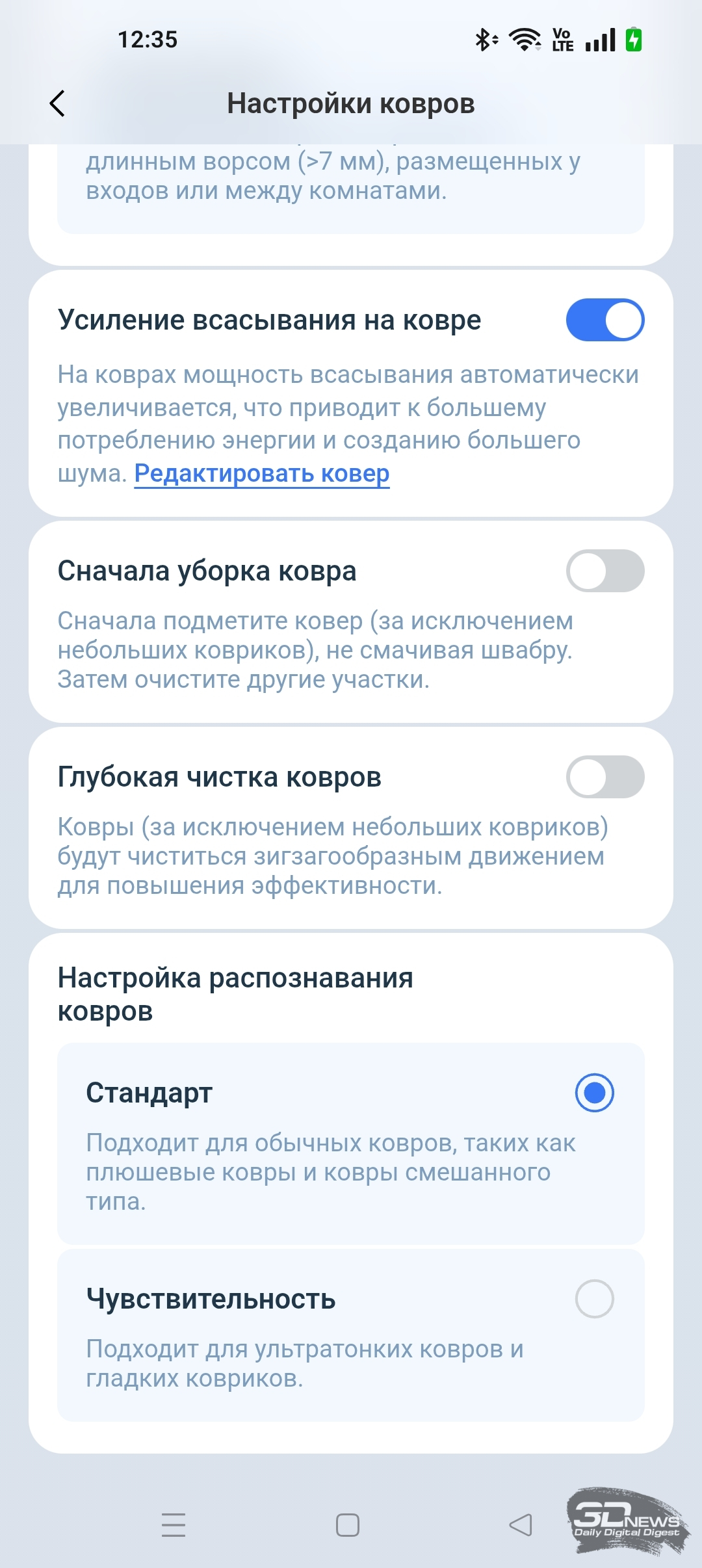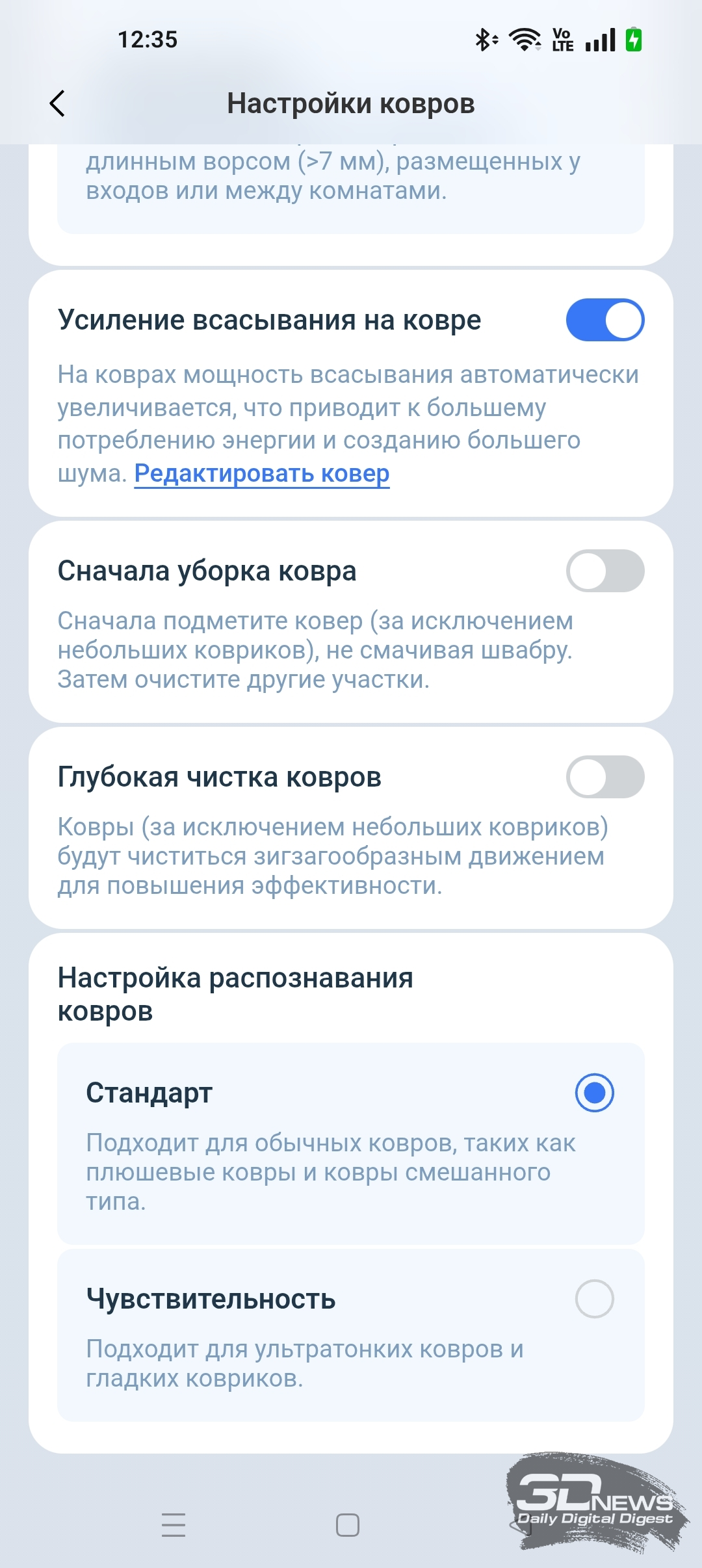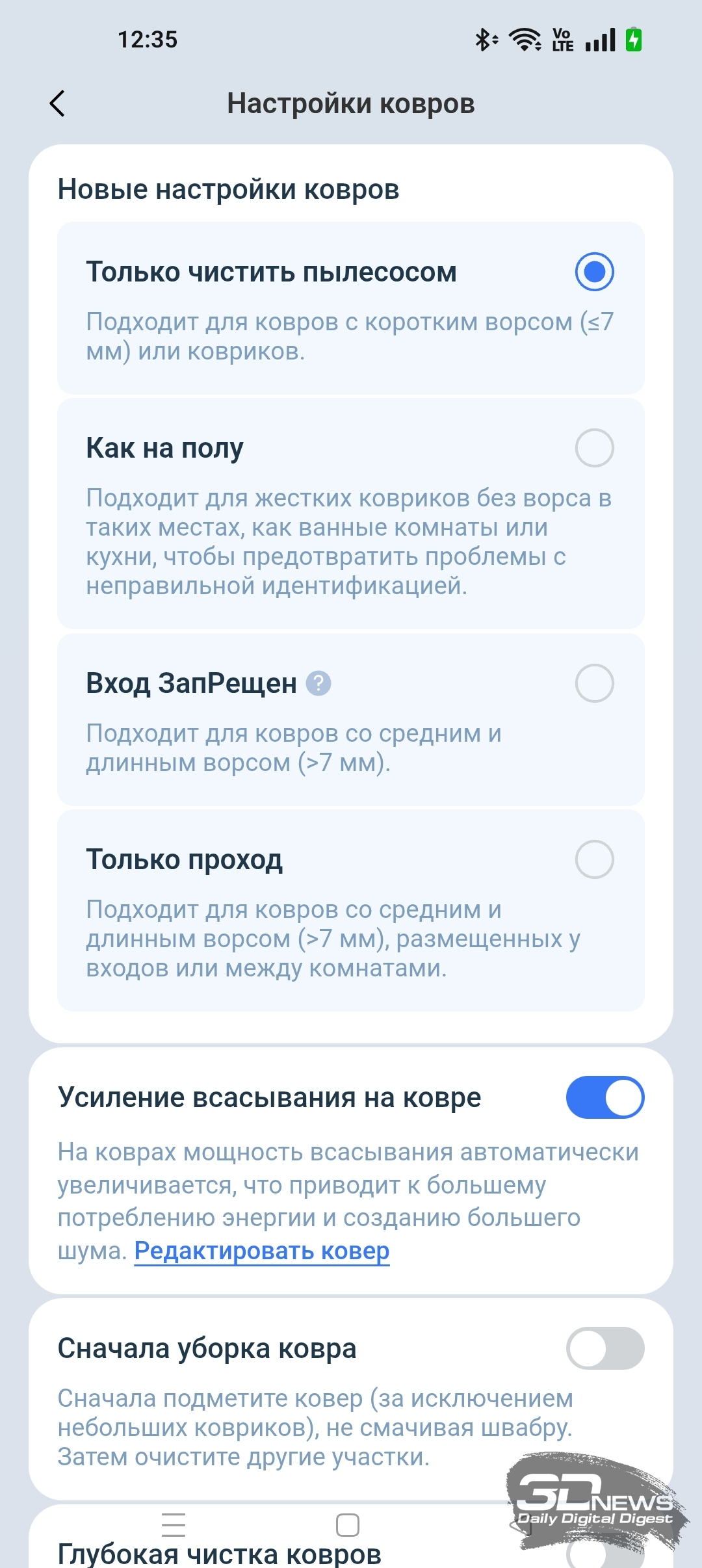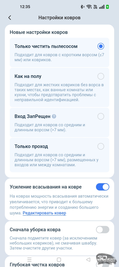 • настроить режим очистки ковров;