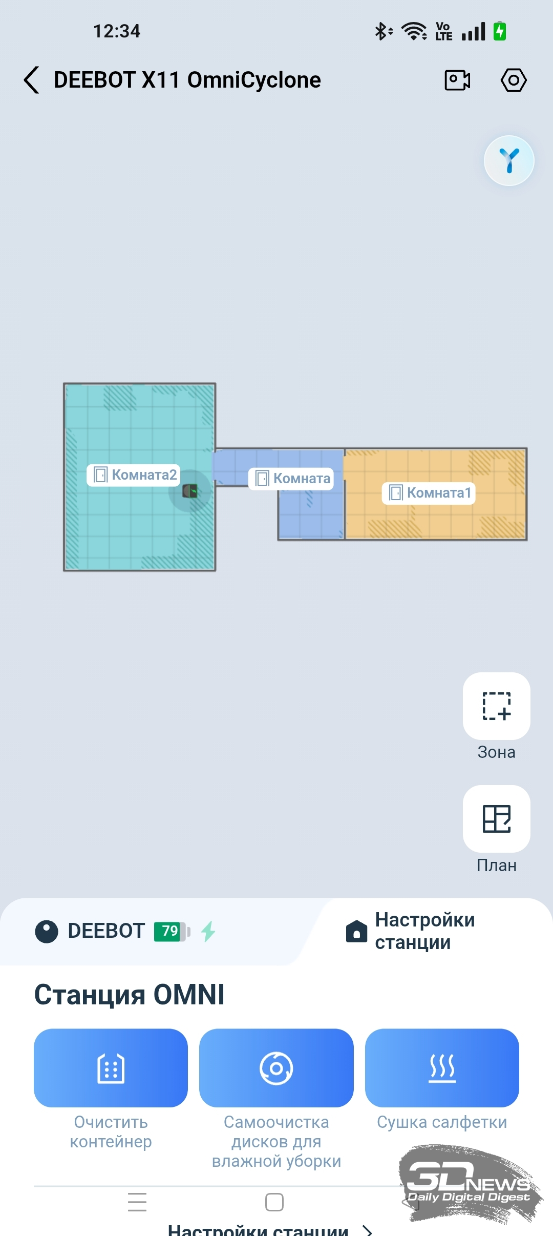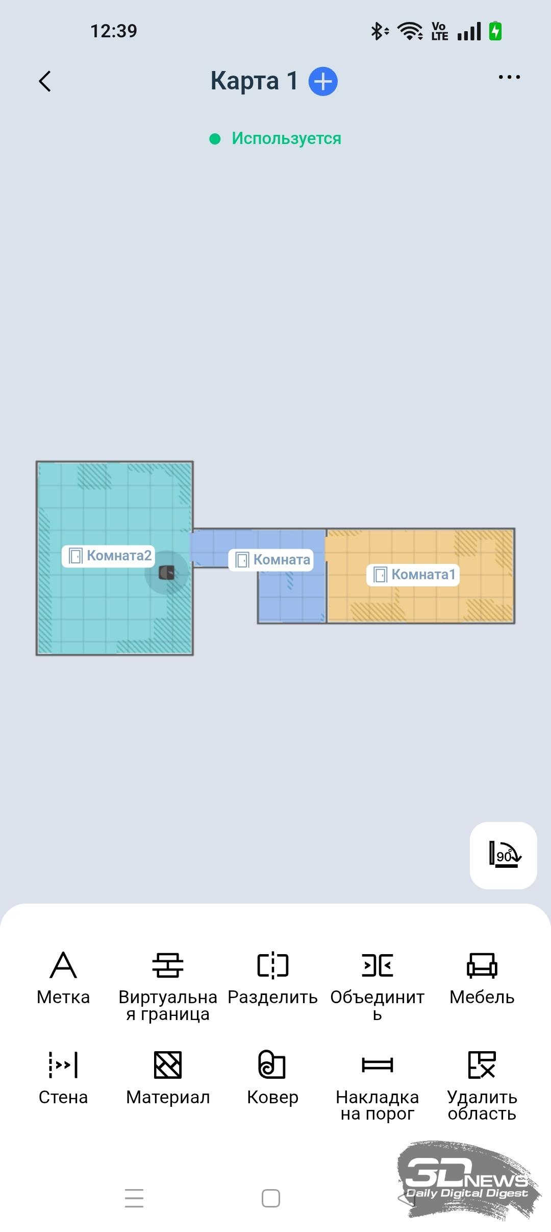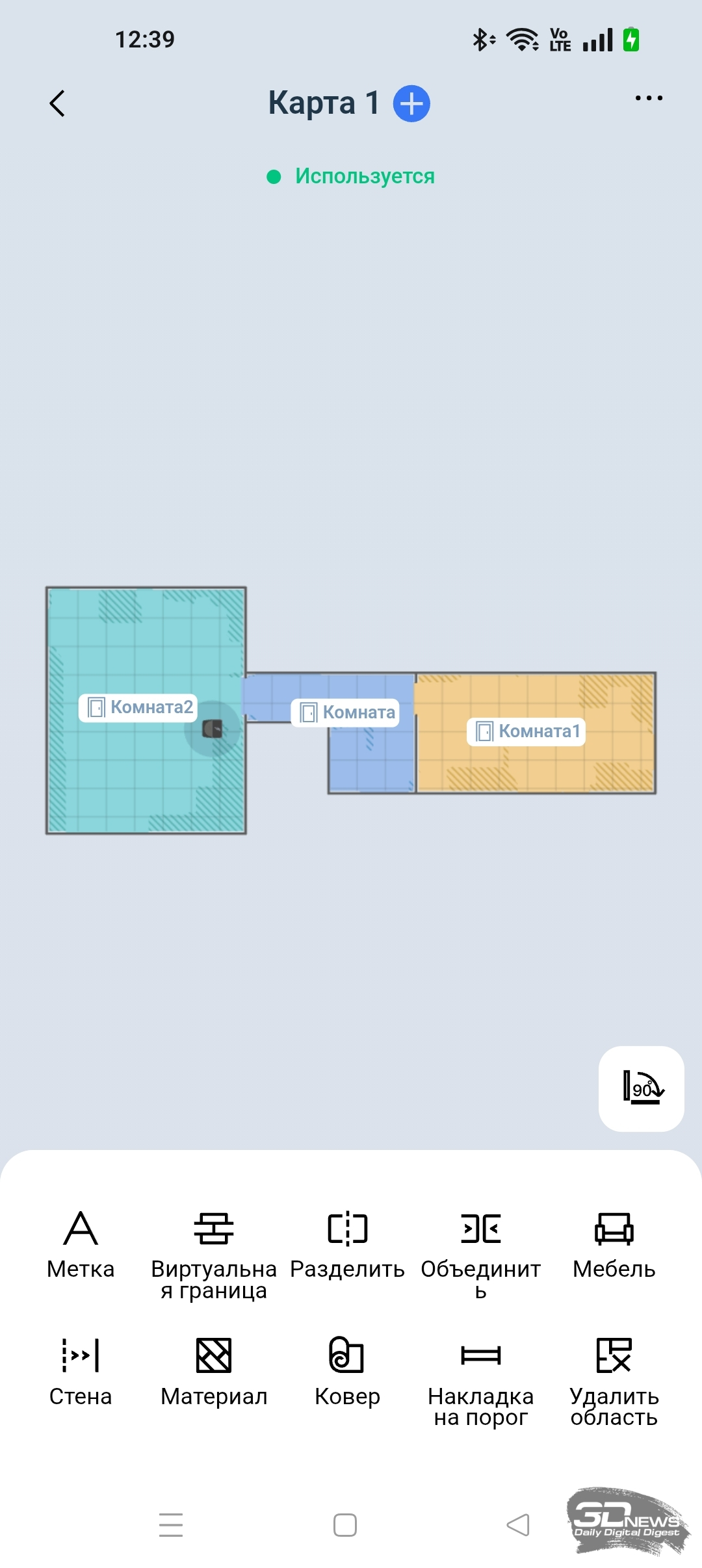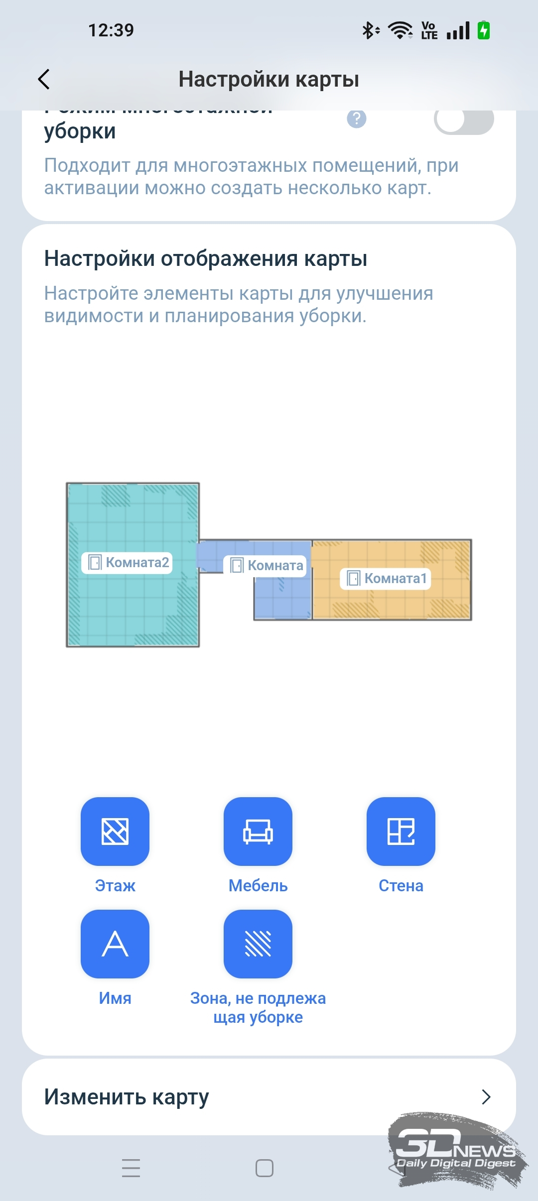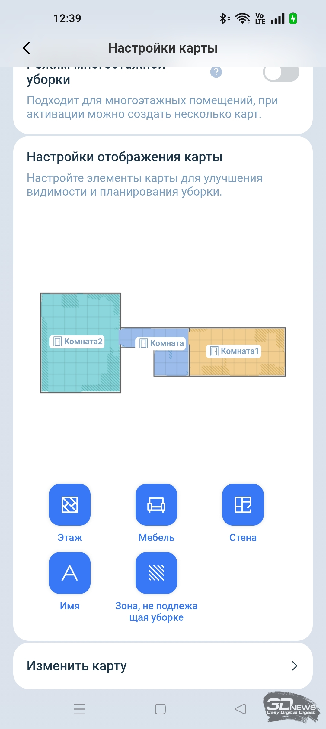Во время сканирования помещения робот трудился практически бесшумно. Карта была создана верно, но в приложении она отображается схематически. Мебель и прочие препятствия указаны в виде закрашенных темных областей. В приложении доступны 2D- и 3D-отображение карты. А еще мы можем самостоятельно отредактировать карту, указав этаж, расставив мебель, установив стены, наложив виртуальные границы, уточнив материал поверхности, а также обозначив ковры и зоны, не подлежащие уборке. Любую комнату можно переименовать. В целом в ECOVACS HOME есть все необходимое для точной настройки помещения.