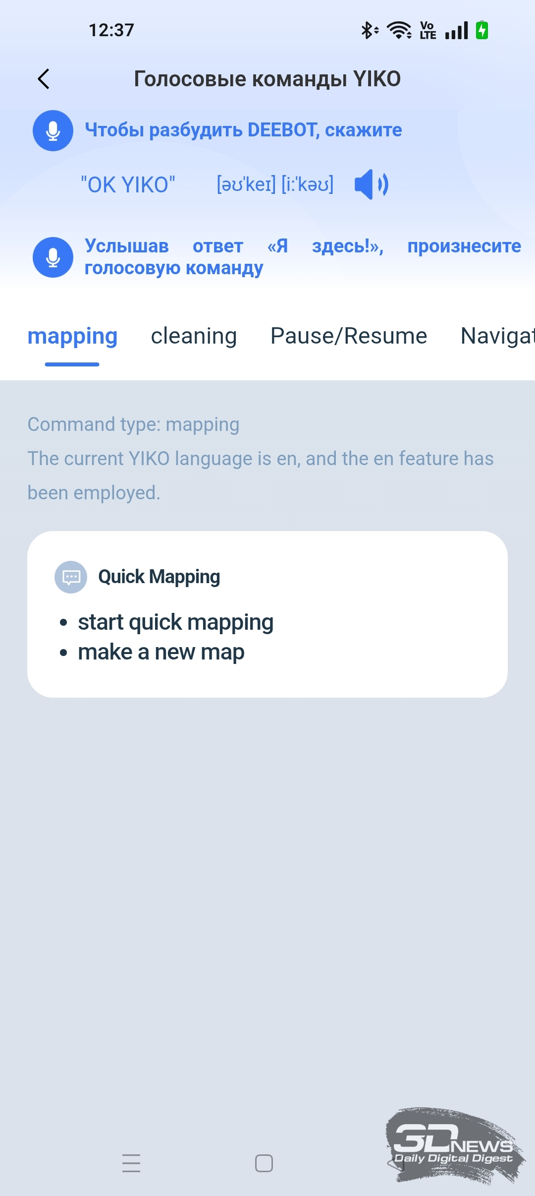 Помимо мобильного приложения, вы можете управлять роботом с помощью голосового помощника YIKO. Скажите устройству “OK, YIKO”, и оно откликнется на ваши указания. Список команд отображен в приложении в одноименном меню. Помощник понимает обращения только на английском языке. Дополнительно DEEBOT X11 OmniCyclone совместим с голосовыми сервисами от Amazon, Apple, Google и «Яндекса».