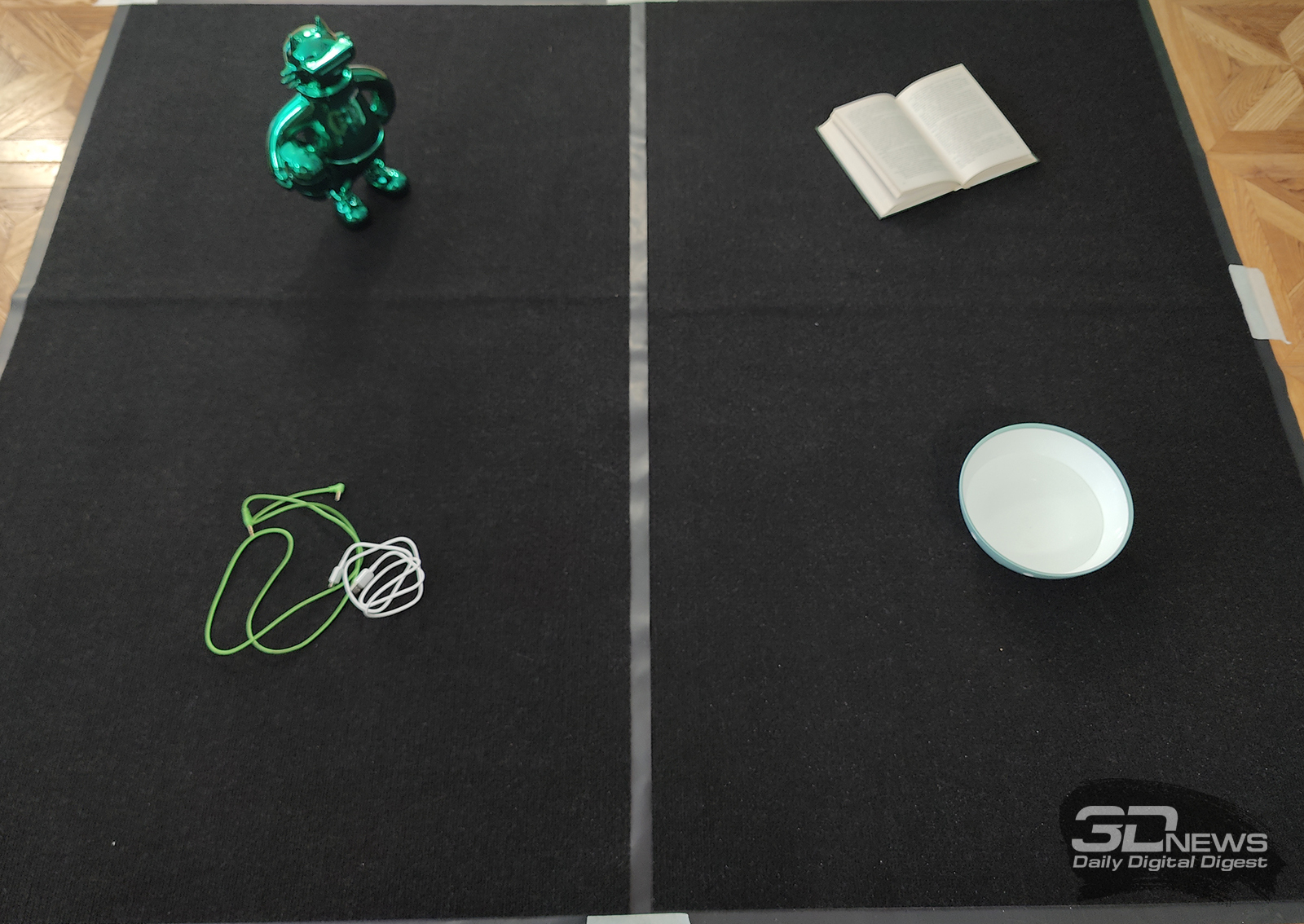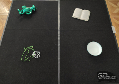Для проверки аккуратности работы устройства мы разместили на ковре четыре предмета: миниатюрную игрушку (хорошо имитирует напольную вазу), комок проводов, книгу и миску с водой. Перед запуском робот не знал о присутствии этих вещей в зоне уборки.
