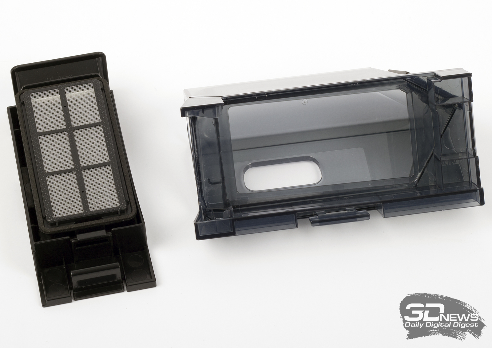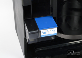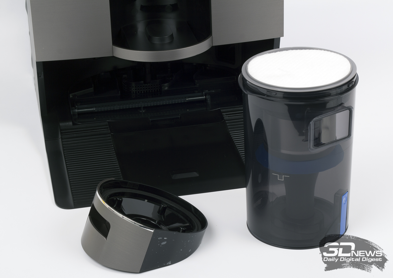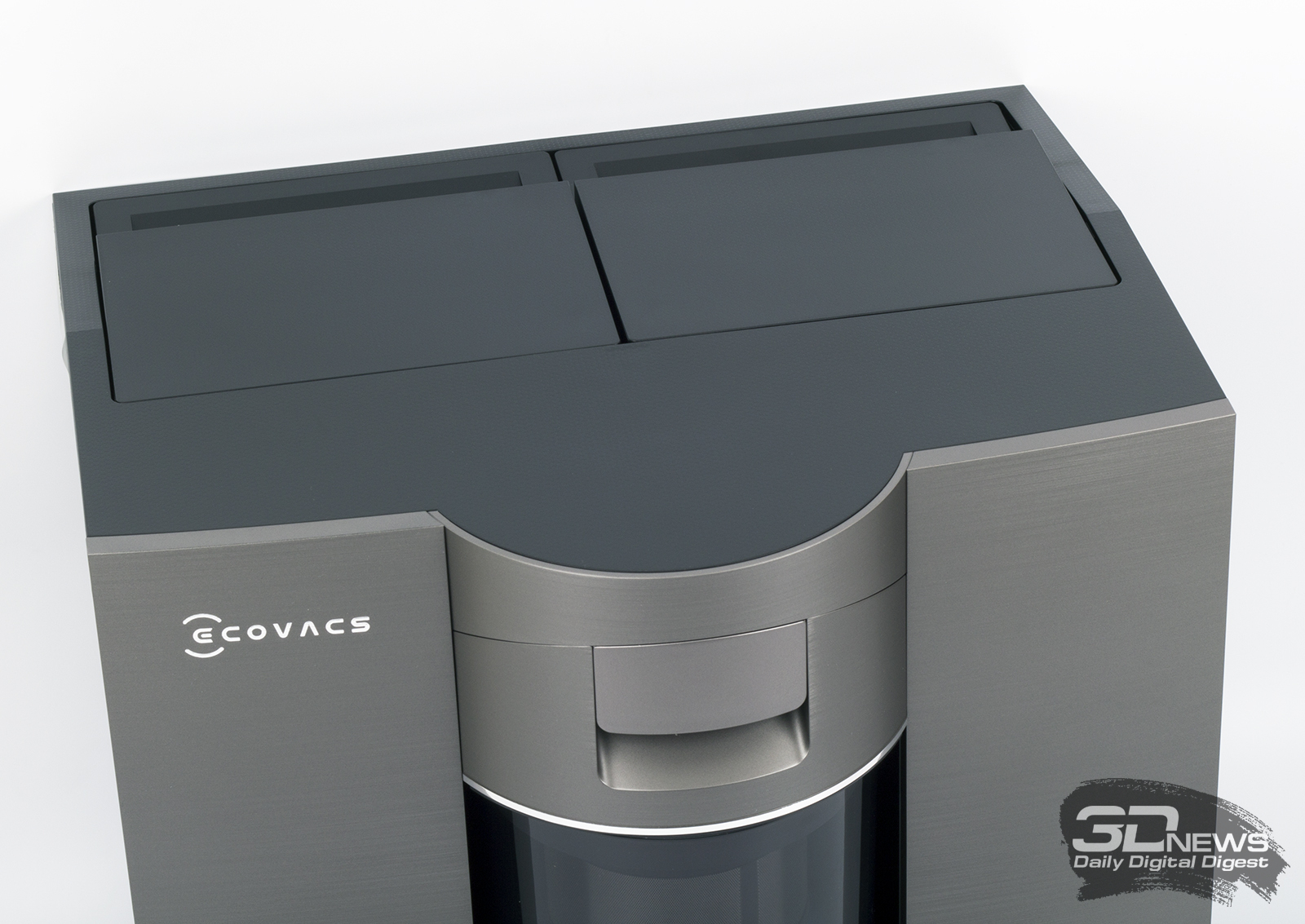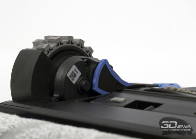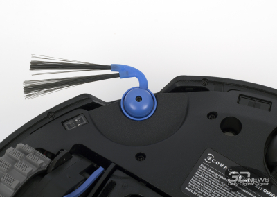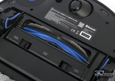 Верхняя панель робота снимается полностью. Под ней «спрятаны» рычаг включения питания устройства и кнопка соединения устройства с беспроводной сетью. Здесь же организован доступ к контейнеру — сухой мусор собирается в бак объемом 0,22 л. Конструкция — стандартная, с HEPA-фильтром и прямым пылевым трактом. Еще один контейнер у «одиннадцатого» расположен сзади: в него заливается вода.