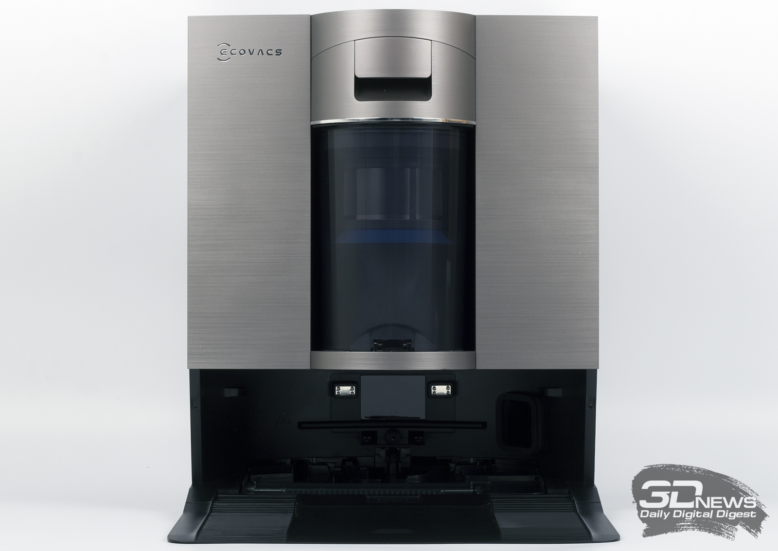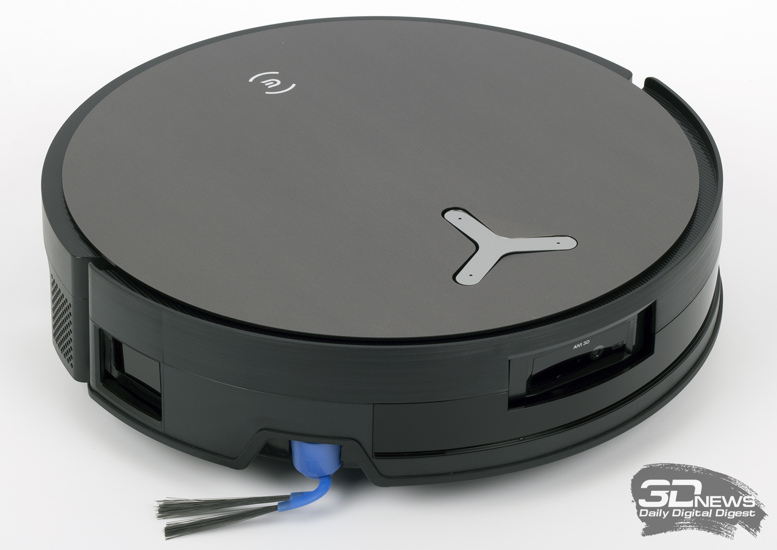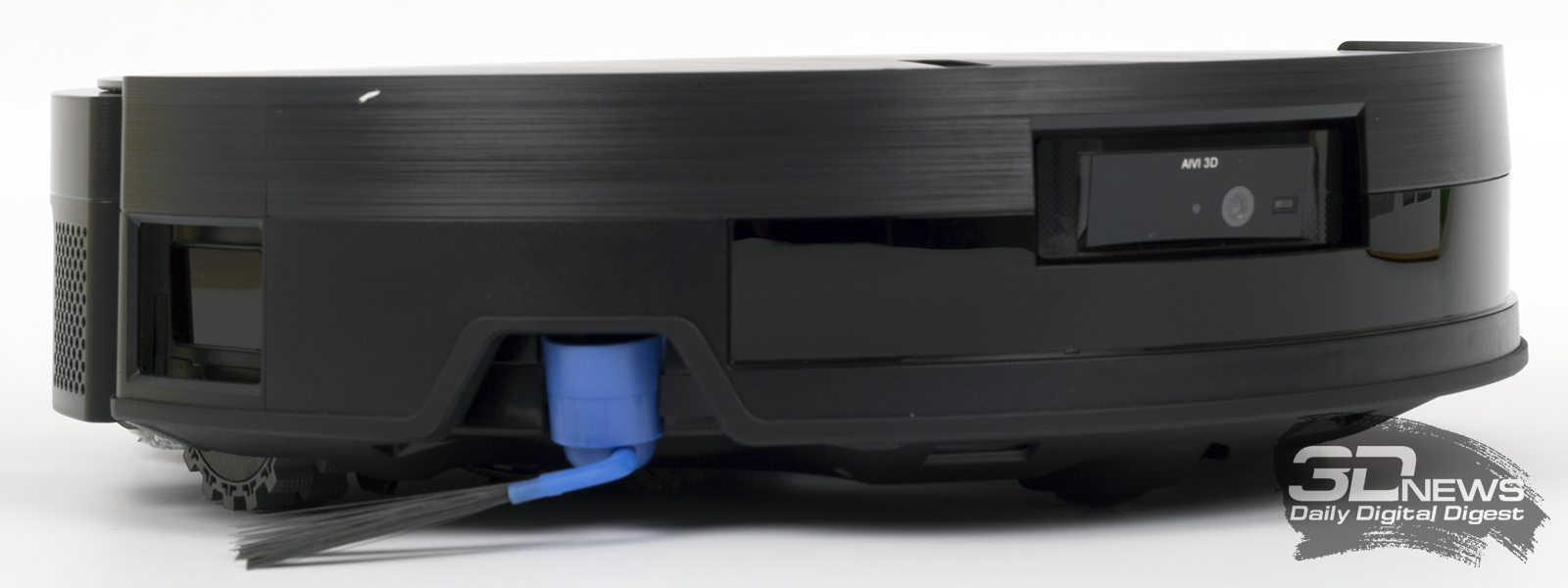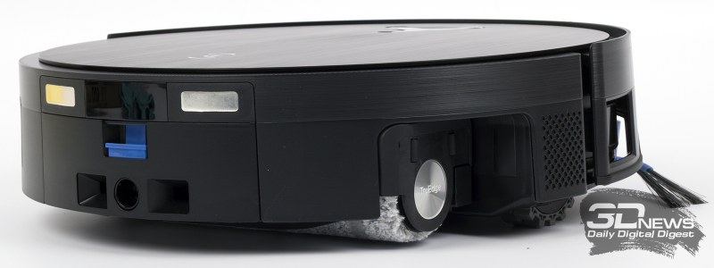 Конструкция «Дибота» — классическая цилиндрическая, хотя в глаза сразу же бросается отсутствие башни с лидаром. На самом деле он у робота есть, но расположен в передней части корпуса. Помимо него, за навигацию в устройстве отвечает камера и прочие датчики — все умные элементы в DEEBOT X11 OmniCyclone объединены в технологии AIVI 3D 3.0 Omni-Approach. На сайте производителя говорится, что герой обзора точно определяет контуры всех препятствий. Чуть забегая вперед, скажем, что это действительно так.