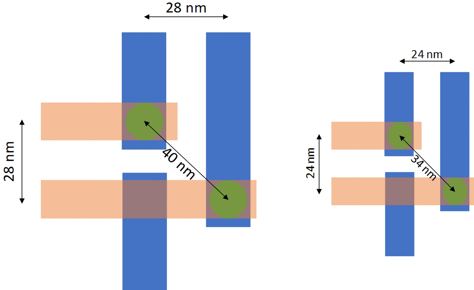 Слева: для «5-нм» техпроцесса физическое расстояние между срединными линиями соседних металлических шин составляет 28 нм, и потому, когда организуется соединение между проводниками в лежащих один над другим таких слоях, дистанция между центрами сквозных каналов достигает уже 40 нм. Справа — та же структура, но для «3-нм» техпроцесса: в одном слое расстояние между осевыми линиями проводников — 24 нм, а между центрами межслойных соединений — уже 34 нм (источник: Proc. SPIE) ⇡#Определённо лучше!Начнём всё же с обоснования перспективности: DSA заведомо выигрывает у классической EUV-литографии хотя бы по такому ключевому параметру, как средняя плотность дефектов на единицу площади изготавливаемой микросхемы. О том, почему миниатюризация технологических норм ниже порога «5 нм» провоцирует более частое появление таких дефектов, мы уже писали. Суть в том, что для успешной «засветки» фоторезиста на определённом участке нужно передать этому участку некоторое количество энергии. Чем короче длина волны излучения, падающего на фоторезист, тем каждый отдельный фотон высокоэнергичнее — и тем, соответственно, их нужно меньше для достижения необходимого эффекта. Но когда число фотонов, нужных для экспонирования участка тончайшего элемента полупроводниковой схемы, исчисляется уже буквально десятком-полутора, во всей красе проявляет себя паразитная стохастика: один-единственный сильно (но всё ещё в пределах статистической погрешности) отклонившийся от курса квант электромагнитного излучения способен исказить формируемую на подложке геометрическую структуру — и тем самым ощутимо понизить качество изготавливаемого полупроводникового наноприбора. Для техпроцесса «5 нм» стохастические эффекты EUV-процесса оборачиваются высокой вариативностью рабочих характеристик создаваемых на поверхности кремниевой заготовки транзисторов, а начиная с «3 нм» входящие не в те двери фотоны порождают сравнимые с габаритами самих этих транзисторов изъяны — разрывы токоведущих дорожек, слияния соседних контактов и т. п. В результате при серийном выпуске тех же «3-нм» микросхем до половины всех производственных дефектов порождает именно фотонная стохастика. Важно понимать, что с уменьшением характерных размеров отдельных полупроводниковых элементов роль случайных эффектов только нарастает: индетерминизм — имманентное свойство квантовых систем, и «сфокусировать» каким-то образом поток единичных почти что рентгеновских фотонов (с длиной волны 13,5 нм) так, чтобы отдельные его представители заметно не отклонялись от заданного пучку общего направления, физически невозможно. В то же время несовершенства технологии DSA — из-за которых, собственно, десять лет назад от неё и отступились как от магистрального пути развития микроэлектронных производств, — носят по большей части технический характер и потому вполне преодолимы. Более того, изживать эти недостатки возможно не в параллель с развитием классической на сегодня EUV-фотолитографии, т. е. не изыскивая на это отдельные бюджеты, а совместно с ней; применяя направляемую самосборку для коррекции тех самых неотвратимых стохастических дефектов, что становятся бичом технологических процессов вблизи маркетингового «нанометрового» порога. При таком подходе сформированные в ходе EUV-экспонирования и травления 