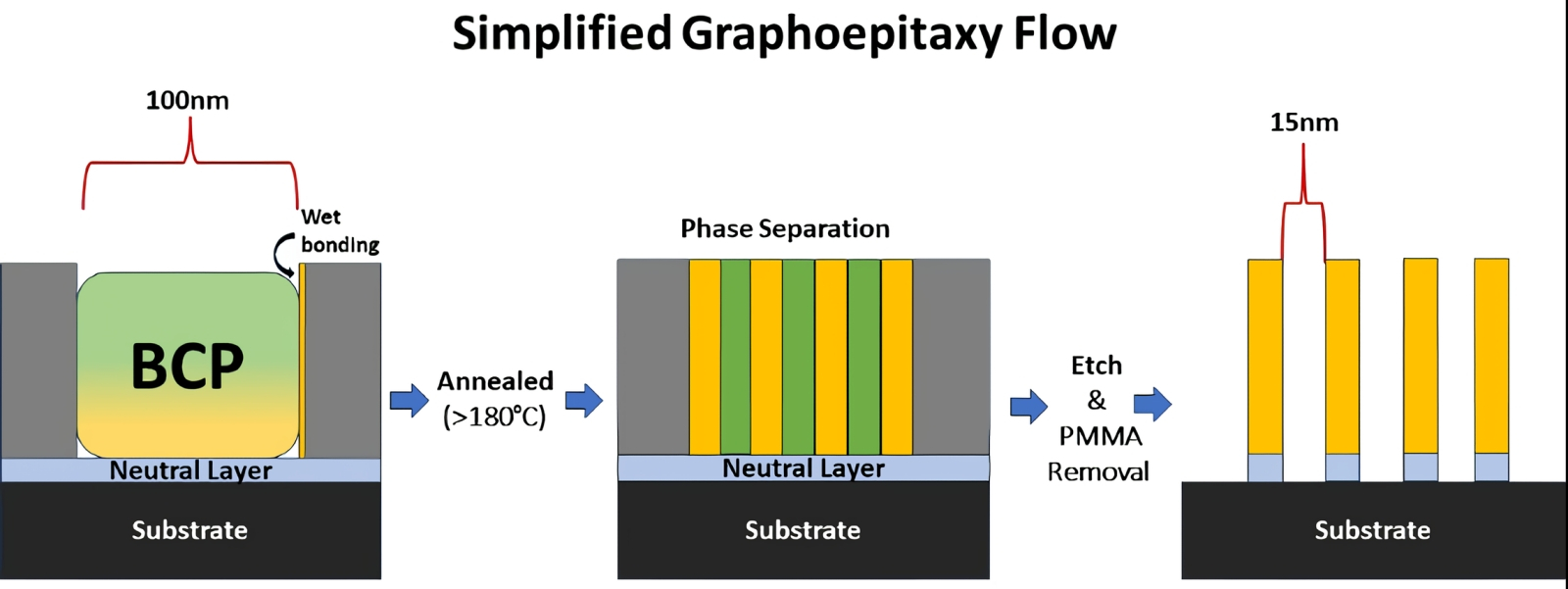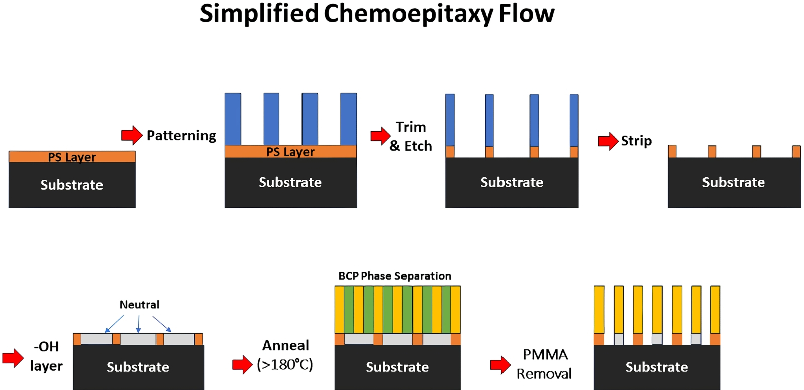 Когда больше десяти лет назад, в конце 2014-го, ведущие специалисты мира по прикладным полупроводниковым производствам из IBM, ASML, Imec, Applied Materials и прочих компаний сопоставимого уровня вели жаркие споры о том, насколько «жизнеспособна» (viable) технология EUV, только начинавшая тогда перебираться в цеха из лабораторий, среди прочих средств усовершенствовать глубокую ультрафиолетовую литографию (DUV) с длиной волны 193 нм частенько упоминали направляемую самосборку; directed self-assembly (DSA). Известны различные разновидности этого метода — с опорой в качестве основной движущей вещество силы на поверхностное натяжение разнородных жидкостей, или на силу тяжести, или на магнитные поля, — но микроэлектронщики обращали тогда основное внимание на DSA с участием особого рода полимеров. Суть в том, что на кремниевой пластине-заготовке сперва формируют достаточно крупномасштабную направляющую структуру — pre-pattern, для чего вполне годятся сравнительно недорогие и в избытке доступные на рынке DUV-установки. А затем уже на эту структуру осаждается фоторезист, содержащий блоксополимеры — цепочки макромолекул из чередующихся ковалентно связанных полимерных блоков (субцепочек мономеров) различного состава.