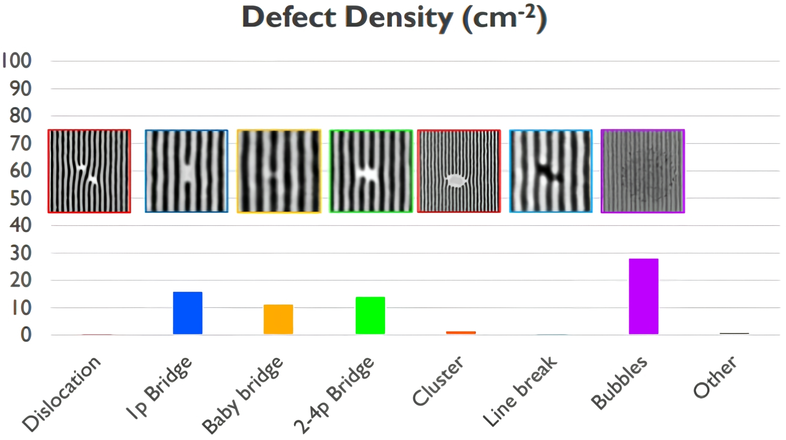 Плотность (ед./кв. см) дефектов различного типа — как именно они выглядят, поясняют картинки сверху — для DSA-процесса на «13-нм» фотолитографированной направляющей структуре (источник: Imei) На этой оптимистической ноте вернёмся к заданному в самом начале вопросу: что же мешает применять DSA как можно более широко — пусть не взамен EUV, но хотя бы в помощь тем вполне функциональным DUV-фотолитографам, что уже сегодня могли бы подключиться к выпуску так нужных рынку чипов (в особенности DRAM и NAND) по более миниатюрным производственным нормам? Увы, в полупроводниковой индустрии степень совершенства той или иной технологии обычно пропорциональна её возрасту, а DSA совсем молода: всерьёз на неё как на жизнеспособную технологию обратили внимание, напомним, лишь в начале 2000-х. Та же замечательная во всех отношениях хемоэпитаксия, например, ощутимо страдает от нехватки отлаженных способов получения необходимых ей химикатов высочайшей степени очистки; со строго постоянными для каждого участка полимерных цепей и субстратов, на которые те в итоге осаждаются, значениями поверхностной энергии. Достаточно сказать, что в микроэлектронном производстве индустриальный стандарт приемлемого технологического процесса подразумевает стабильный уровень появления дефектов на обрабатываемой заготовке менее одной единицы на 1 см². У DSA же только различных типов производственных изъянов наберётся с десяток, и для каждого из них число дефектов на квадратный сантиметр может достигать чуть ли не 30. Буквально на каждом этапе — выдерживание заданной температуры отжига, обеспечение строго заданной толщины осаждаемых на подложку тонких плёнок по всей из площади, химическая активность принимающих участие в процедуре травления веществ и проч. — этот тонкий процесс уязвим для малейших колебаний рабочих параметров, что и выражается в появлении столь значительного числа дефектов. ⇡#И всё-таки она выравниваетсяПомимо высокой пока что плотности дефектов (а исправление этой детской болезни, в отличие от квантовой стохастики высокоэнергичных EUV-фотонов, — дело наживное, как мы уже упоминали), перед DSA стоит ещё одна практическая проблема. А именно, она отлично подходит для формирования строго упорядоченных структур, будь то ровные гребёнки узких «плавников» или безупречно выстроенные в узлах квадратной решётки цилиндрические отверстия. Но логические схемы подразумевают куда более сложное взаимное расположение компонентов, когда между одной парой соседних элементов расстояние должно быть одним, а между другой — существенно иным. В этом случае DSA именно как недорогой, химический (в противоположность фотолитографическому, инженерному) способ массового изготовления миниатюрных структур откровенно пасует. Утешительно, конечно, что для чипов памяти столь высокая упорядоченность полупроводниковых компонентов, достигаемая по сути автоматически, без использования сложных приборов и установок, — настоящее спасение. Это опять-таки позволяет надеяться, что изготовители памяти DRAM, которым в любом случае придётся в ближайшие годы спешно расширять производственные мощности, не поскупятся проинвестировать в развитие столь экономичного (в перспективе, когда его доведут-таки до ума) способа продлить фактический срок эксплуатации объективно вроде бы устаревающих