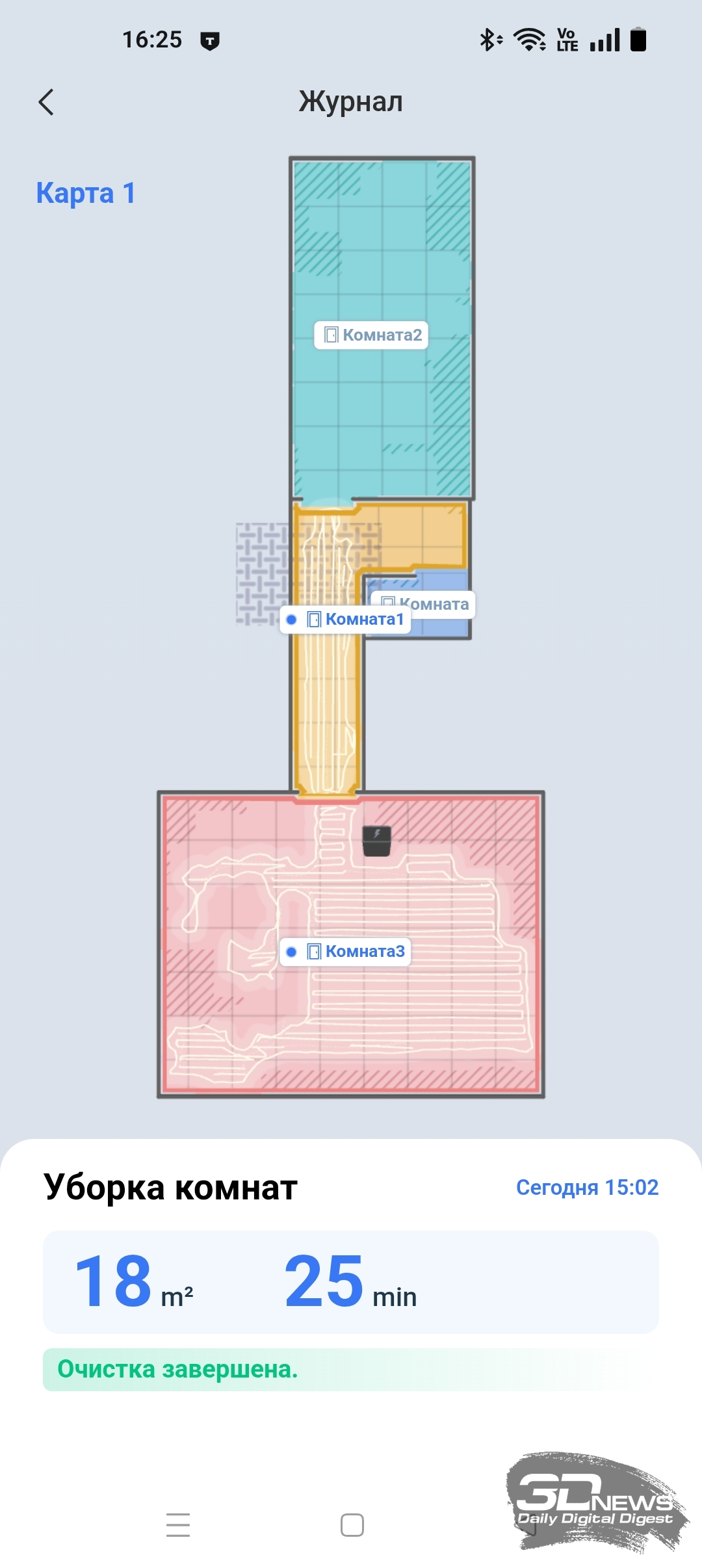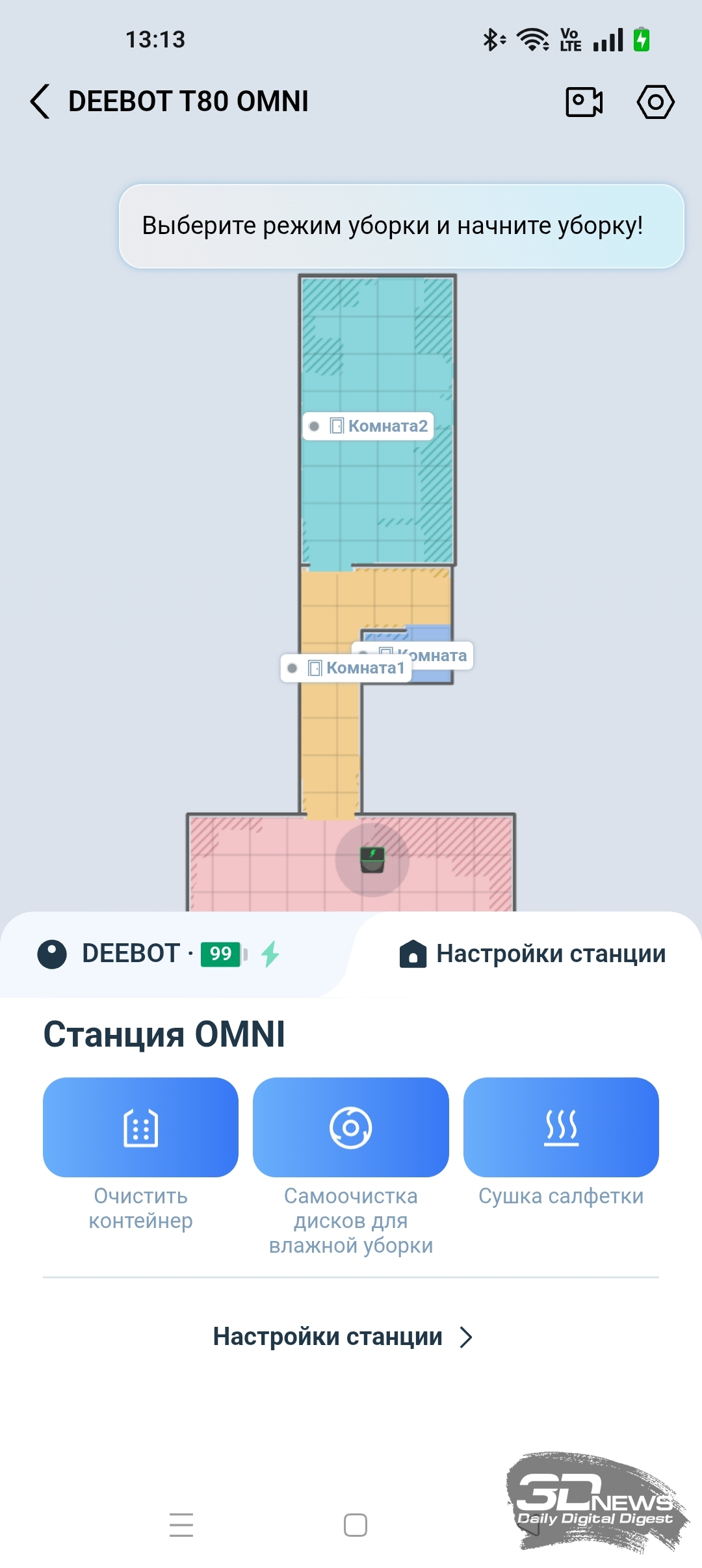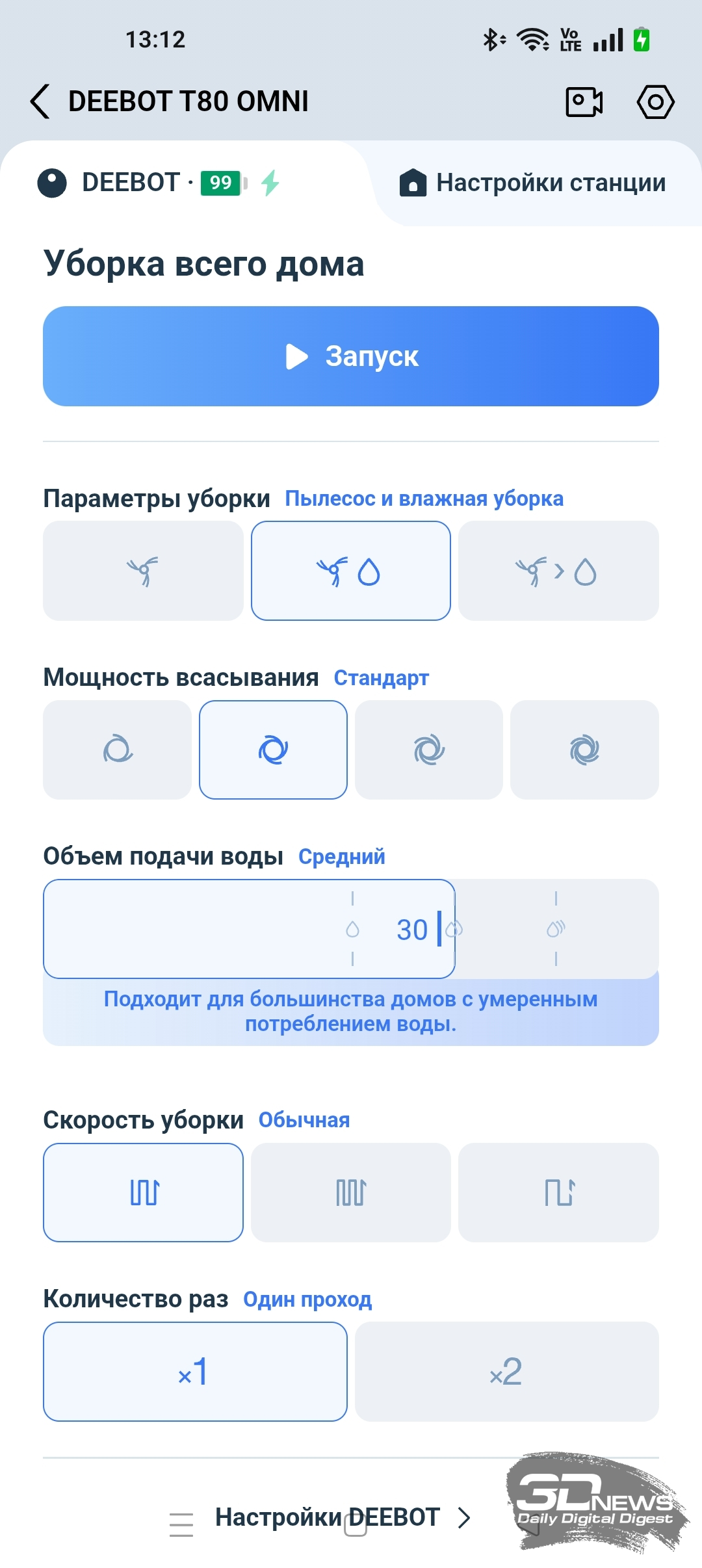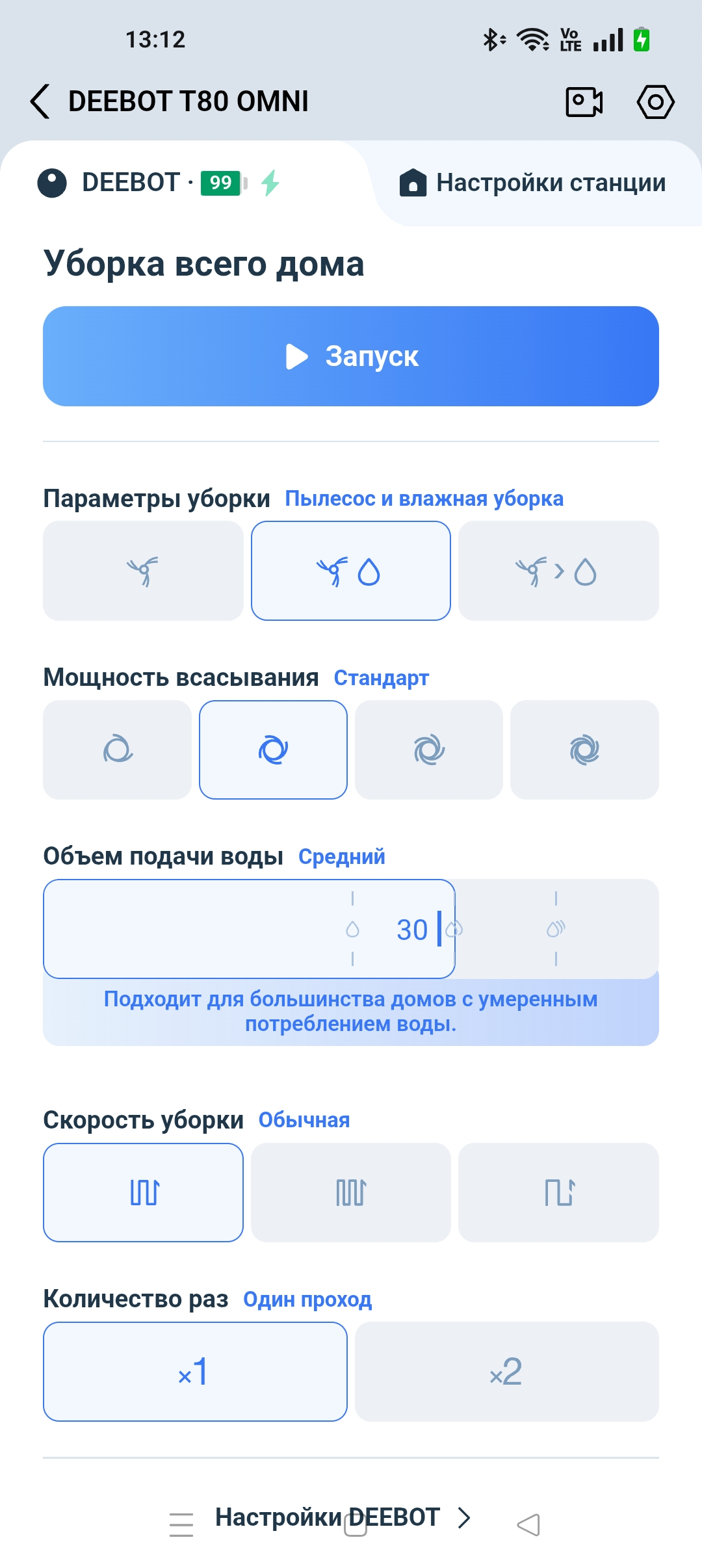 Уборка 18 м2 заняла у героя обзора 25 минут — использовался комбинированный режим «Стандарт» с обычной скоростью мойки пола и влажностью 30. За это время DEEBOT T80 OMNI потратил 13 % заряда аккумулятора.
