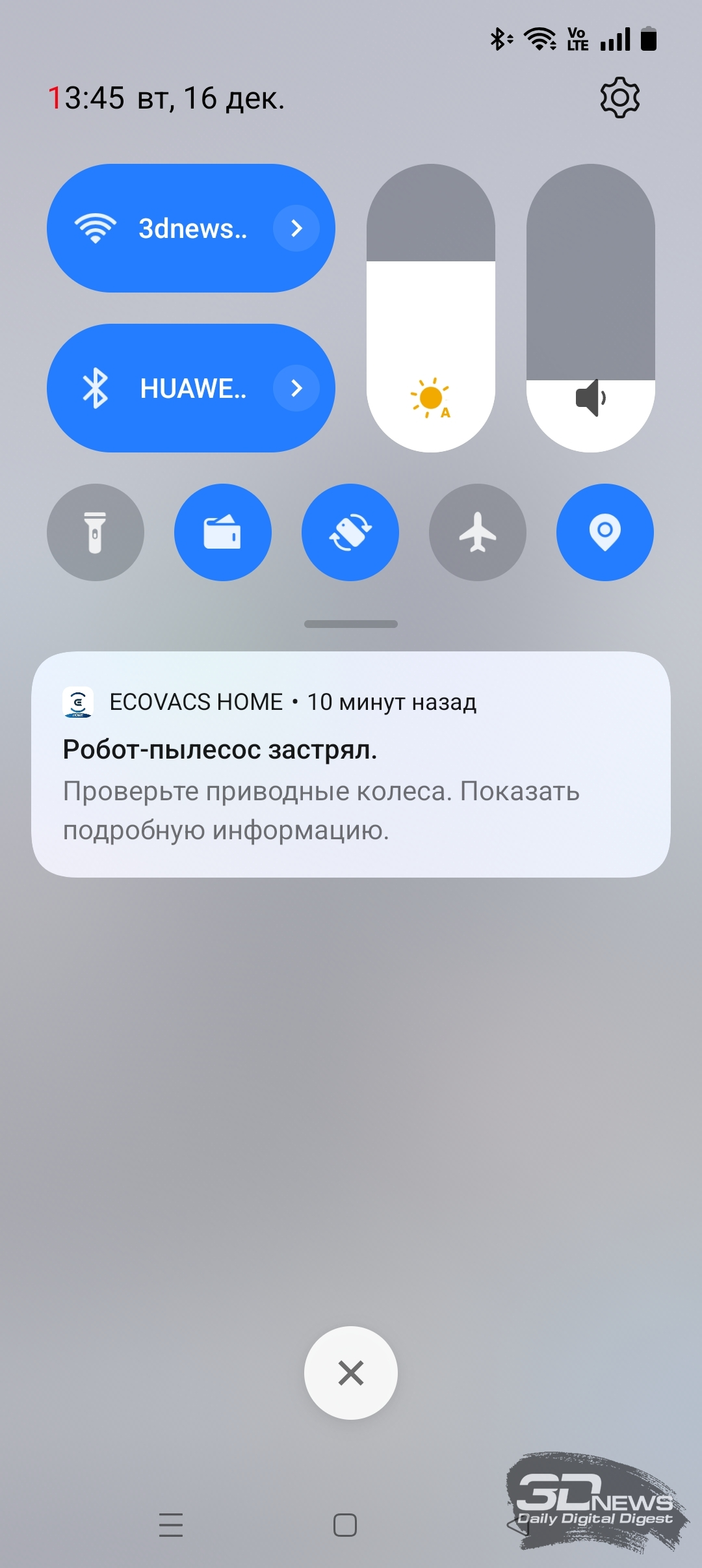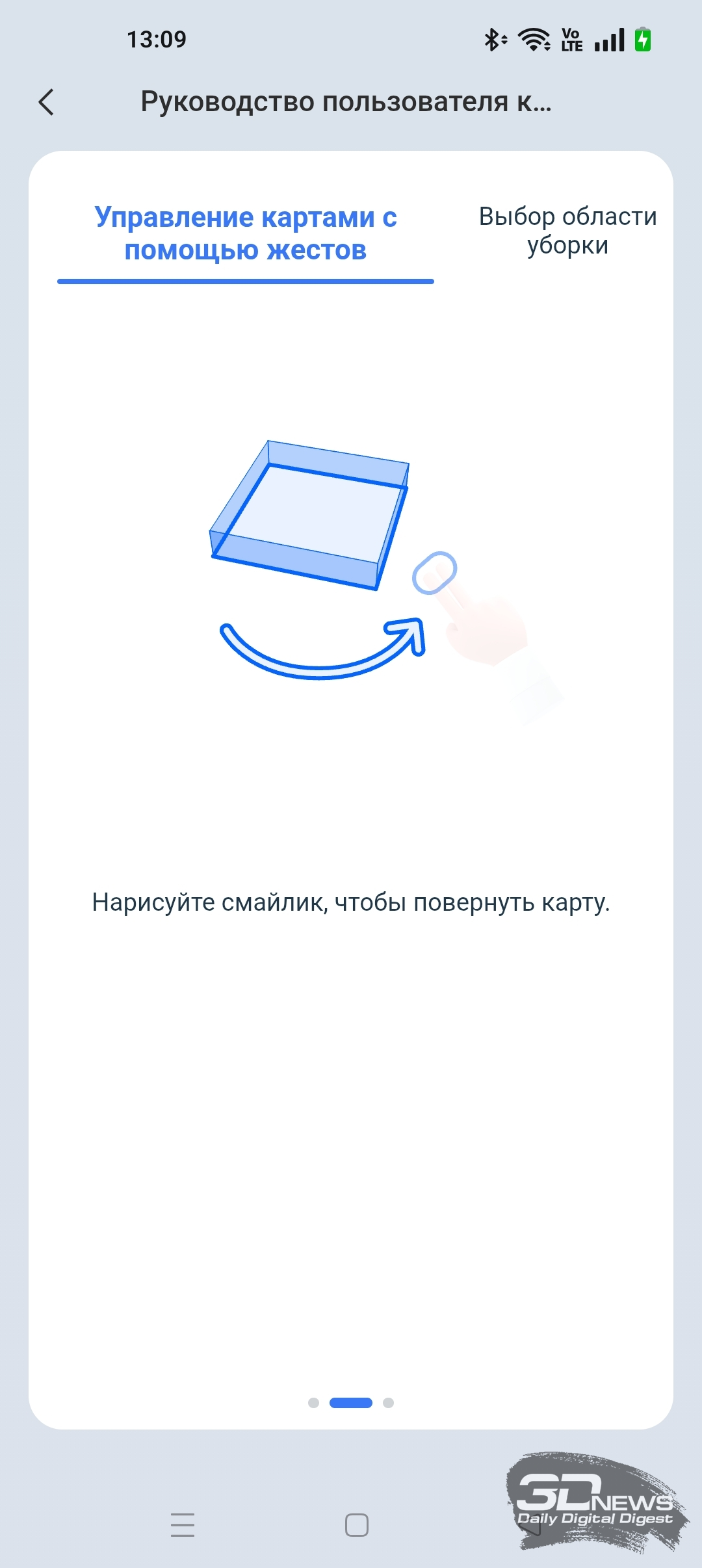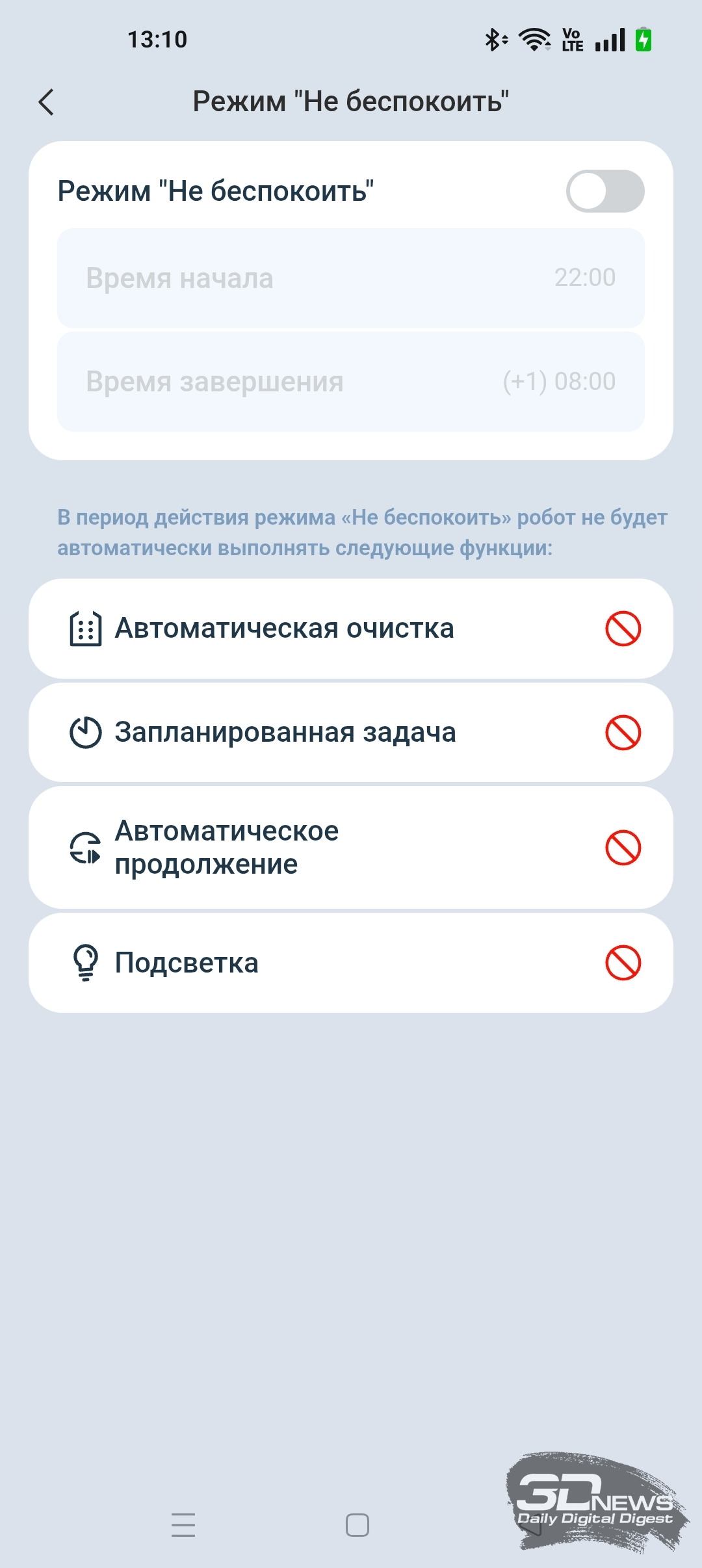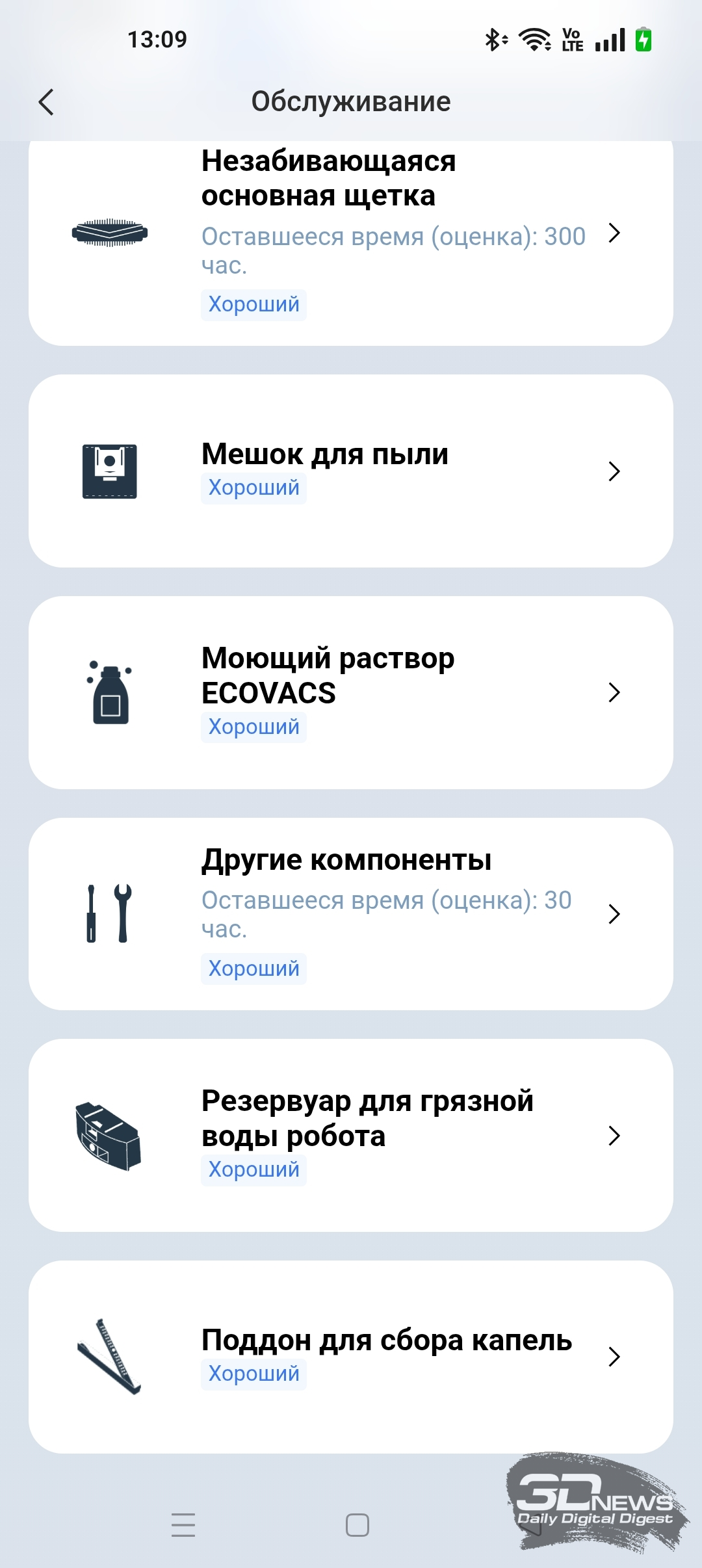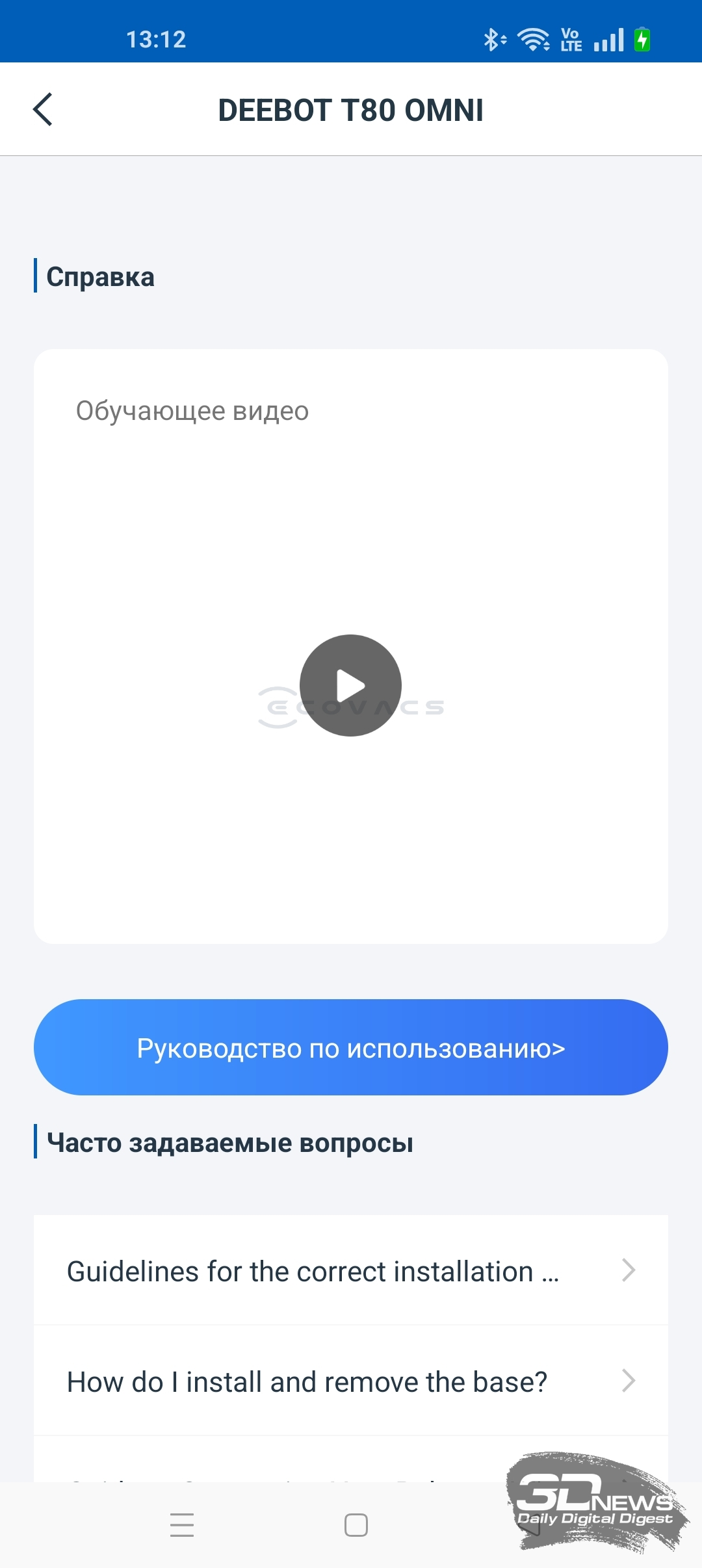 Для полноценной работы устройства необходимо установить на смартфон приложение ECOVACS HOME, доступное для операционных систем Android и iOS. Оно предоставляет пользователю настройки по управлению как роботом-уборщиком, так и станцией самоочистки. Утилита полностью переведена на русский язык и обладает большим числом подсказок. Подключение робота к домашней Wi-Fi-сети с общим SSID точек доступа 2,4 и 5 ГГц и комбинированной защитой WPA2/WPA3 не вызвало никаких проблем, а модель устройства определилась по QR-коду. Вся процедура заняла одну-две минуты от силы — необходимы регистрация в приложении и доступ в интернет.