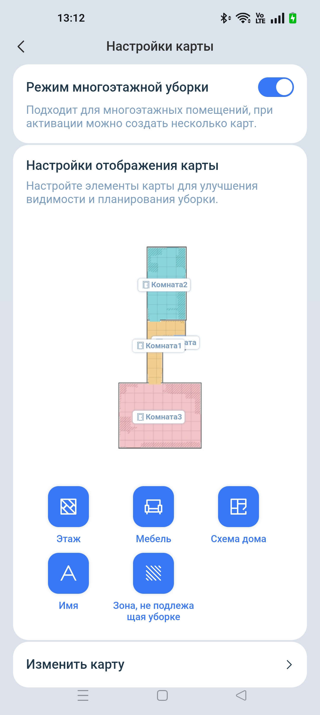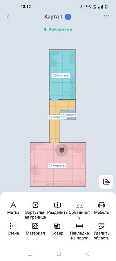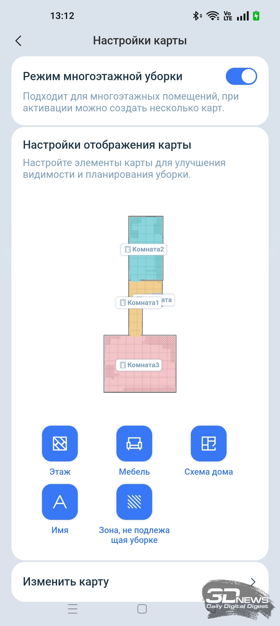 Свою бурную деятельность, после подключения устройства к мобильному приложению и обновления прошивки, DEEBOT T80 OMNI начал с ознакомительного рейса по помещению с целью его сканирования. На создание карты ушло чуть больше четырех минут. Мобильное приложение ECOVACS HOME автоматически разбило помещение на комнаты и, помимо стен офиса, схематично отобразило все обнаруженные на пути препятствия — в основном мебель. Программа позволяет настроить 2D- и 3D-отображение карт. Мы можем самостоятельно отредактировать ее, ECOVACS HOME позволяет: