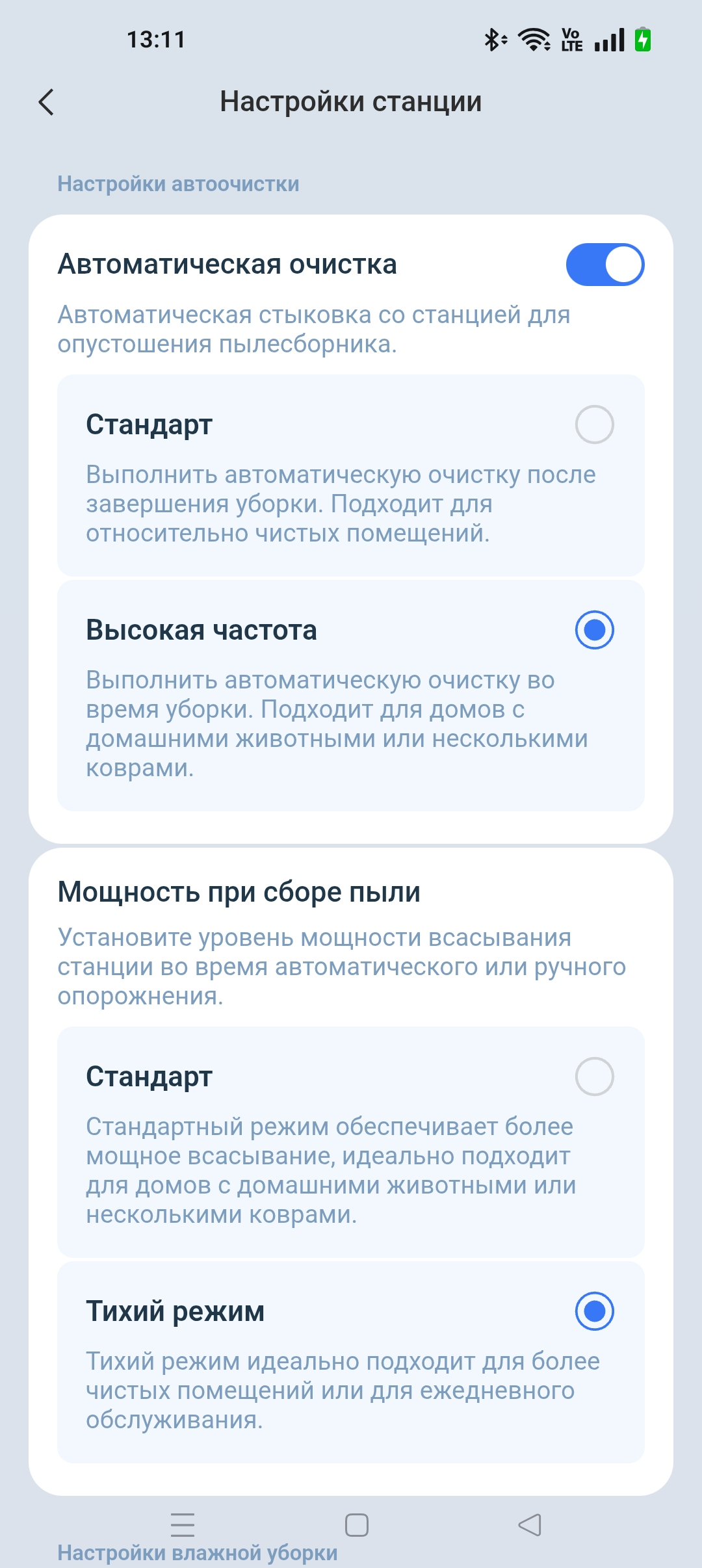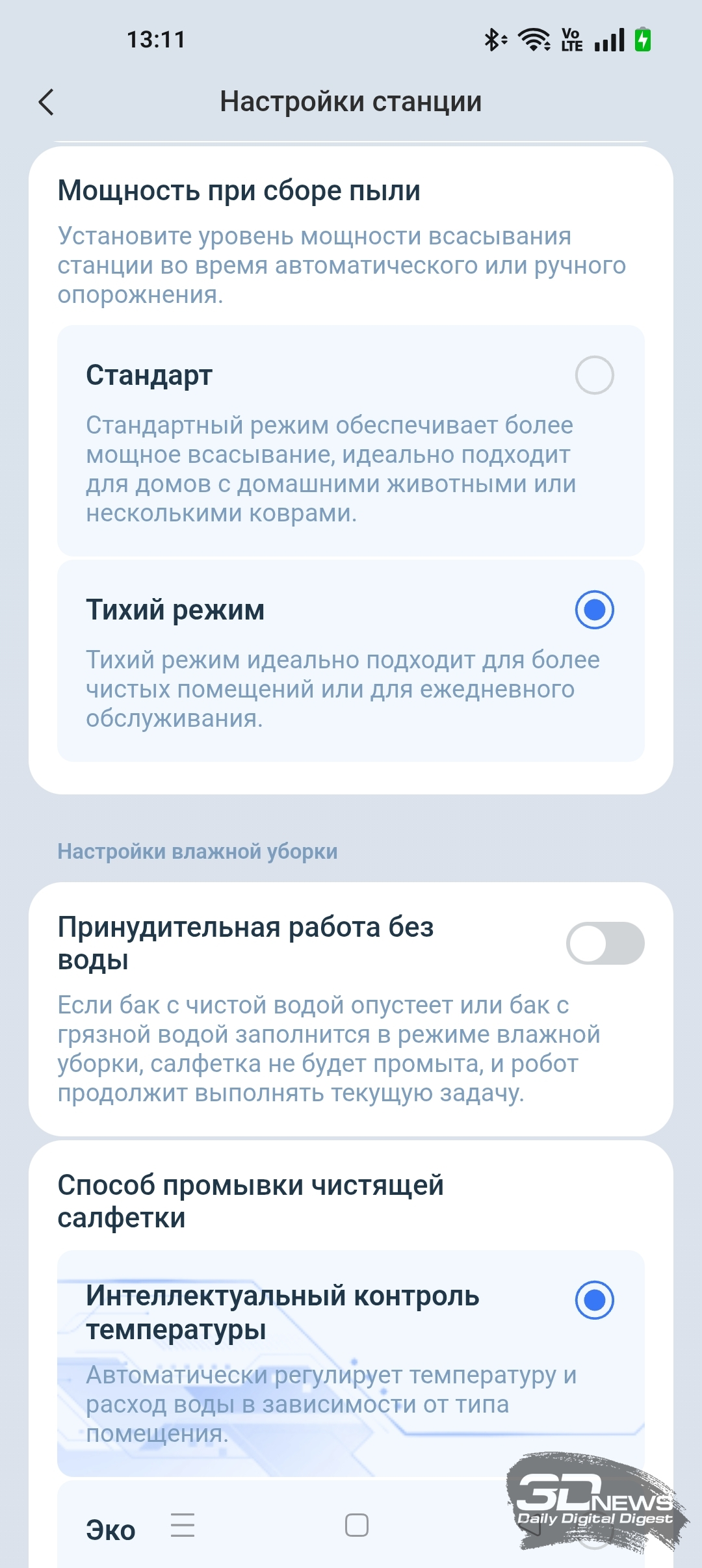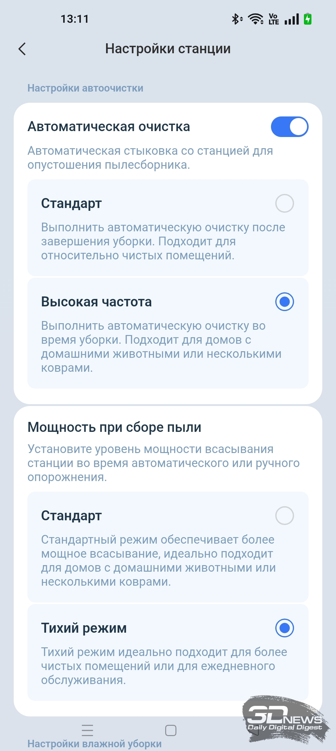 Как уже было сказано, функциональность DEEBOT T80 OMNI в плане уборки практически полностью повторяет возможности ранее протестированной модели DEEBOT X11 OmniCyclone. Настройки сухой, влажной и комбинированной уборки — те же. Так, пользователю доступны четыре режима мощности: «Тихий» (61 дБА), «Стандарт» (61 дБА), «Средняя» (73 дБА) и «Максимум» (85 дБА). В скобках указаны характеристики, измеренные вручную. Работу «Дибота» в первых двух режимах можно назвать условно комфортной. Ни разу не тихо, но терпимо. При активации режимов «Средняя» и «Максимум» DEEBOT T80 OMNI функционирует заметно громче. Думаем, не всем членам семьи будет комфортно заниматься своими повседневными делами (учиться, работать, отдыхать и т.д.), находясь вблизи «Дибота». Сбор мусора док-станцией осуществляется с шумом в 68 дБА — опять же терпимо. Мойка и сушка роликовой швабры дискомфорта не вызывают.