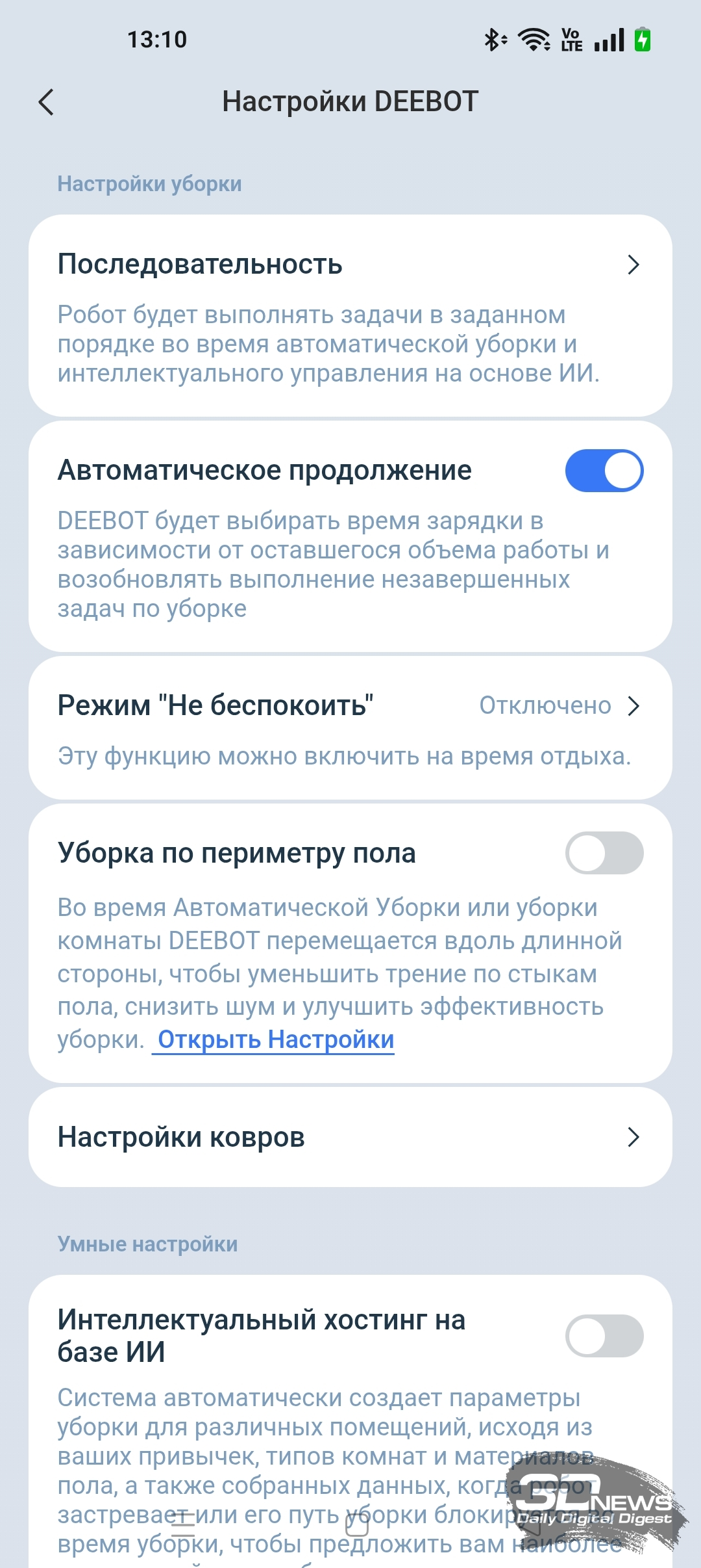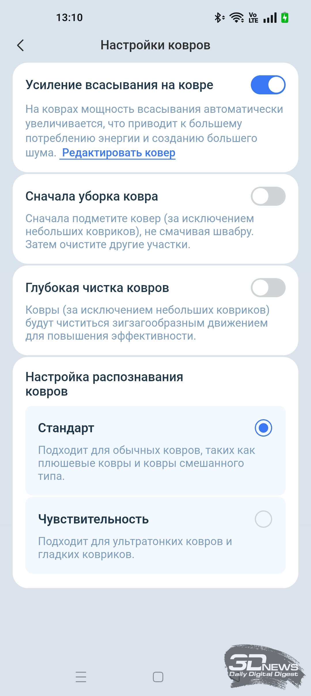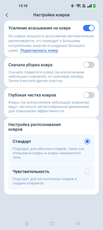На скриншотах ниже указаны прочие настройки DEEBOT T80 OMNI по уборке ковровых поверхностей.