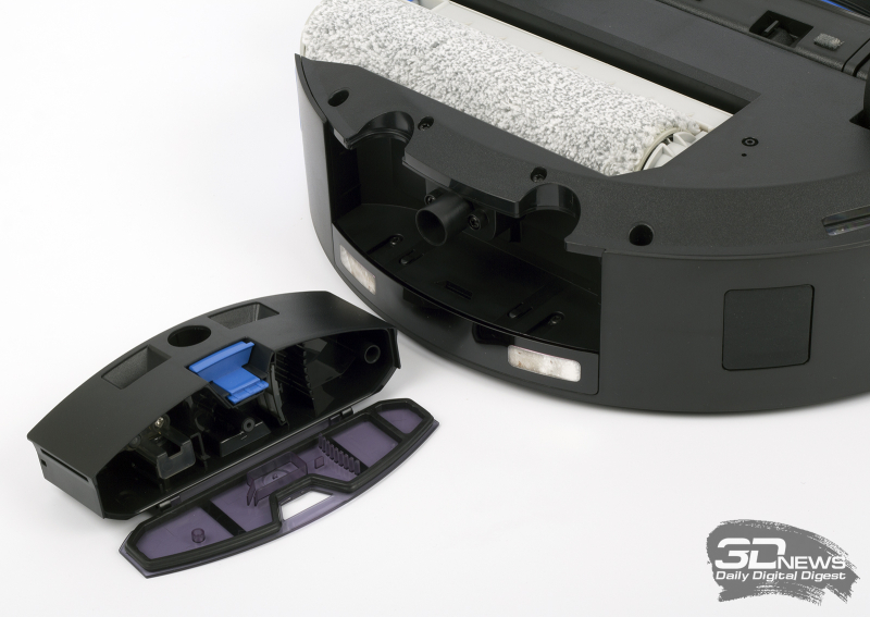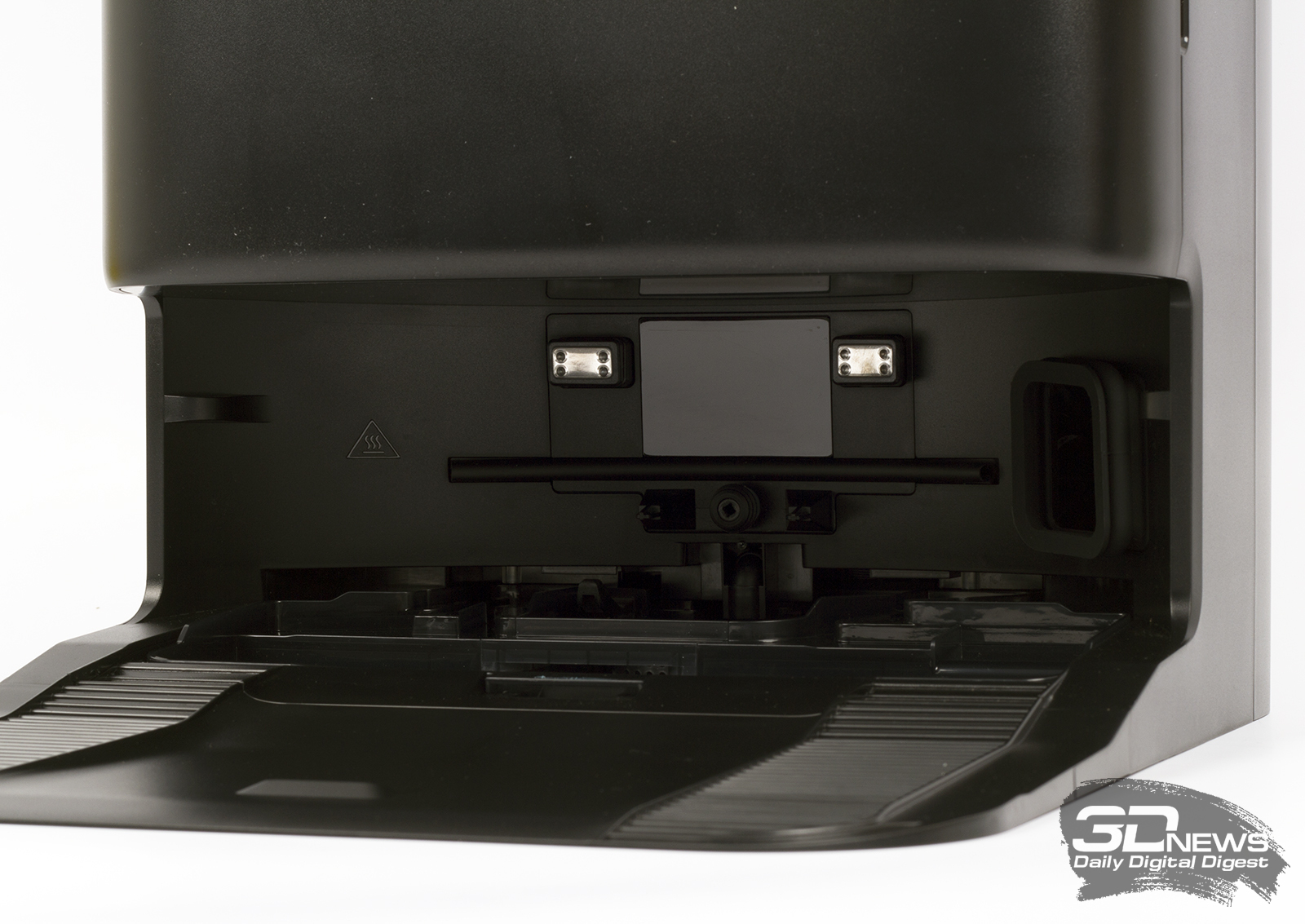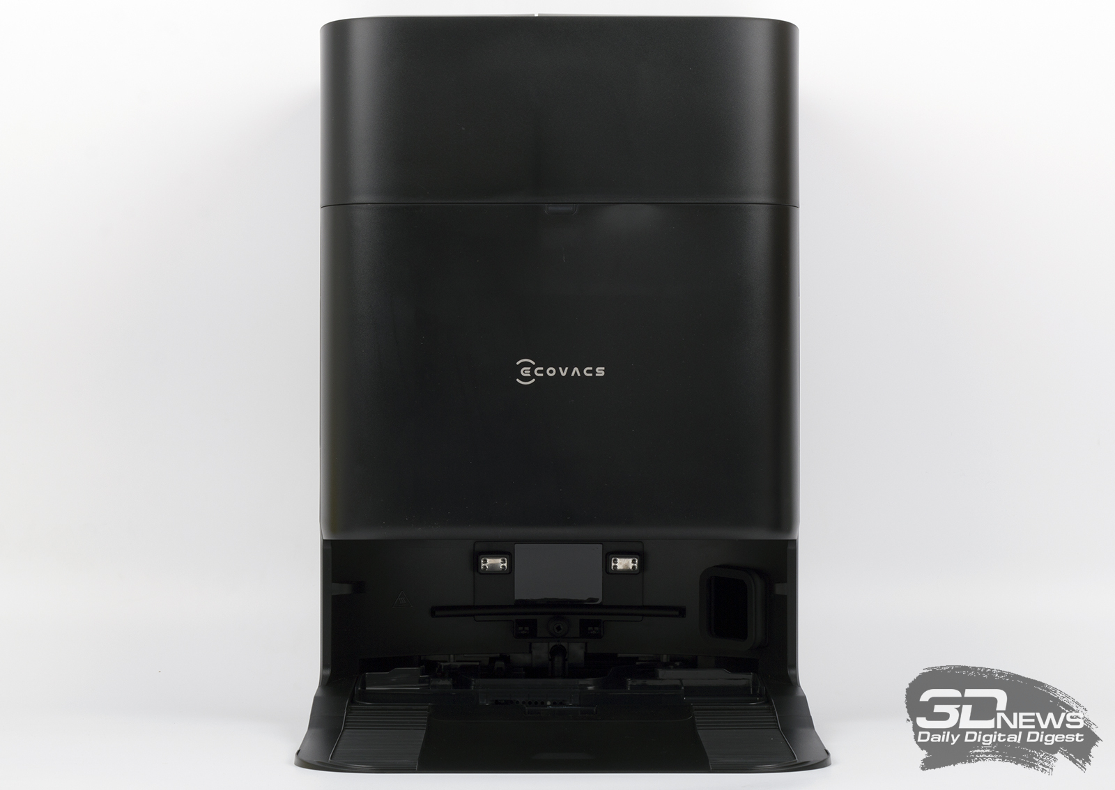В комплекте с роботом идет массивная док-станция. Она имеет классическую конструкцию, позволяющую как можно реже заниматься обслуживанием уборщика. В верхней нише установлены баки для чистой и отработанной воды. Интересно, что объем контейнера для сбора грязной жидкости оказался заметно меньше. В полости посередине, под крышкой, спрятан нетканый одноразовый мешок для сбора сухого мусора. Наконец, в нижней части станции самоочистки паркуется непосредственно сам робот. Здесь он заряжается, сбрасывает сухой мусор и чистит роликовую швабру. Мойка салфетки осуществляется при температуре в диапазоне от 40 до 75 градусов Цельсия. Последующая сушка производится при 45 градусах Цельсия. Как утверждает производитель, лоток для чистки швабры обслуживается один-два раза в год, не чаще.