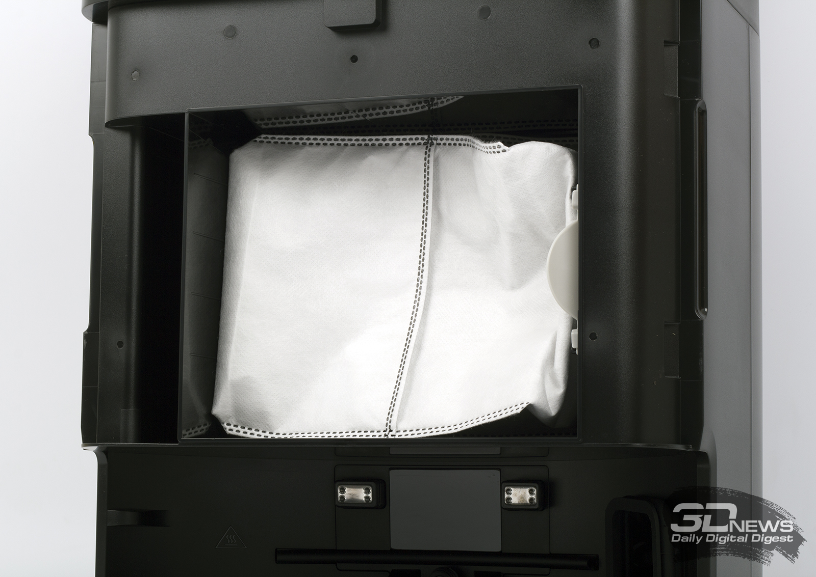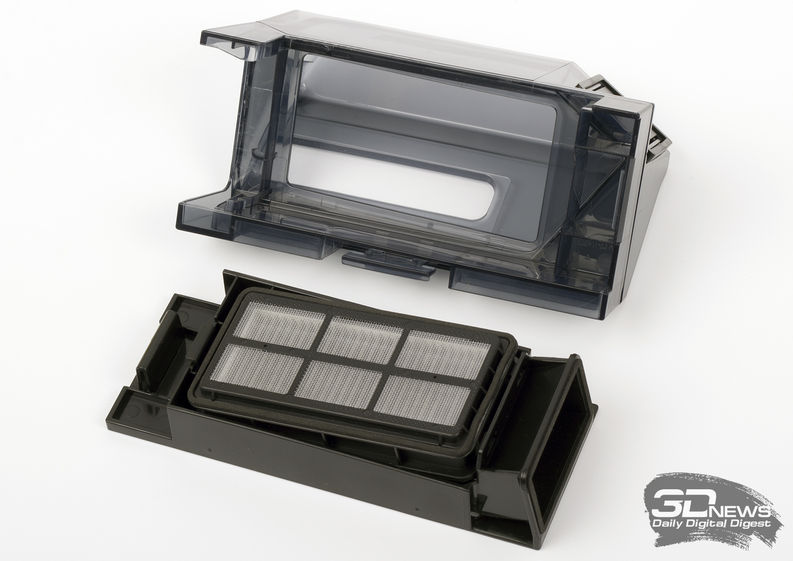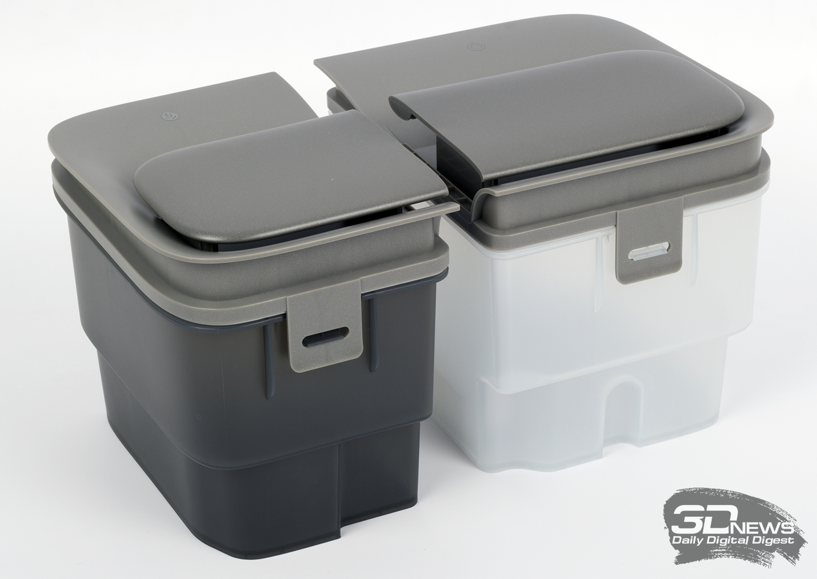 В комплекте с роботом идет массивная док-станция. Она имеет классическую конструкцию, позволяющую как можно реже заниматься обслуживанием уборщика. В верхней нише установлены баки для чистой и отработанной воды. Интересно, что объем контейнера для сбора грязной жидкости оказался заметно меньше. В полости посередине, под крышкой, спрятан нетканый одноразовый мешок для сбора сухого мусора. Наконец, в нижней части станции самоочистки паркуется непосредственно сам робот. Здесь он заряжается, сбрасывает сухой мусор и чистит роликовую швабру. Мойка салфетки осуществляется при температуре в диапазоне от 40 до 75 градусов Цельсия. Последующая сушка производится при 45 градусах Цельсия. Как утверждает производитель, лоток для чистки швабры обслуживается один-два раза в год, не чаще.