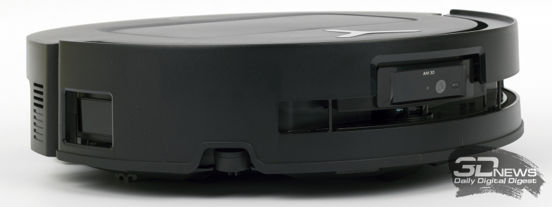 Верхняя панель устройства оснащена съемным люком. Под ним расположен рычажок включения питания робота, клавиша соединения уборщика с беспроводной сетью и контейнер для сбора сухого мусора. Объем у него стандартный — чуть больше 200 мл. Система сбора пыли оснащена прямым трактом, поэтому обслуживать «Дибот» будет несложно. Как и положено, контейнер оснащен HEPA-фильтром — в этом направлении инноваций не намечено.