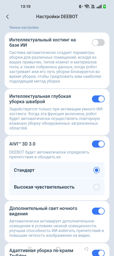 Повторимся, ранее мы протестировали модель DEEBOT X11 OmniCyclone. «Восьмидесятый» обладает схожей функциональностью. Так, оба уборщика поддерживают интеллектуальный хостинг на базе ИИ. При его включении система автоматически создает параметры уборки для различных помещений, исходя из ваших привычек, типов комнат и покрытия пола. Среди экспериментальных функций значатся: