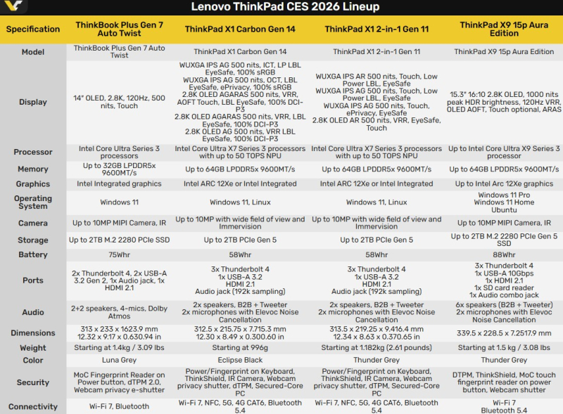 Ноутбук предложит процессоры серии Intel Core Ultra Series 3, 14-дюймовый сенсорный OLED-экран с разрешением 2,8K, до 32 Гбайт ОЗУ LPDDR5X-9600, а также батарею ёмкостью 75 Вт·ч. Кроме того, он оснащён фронтальными динамиками с поддержкой Dolby Atmos, которые вращаются вместе с экраном. Более подробно о характеристиках ожидаемых ноутбуков Lenovo можно узнать из таблицы ниже.