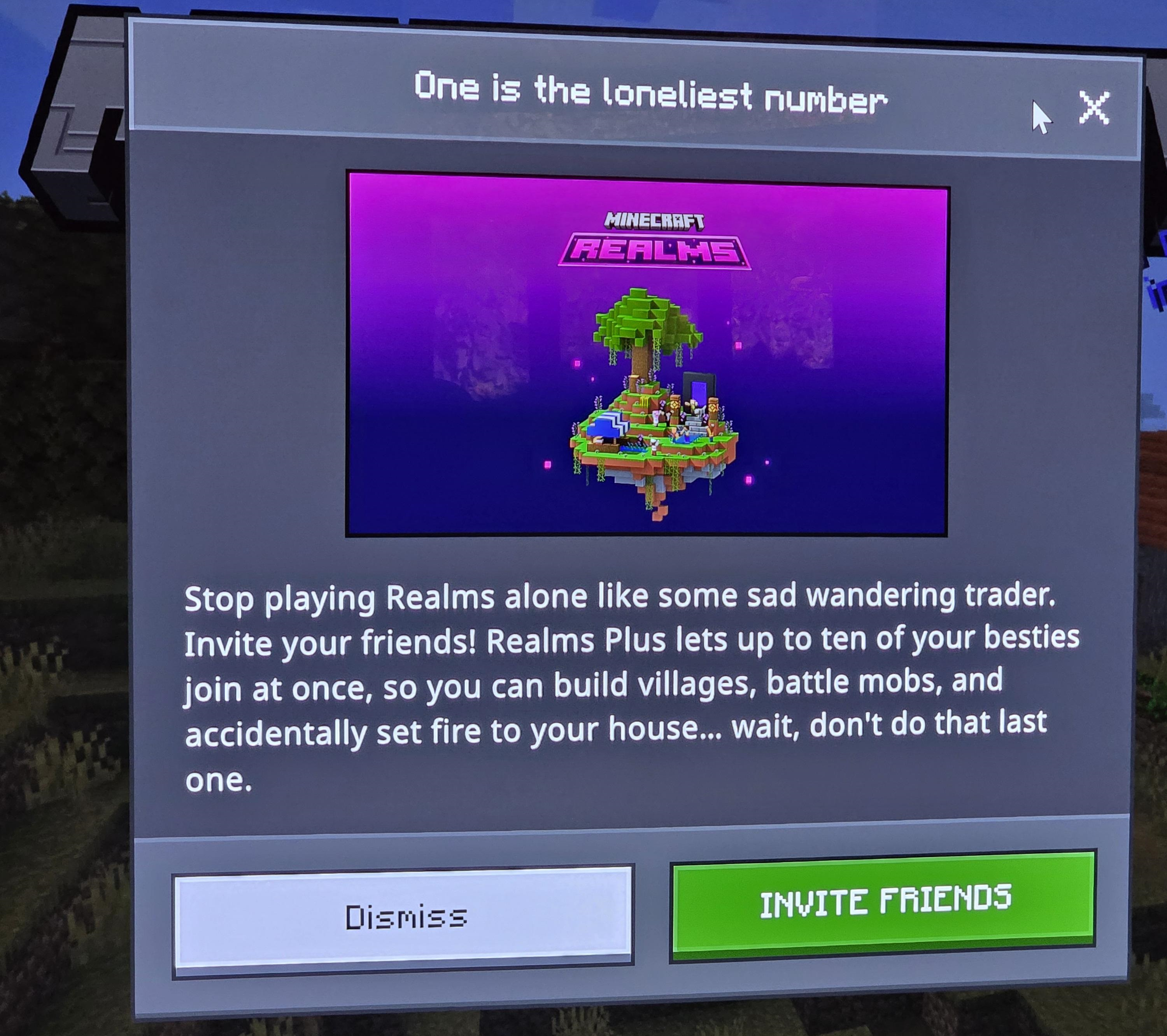 Участник Cautious-Surround340 с форума Reddit обратил внимание на всплывающее окно с рекламой мультиплеерной подписки Realms (конкретно Realms Plus) — частных облачных серверов, которые позволяют играть в Minecraft с друзьями.