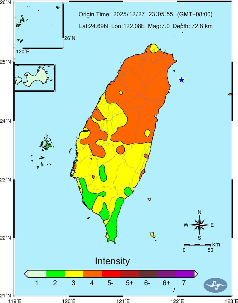 Карта интенсивности землетрясения на Тайване 27 декабря. Источник изображения: Центральное метеорологическое управление Тайваня