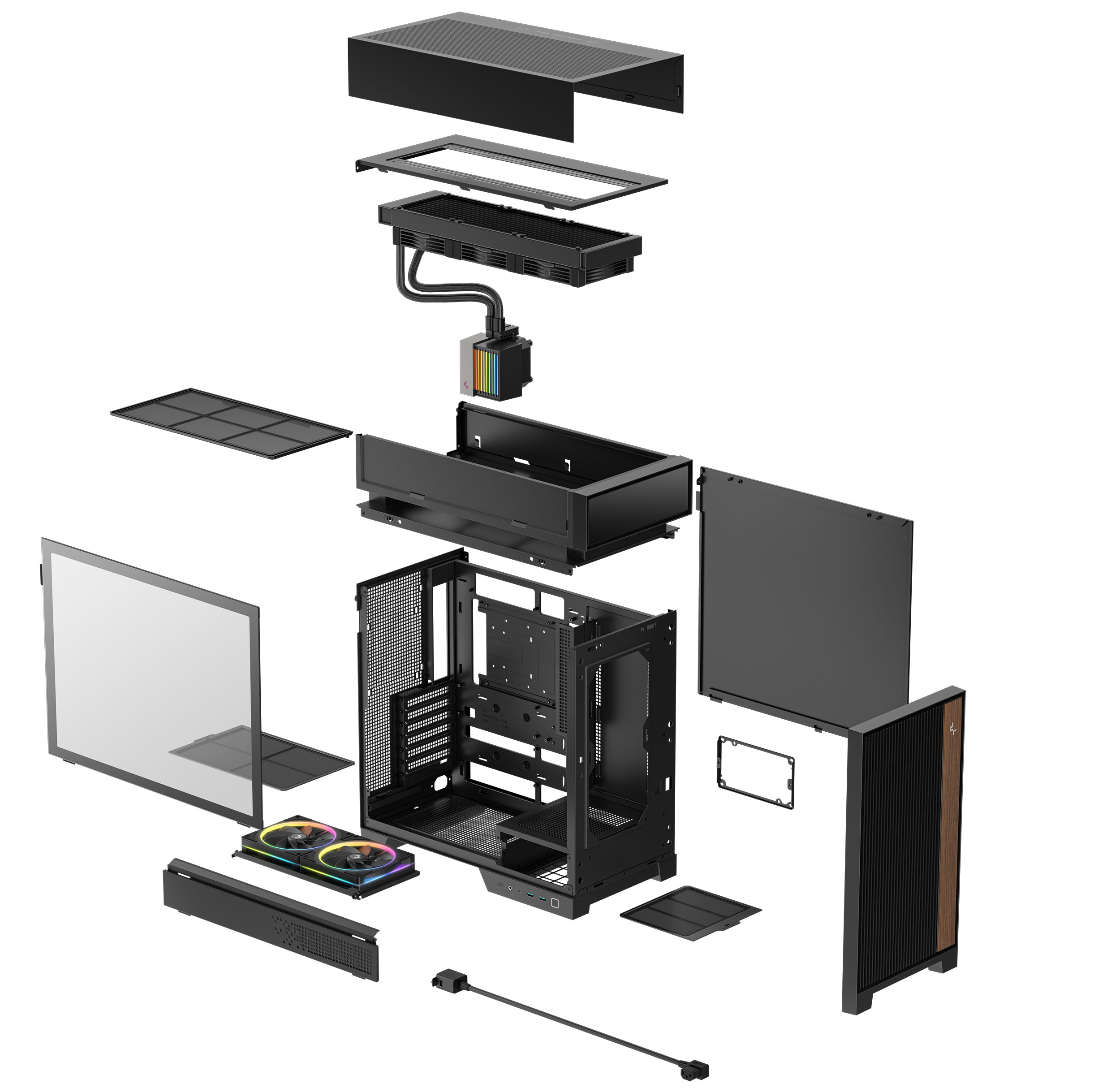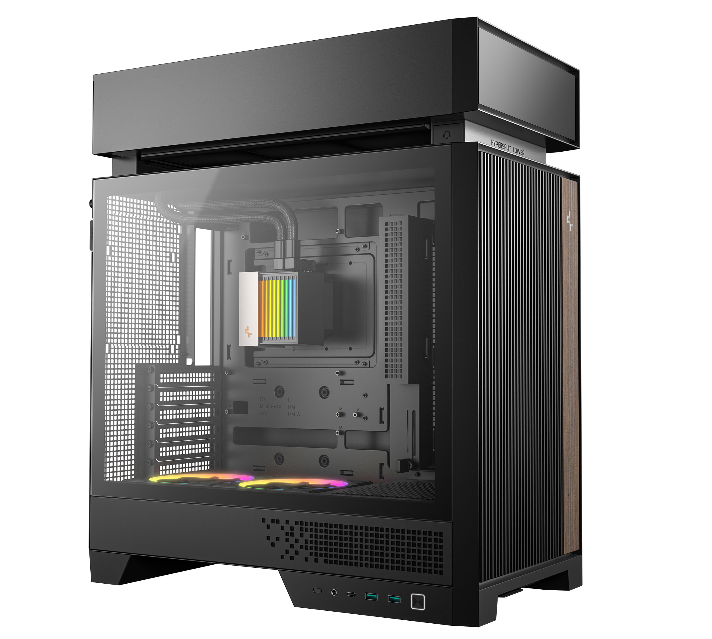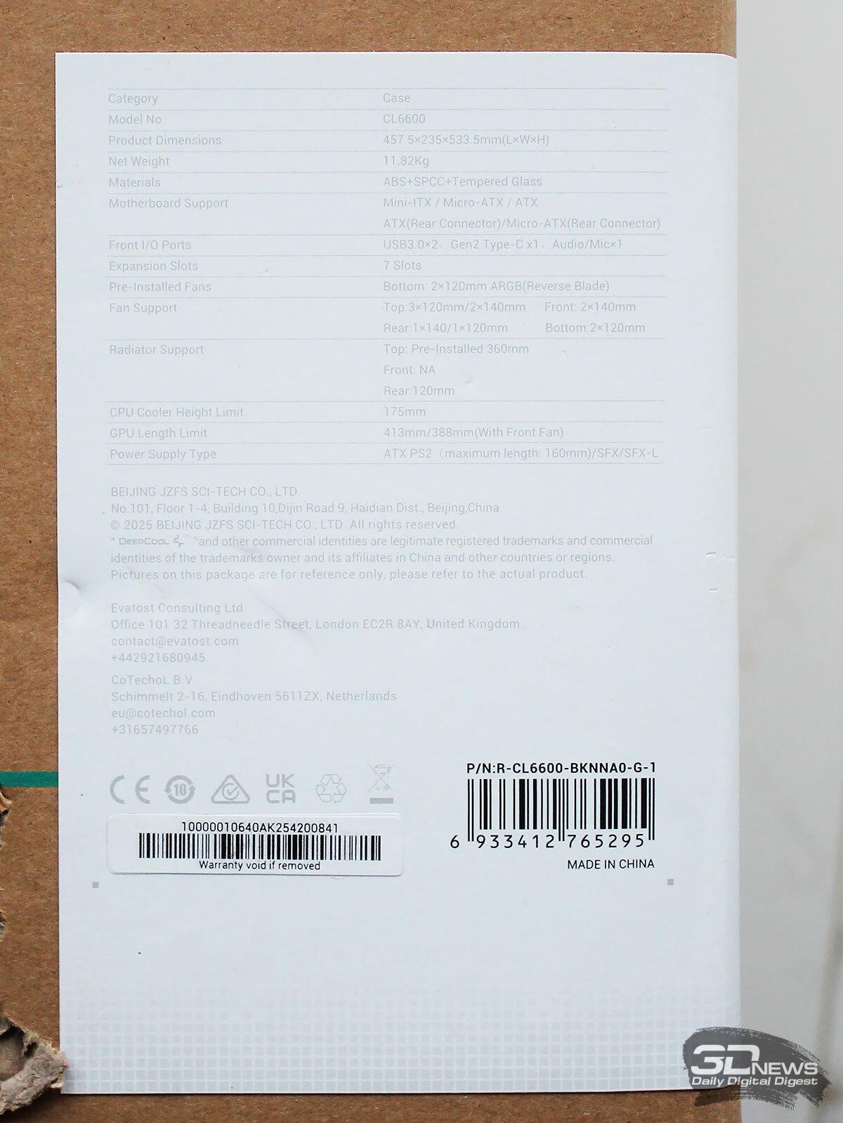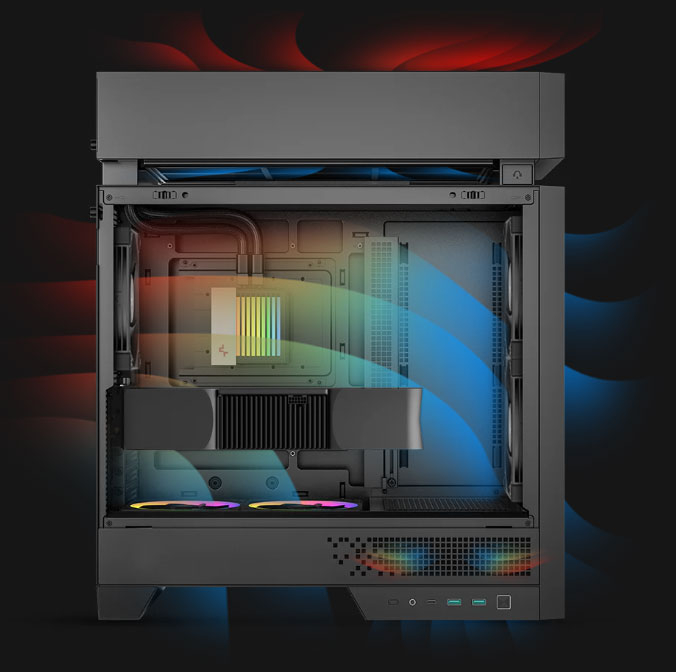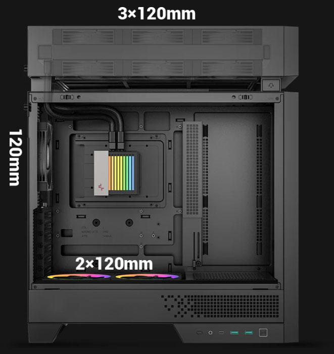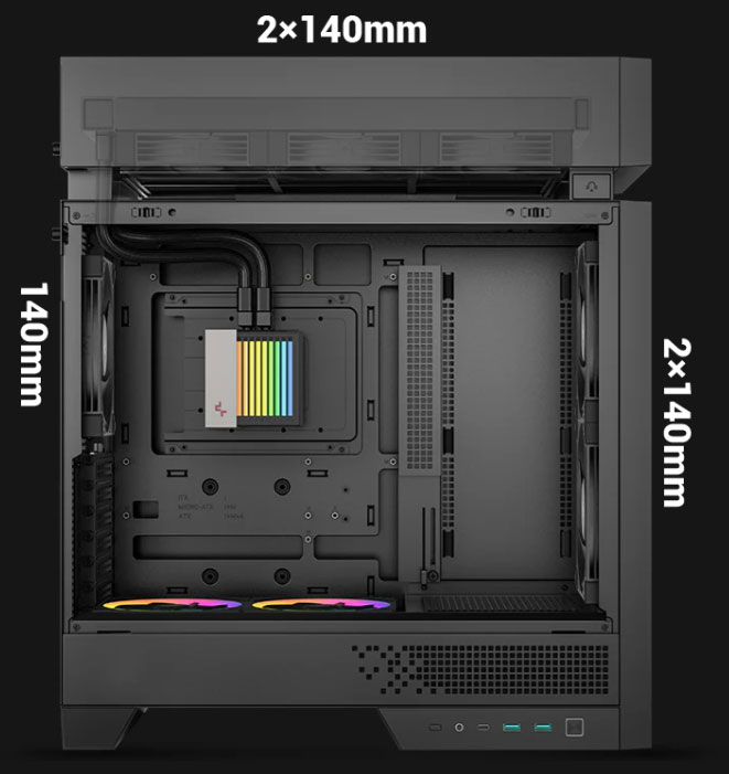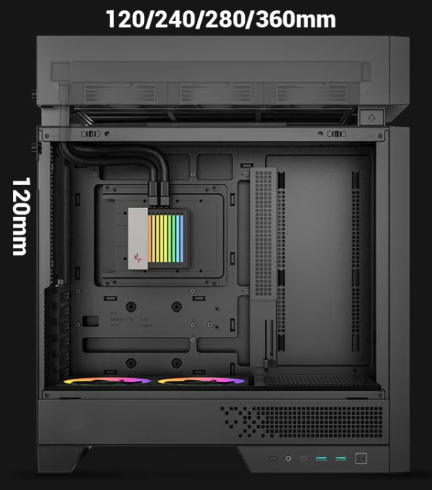 Оригинальный корпус CL6600 компания DeepCool представила ещё в мае 2025 года на выставке Computex 2025. Новая модель форм-фактора Mid-Tower разительно отличается от большинства традиционных компьютерных корпусов, поскольку имеет независимую верхнюю надстройку, в которую встроена система жидкостного охлаждения с 360-мм радиатором. Такое решение в DeepCool, не скромничая, назвали «переосмыслением корпусного дизайна», поскольку тепловые зоны и воздушные потоки в CL6600 физически разделены таким образом, что всё тепло от процессора из рабочей зоны быстро забирается системой жидкостного охлаждения, что позволяет более эффективно охлаждать все остальные компоненты, включая мощные видеокарты и горячие накопители в материнской плате. Технические характеристики