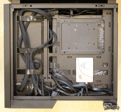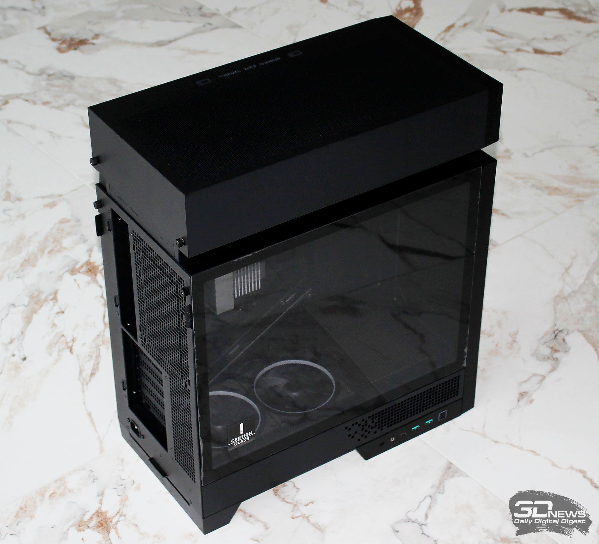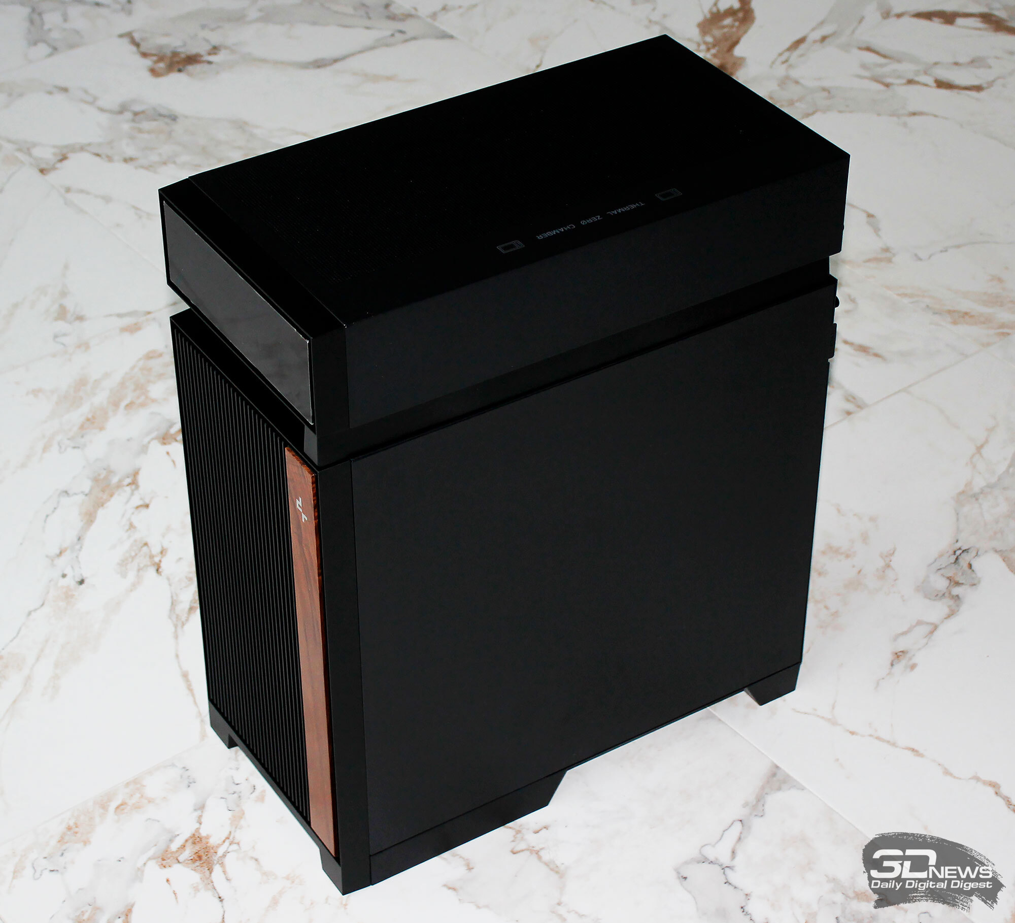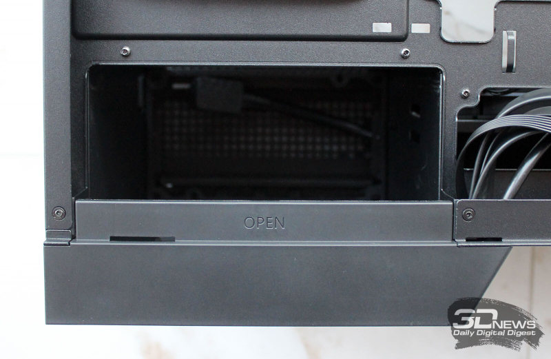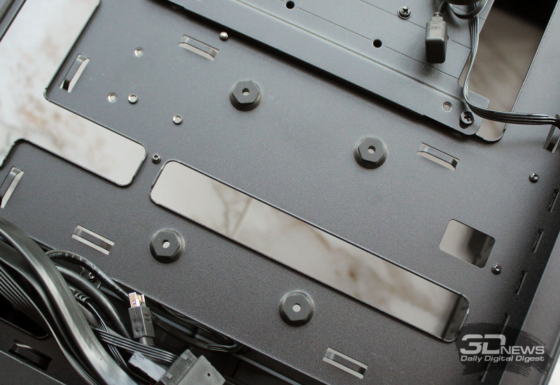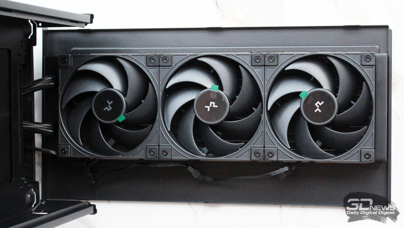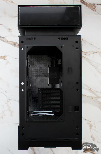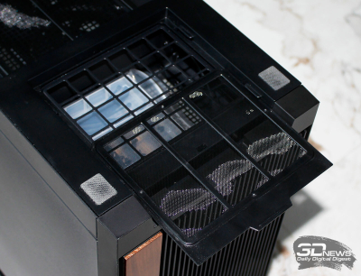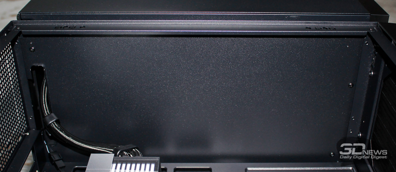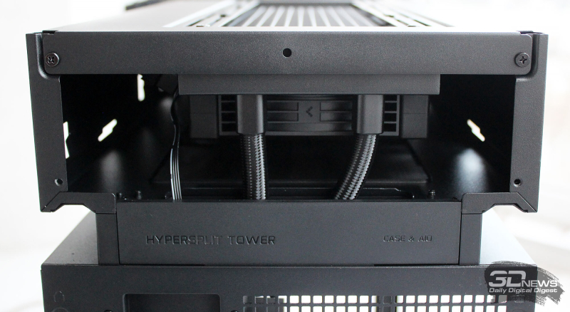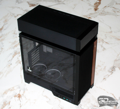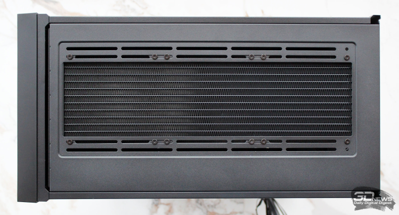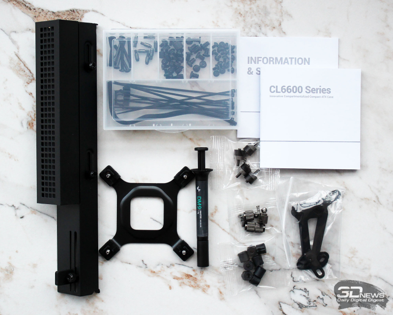 ⇡#Упаковка и комплектацияDeepCool CL6600 запечатан в обычную коробку типичных для корпусов такого форм-фактора размеров с минималистичным оформлением. На торцах коробки есть ручки для переноски, что, если учесть её приличную массу, очень пригодится. Внутри корпус защищён двумя оболочками из вспененного полиэтилена и облачён в пакет. На белой наклейке на коробке можно найти краткие характеристики корпуса и штрих-коды с указанием страны, в которой он произведён. Внутри корпуса размещены комплектующие, в числе которых съёмная стойка для закрытия кабелей и поддержки видеокарты, пластиковая коробочка с винтами разных типов и стяжками, инструкция по сборке, а также набор креплений помпы-водоблока на процессор с термопастой. Выпускаемый в Китае DeepCool CL6600 уже поступил в продажу в России по цене от 17 500 рублей. На корпус предоставляется однолетняя гарантия, что, кстати, странно, поскольку на свои выпускаемые отдельно AiO СЖО DeepCool предоставляет три года гарантии и больше, а здесь всего лишь год. Вряд ли это делает корпус более привлекательным, чем при покупке двух компонентов по отдельности. ⇡#ДизайнDeepCool CL6600 доступен в чёрном и белом цвете, у нас на тестах чёрная версия этой модели корпуса. Дизайн, безусловно, необычный – его в компании называют «модульным», но нам больше нравится термин «двухъярусный». Здесь на основном блоке корпуса установлена надстройка, в которой размещена система жидкостного охлаждения. Также обращает на себя внимание полоска на передней панели «под дерево» и слегка затонированная боковая панель из закалённого стекла. В общем, если вам нужен корпус с весьма необычным дизайном, чтобы произвести впечатление на своих гостей, то DeepCool CL6600 с этой задачей справится успешно. При всей необычности дизайна габариты корпуса вполне позволяют отнести его к форм-фактору Mid-Tower: его высота равна 533,5 мм, длина – 457,5 мм, а ширина – 235 мм. А вот масса корпуса почти достигает двенадцати килограммов, на что, конечно же, влияет предустановленная СЖО. В качестве материалов в DeepCool CL6600 задействованы сталь SPCC, стекло и пластик. Все панели выполнены весьма качественно, а к их прочности сложно предъявить какие-либо претензии. Боковая панель над рабочей зоной выполнена из закалённого стекла толщиной 3,5-4 мм, а противоположная ей – из стали толщиной 0,7-0,8 мм. Фронтальная панель полностью пластиковая и выполнена в виде вертикальной решётки с небольшой окрашенной под дерево полоской с логотипом компании-производителя. Фронтальная панель надстройки также пластиковая, и туда, как нам кажется, напрашивается какой-нибудь экран мониторинга. Возможно, в будущем появится и такая модификация. Сзади обращает на себя внимание большая вентиляционная зона, идущая от площадки для установки вентилятора и до окончания перфорированных заглушек слотов PCI Express. Кроме этого, стоит отметить 35-мм зону за поддоном материнской платы для установки накопителей и прокладки кабелей. У DeepCool CL6600 две верхних панели. Первая накрывает основной модуль корпуса, где и собирается конфигурация. Данная панель полностью глухая. Вторая верхняя панель уже накрывает радиатор СЖО во втором модуле и полностью перфорирована. Большая площадь основания корпуса выполнена в виде вентиляционной решётки, накрытой двумя фильтрами от пыли. Первый для чистки выдвигается вперёд, а второй – назад. Т