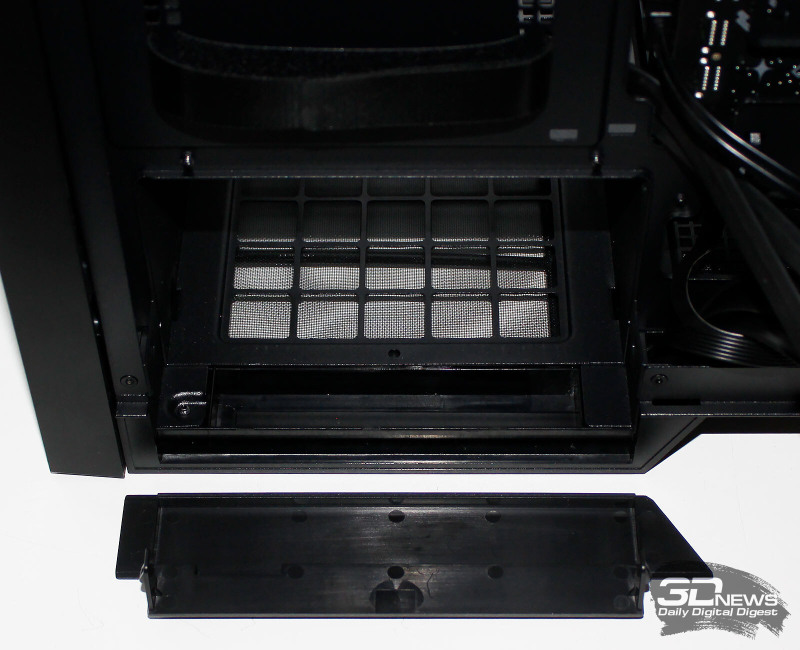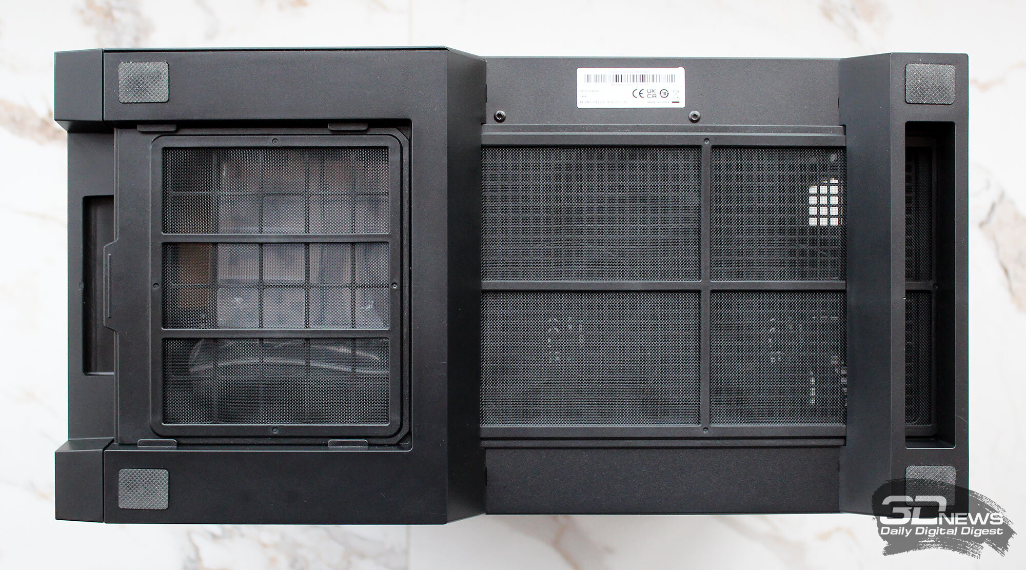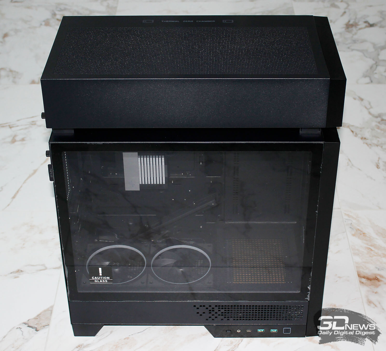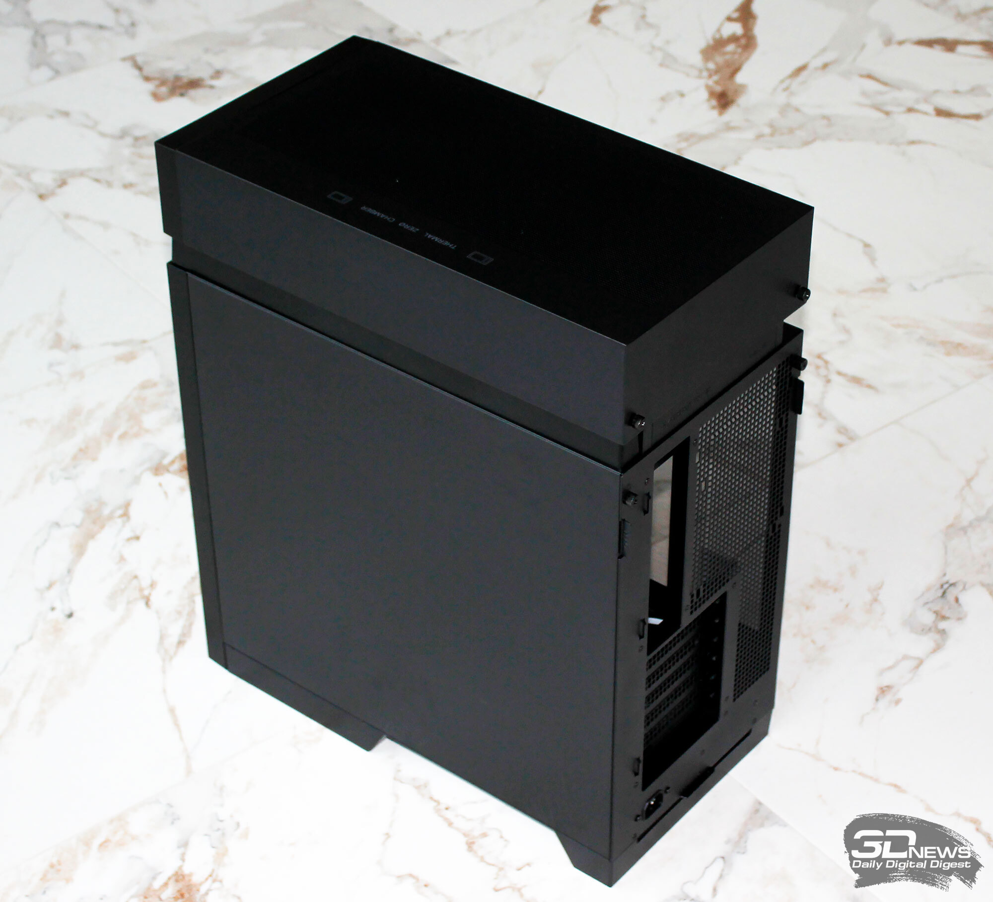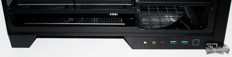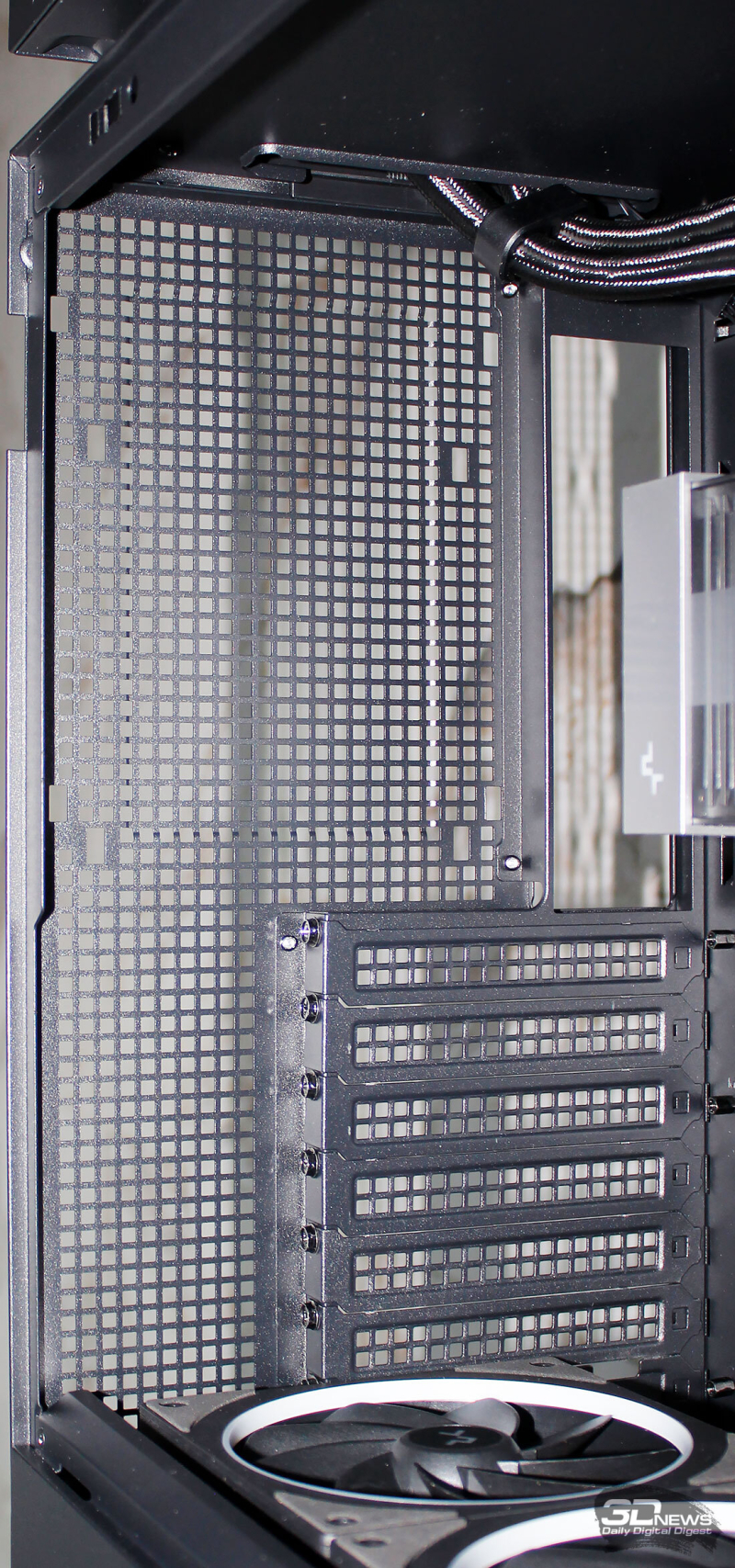 ⇡#Упаковка и комплектацияDeepCool CL6600 запечатан в обычную коробку типичных для корпусов такого форм-фактора размеров с минималистичным оформлением. На торцах коробки есть ручки для переноски, что, если учесть её приличную массу, очень пригодится. Внутри корпус защищён двумя оболочками из вспененного полиэтилена и облачён в пакет. На белой наклейке на коробке можно найти краткие характеристики корпуса и штрих-коды с указанием страны, в которой он произведён. Внутри корпуса размещены комплектующие, в числе которых съёмная стойка для закрытия кабелей и поддержки видеокарты, пластиковая коробочка с винтами разных типов и стяжками, инструкция по сборке, а также набор креплений помпы-водоблока на процессор с термопастой. Выпускаемый в Китае DeepCool CL6600 уже поступил в продажу в России по цене от 17 500 рублей. На корпус предоставляется однолетняя гарантия, что, кстати, странно, поскольку на свои выпускаемые отдельно AiO СЖО DeepCool предоставляет три года гарантии и больше, а здесь всего лишь год. Вряд ли это делает корпус более привлекательным, чем при покупке двух компонентов по отдельности. ⇡#ДизайнDeepCool CL6600 доступен в чёрном и белом цвете, у нас на тестах чёрная версия этой модели корпуса. Дизайн, безусловно, необычный – его в компании называют «модульным», но нам больше нравится термин «двухъярусный». Здесь на основном блоке корпуса установлена надстройка, в которой размещена система жидкостного охлаждения. Также обращает на себя внимание полоска на передней панели «под дерево» и слегка затонированная боковая панель из закалённого стекла. В общем, если вам нужен корпус с весьма необычным дизайном, чтобы произвести впечатление на своих гостей, то DeepCool CL6600 с этой задачей справится успешно. При всей необычности дизайна габариты корпуса вполне позволяют отнести его к форм-фактору Mid-Tower: его высота равна 533,5 мм, длина – 457,5 мм, а ширина – 235 мм. А вот масса корпуса почти достигает двенадцати килограммов, на что, конечно же, влияет предустановленная СЖО. В качестве материалов в DeepCool CL6600 задействованы сталь SPCC, стекло и пластик. Все панели выполнены весьма качественно, а к их прочности сложно предъявить какие-либо претензии. Боковая панель над рабочей зоной выполнена из закалённого стекла толщиной 3,5-4 мм, а противоположная ей – из стали толщиной 0,7-0,8 мм. Фронтальная панель полностью пластиковая и выполнена в виде вертикальной решётки с небольшой окрашенной под дерево полоской с логотипом компании-производителя. Фронтальная панель надстройки также пластиковая, и туда, как нам кажется, напрашивается какой-нибудь экран мониторинга. Возможно, в будущем появится и такая модификация. Сзади обращает на себя внимание большая вентиляционная зона, идущая от площадки для установки вентилятора и до окончания перфорированных заглушек слотов PCI Express. Кроме этого, стоит отметить 35-мм зону за поддоном материнской платы для установки накопителей и прокладки кабелей. У DeepCool CL6600 две верхних панели. Первая накрывает основной модуль корпуса, где и собирается конфигурация. Данная панель полностью глухая. Вторая верхняя панель уже накрывает радиатор СЖО во втором модуле и полностью перфорирована. Большая площадь основания корпуса выполнена в виде вентиляционной решётки, накрытой двумя фильтрами от пыли. Первый для чистки выдвигается вперёд, а второй – назад. Т
