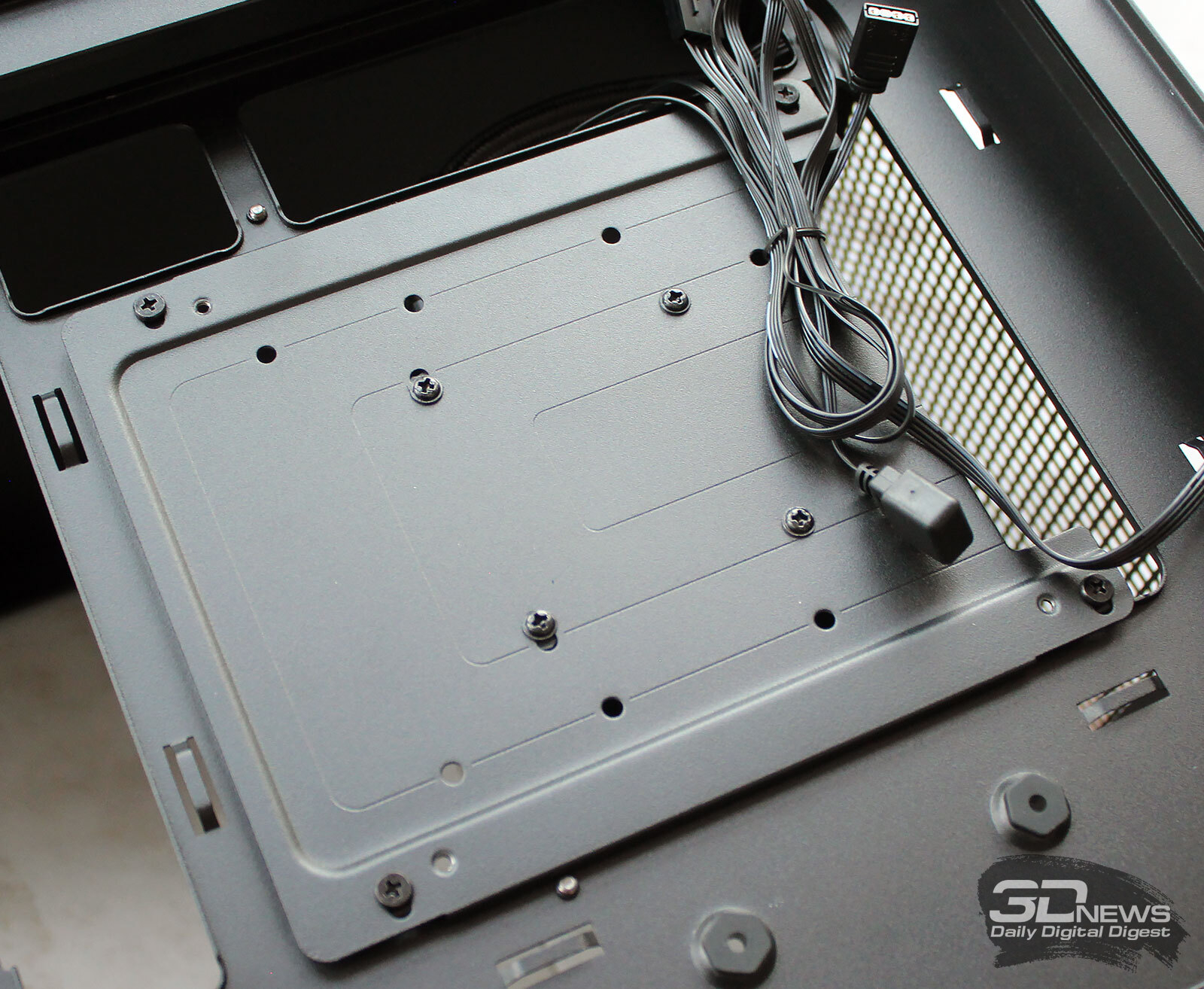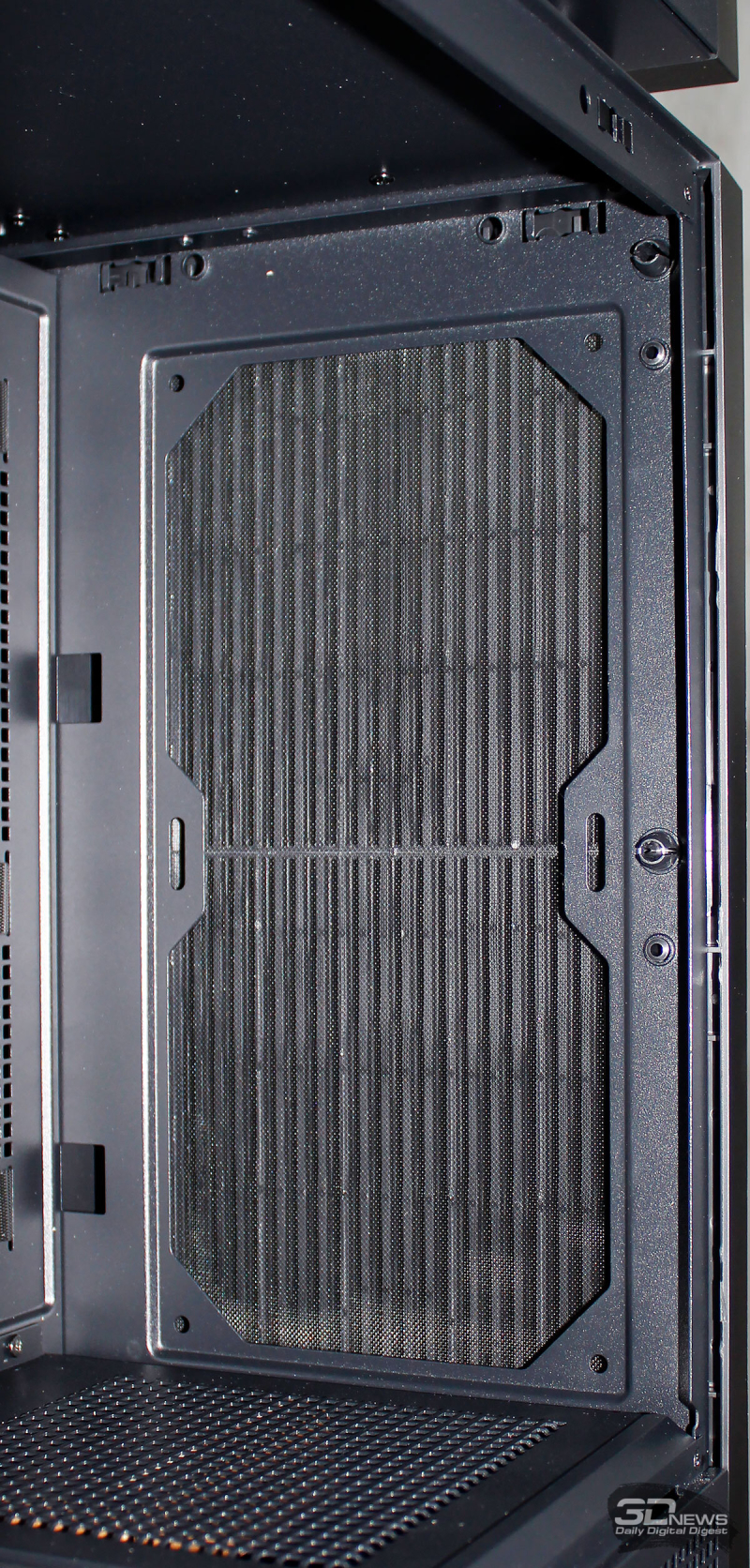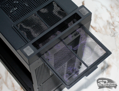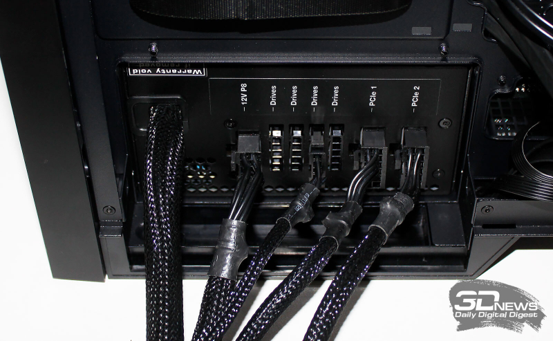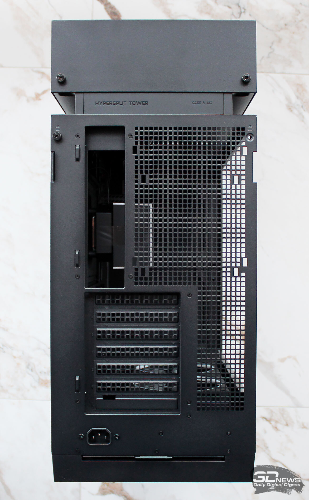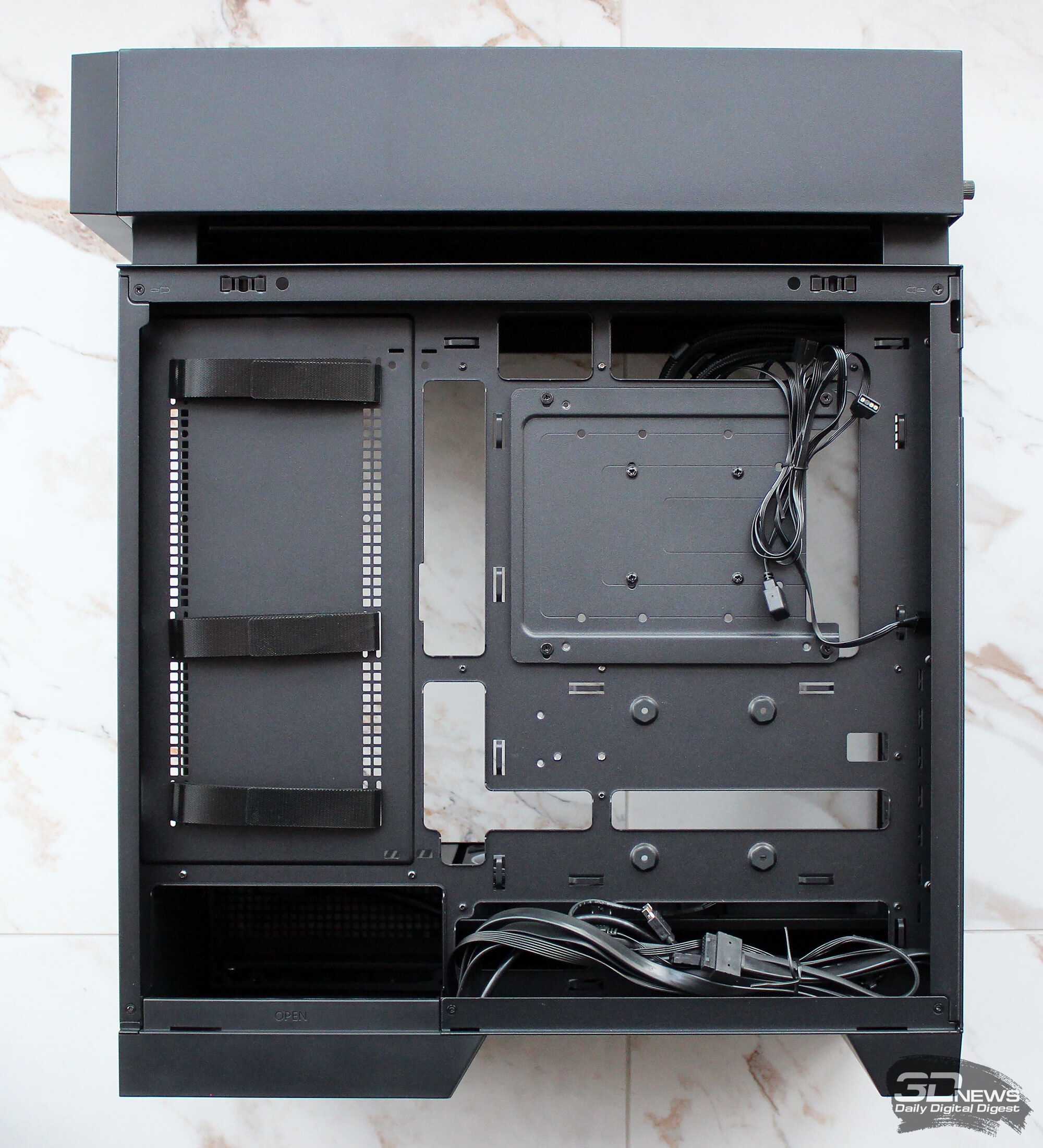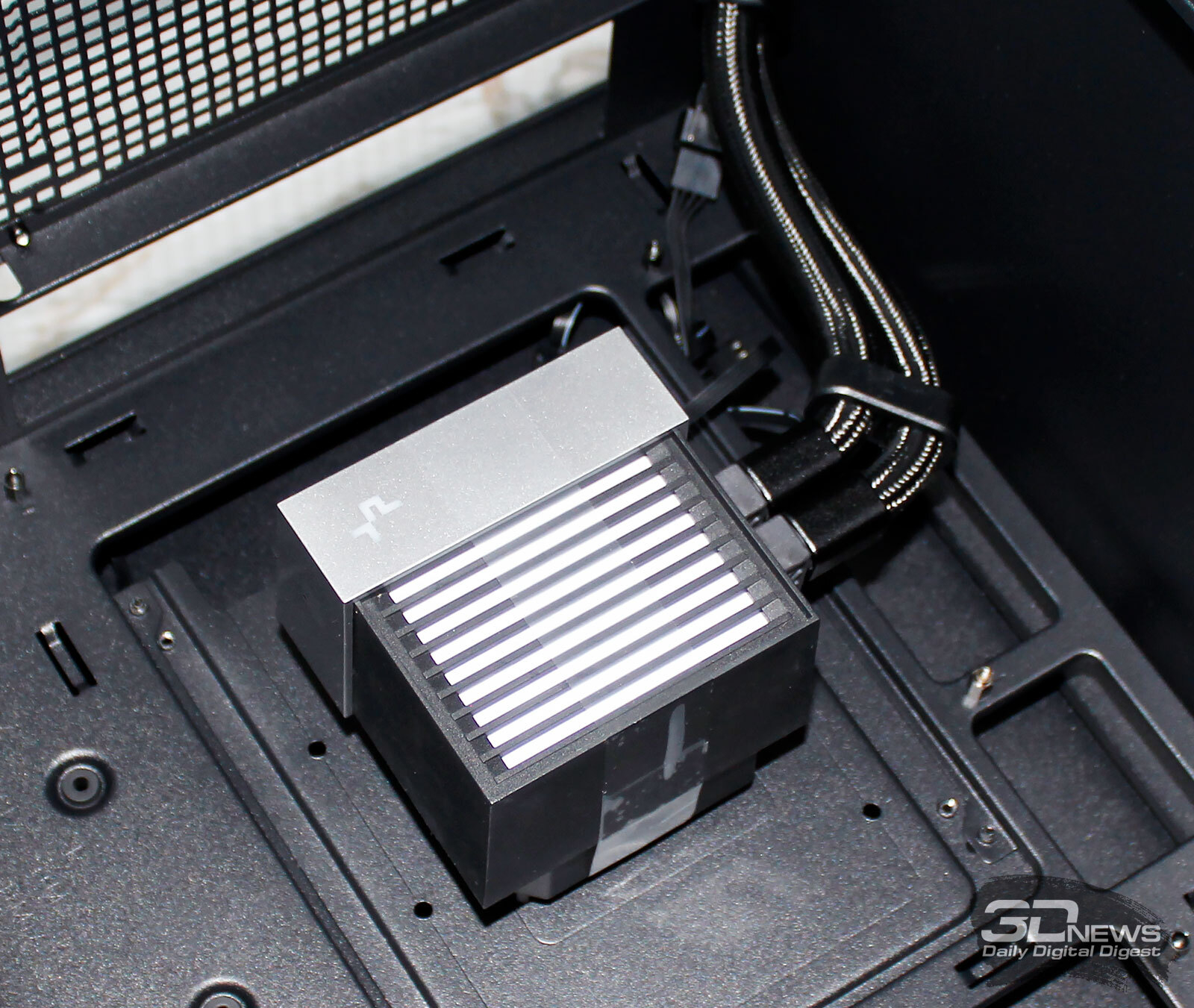 ⇡#Упаковка и комплектацияDeepCool CL6600 запечатан в обычную коробку типичных для корпусов такого форм-фактора размеров с минималистичным оформлением. На торцах коробки есть ручки для переноски, что, если учесть её приличную массу, очень пригодится. Внутри корпус защищён двумя оболочками из вспененного полиэтилена и облачён в пакет. На белой наклейке на коробке можно найти краткие характеристики корпуса и штрих-коды с указанием страны, в которой он произведён. Внутри корпуса размещены комплектующие, в числе которых съёмная стойка для закрытия кабелей и поддержки видеокарты, пластиковая коробочка с винтами разных типов и стяжками, инструкция по сборке, а также набор креплений помпы-водоблока на процессор с термопастой. Выпускаемый в Китае DeepCool CL6600 уже поступил в продажу в России по цене от 17 500 рублей. На корпус предоставляется однолетняя гарантия, что, кстати, странно, поскольку на свои выпускаемые отдельно AiO СЖО DeepCool предоставляет три года гарантии и больше, а здесь всего лишь год. Вряд ли это делает корпус более привлекательным, чем при покупке двух компонентов по отдельности. ⇡#ДизайнDeepCool CL6600 доступен в чёрном и белом цвете, у нас на тестах чёрная версия этой модели корпуса. Дизайн, безусловно, необычный – его в компании называют «модульным», но нам больше нравится термин «двухъярусный». Здесь на основном блоке корпуса установлена надстройка, в которой размещена система жидкостного охлаждения. Также обращает на себя внимание полоска на передней панели «под дерево» и слегка затонированная боковая панель из закалённого стекла. В общем, если вам нужен корпус с весьма необычным дизайном, чтобы произвести впечатление на своих гостей, то DeepCool CL6600 с этой задачей справится успешно. При всей необычности дизайна габариты корпуса вполне позволяют отнести его к форм-фактору Mid-Tower: его высота равна 533,5 мм, длина – 457,5 мм, а ширина – 235 мм. А вот масса корпуса почти достигает двенадцати килограммов, на что, конечно же, влияет предустановленная СЖО. В качестве материалов в DeepCool CL6600 задействованы сталь SPCC, стекло и пластик. Все панели выполнены весьма качественно, а к их прочности сложно предъявить какие-либо претензии. Боковая панель над рабочей зоной выполнена из закалённого стекла толщиной 3,5-4 мм, а противоположная ей – из стали толщиной 0,7-0,8 мм. Фронтальная панель полностью пластиковая и выполнена в виде вертикальной решётки с небольшой окрашенной под дерево полоской с логотипом компании-производителя. Фронтальная панель надстройки также пластиковая, и туда, как нам кажется, напрашивается какой-нибудь экран мониторинга. Возможно, в будущем появится и такая модификация. Сзади обращает на себя внимание большая вентиляционная зона, идущая от площадки для установки вентилятора и до окончания перфорированных заглушек слотов PCI Express. Кроме этого, стоит отметить 35-мм зону за поддоном материнской платы для установки накопителей и прокладки кабелей. У DeepCool CL6600 две верхних панели. Первая накрывает основной модуль корпуса, где и собирается конфигурация. Данная панель полностью глухая. Вторая верхняя панель уже накрывает радиатор СЖО во втором модуле и полностью перфорирована. Большая площадь основания корпуса выполнена в виде вентиляционной решётки, накрытой двумя фильтрами от пыли. Первый для чистки выдвигается вперёд, а второй – назад. Т