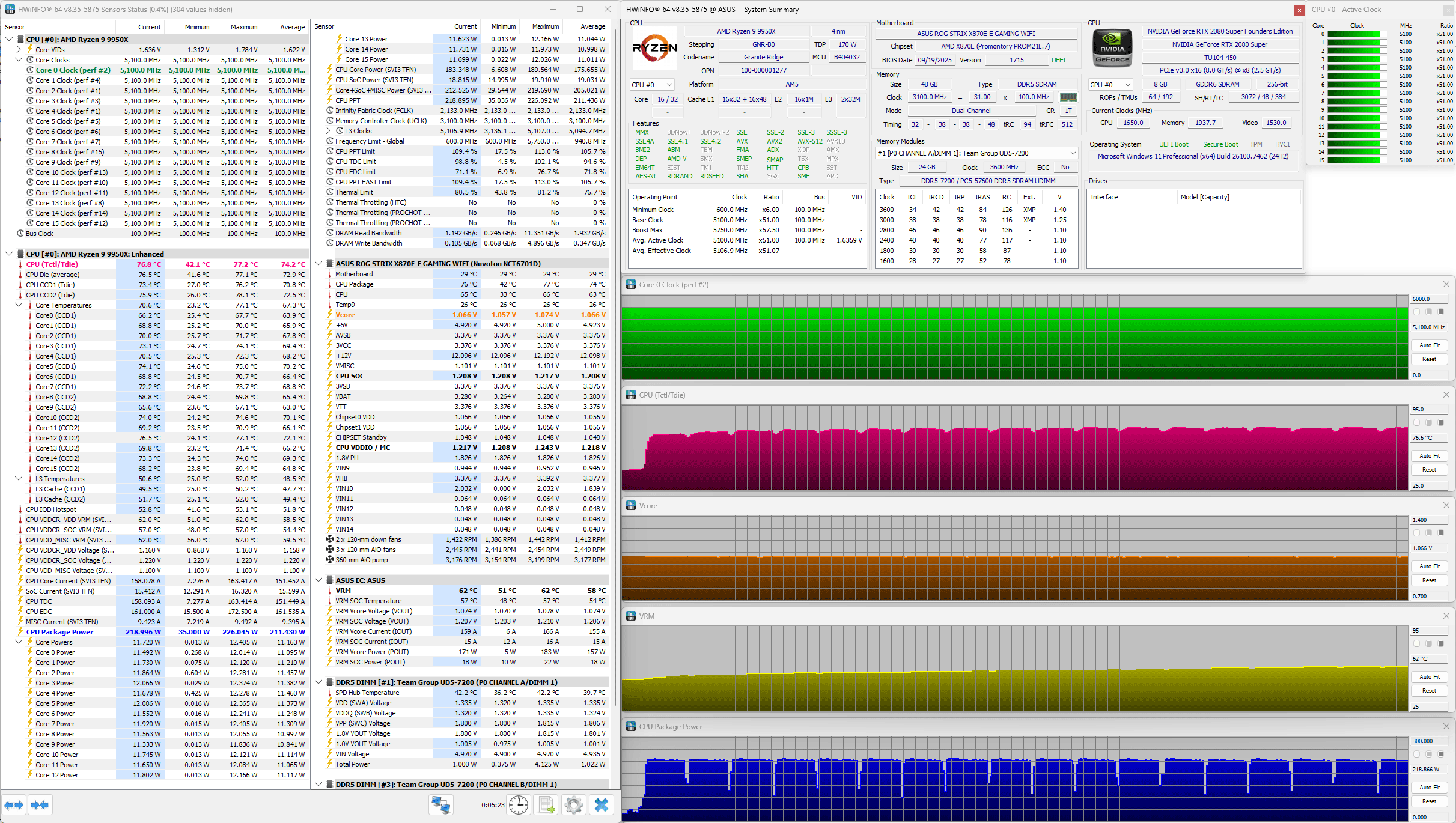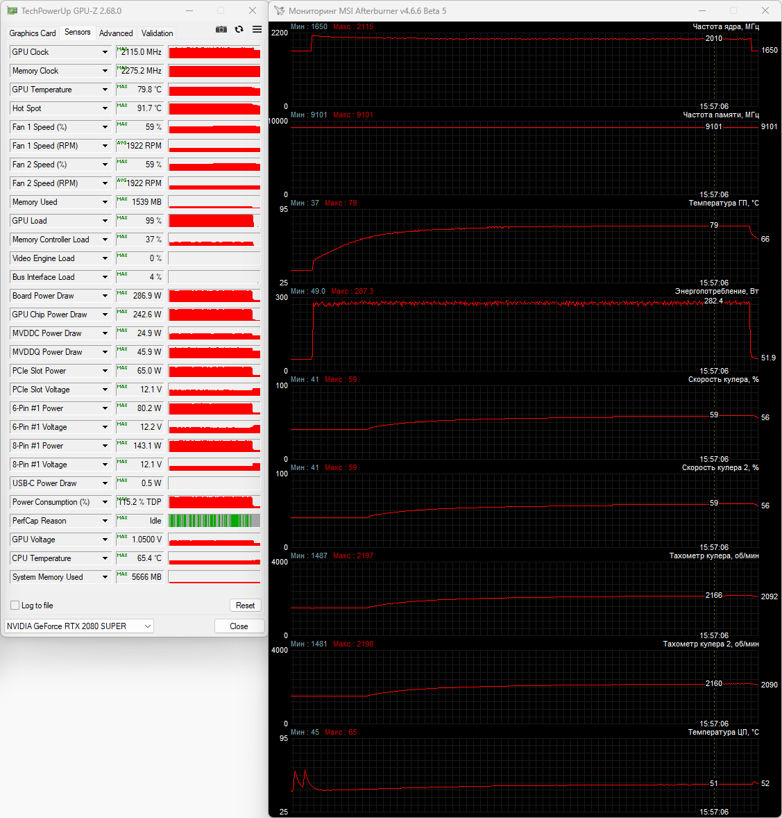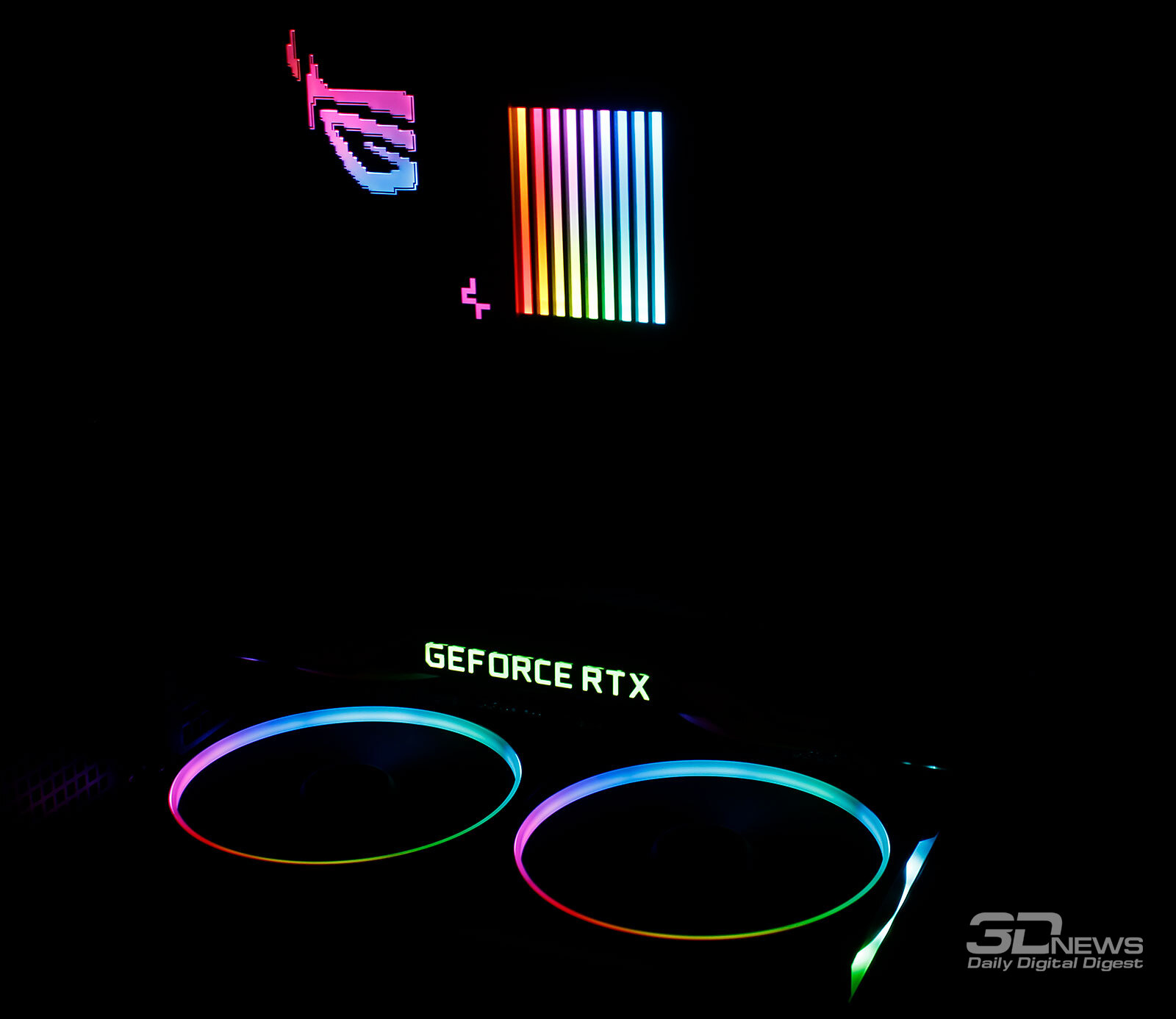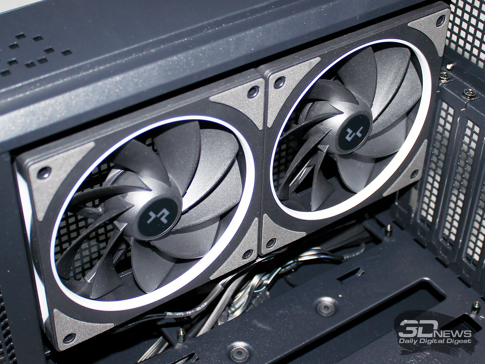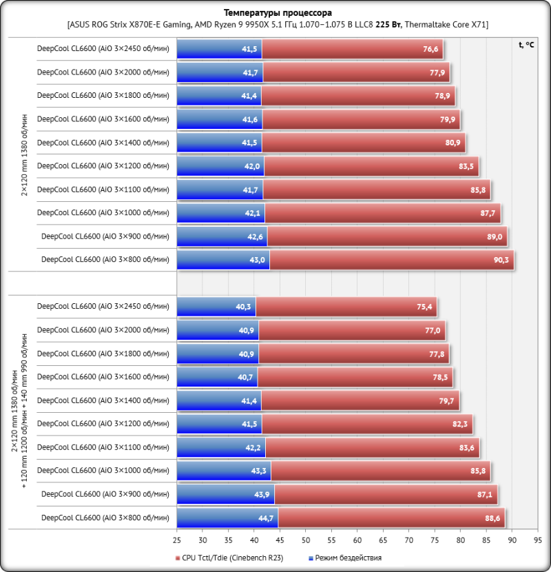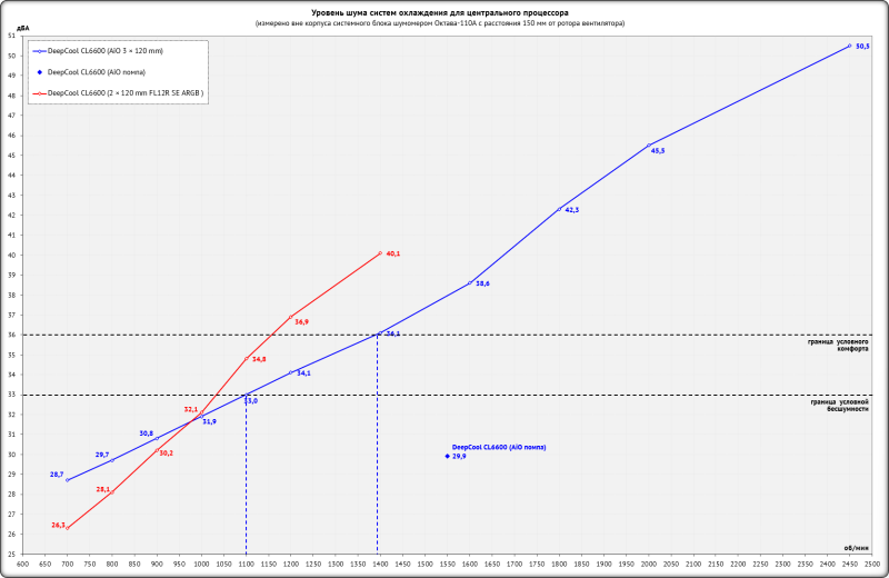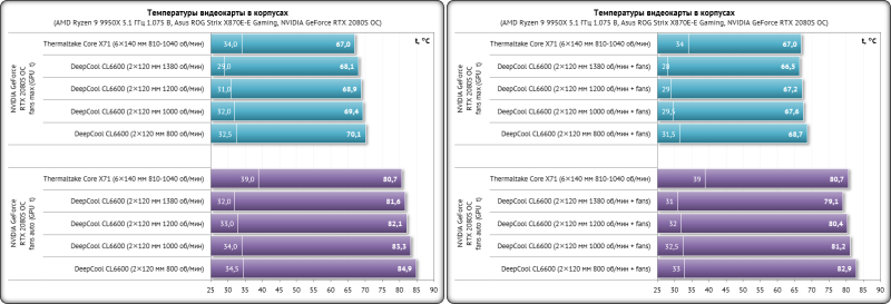 Для получения стабильных и объективно сопоставимых друг с другом результатов основные параметры процессора были зафиксированы в следующих значениях: частота BCLK – 100 МГц, множитель ядер – 51, частота – 5,1 ГГц, напряжение Vcore – 1,070-1,075 В. В BIOS материнской платы Asus был выставлен восьмой (максимальный) уровень стабилизации напряжения на ядре процессора (CPU load-line calibration). По данным HWiNFO64, уровень тепловыделения процессора с такими настройками достигал 228 ватт. Эффективная частота оперативной памяти была зафиксирована на отметке 6,2 ГГц при напряжениях 1,330/1,320/1,210 В (VDD/VDDQ/VSOC), а её основные тайминги фиксировались в значениях 32-38-38-48 CR1 с дополнительной подстройкой вторичных и третичных таймингов. Частота коммуникационной шины Infinity Fabric (FCLK) была установлена на отметке 2,133 ГГц. Для прогрева комплектующих внутри корпуса мы использовали индивидуальную стресс-нагрузку для каждого отдельного компонента, поскольку именно так достигается их максимальный нагрев. Центральный процессор нагружался десятиминутным тестом Cinebench R23 в режиме «Test Throttling». Мониторинг температурных показателей выполнялся программой HWiNFO64 версии 8.35-5875. Для повышения тепловыделения видеокарта NVIDIA GeForce RTX 2080 SUPER FE была разогнана по графическому процессору на 120 МГц и по видеопамяти на 1350 МГц. Разогнанная видеокарта нагружалась стресс-тестом Fire Strike Extreme (21 цикл) из пакета 3DMark, а для её мониторинга использовались программы GPU-Z версии 2.68.0 и MSI Afterburner версии 4.6.6 beta 5. Температура в помещении во время тестов контролировалась электронным термометром и колебалась в диапазоне от 22,5 до 23,7 градуса Цельсия. Уровень шума корпусов мы измеряли электронным шумомером «ОКТАВА-110А», зафиксированным на штативе на расстоянии 600 мм от корпуса системного блока. Добавим, что нижняя граница измерений данного шумомера составляет 22 дБА (полная тишина). DeepCool CL6600 тестировался с двумя штатными 120-мм корпусными вентиляторами, работающими на вдув в корпус, а кроме этого, мы провели дополнительные тесты с установленным на переднюю стенку 140-мм вентилятором be quiet! Silent Wings 3 (BL067) на постоянной скорости 990 об/мин вкупе с 120-мм вентилятором Noctua NF-A12×25 PWM на задней стенке корпуса с постоянной скоростью 1210 об/мин. Поскольку конструкция нового корпуса DeepCool уникальна, то объективное сравнение его по эффективности охлаждения с любым другим корпусом провести попросту невозможно. Поэтому мы протестировали встроенную систему жидкостного охлаждения во всём скоростном режиме работы её вентиляторов, зафиксировав следующие температурные показатели. Как видим, встроенная в верхний модуль корпуса DeepCool CL6600 система жидкостного охлаждения со своей задачей справляется во всём скоростном диапазоне, включая очень тихие режимы на 800 об/мин. И всё же пара дополнительных корпусных вентиляторов идёт CL6600 на пользу, поскольку температуры процессора снижаются на пару градусов Цельсия в каждом режиме работы СЖО. Если же провести параллели с результатами такой же 360-мм СЖО в классическом корпусе (например, посмотрев здесь), то окажется, что в DeepCool CL6600 температуры процессора выше на 3-4 градуса Цельсия. Также выше и температуры цепей VRM материнской платы, ведь пара штатных вентиляторов корпуса работают на видеокарту и практически не влияют на всё остальное. Теперь проверим эффективность охлаждения видеокарты, на которую направлены два 120-мм ве