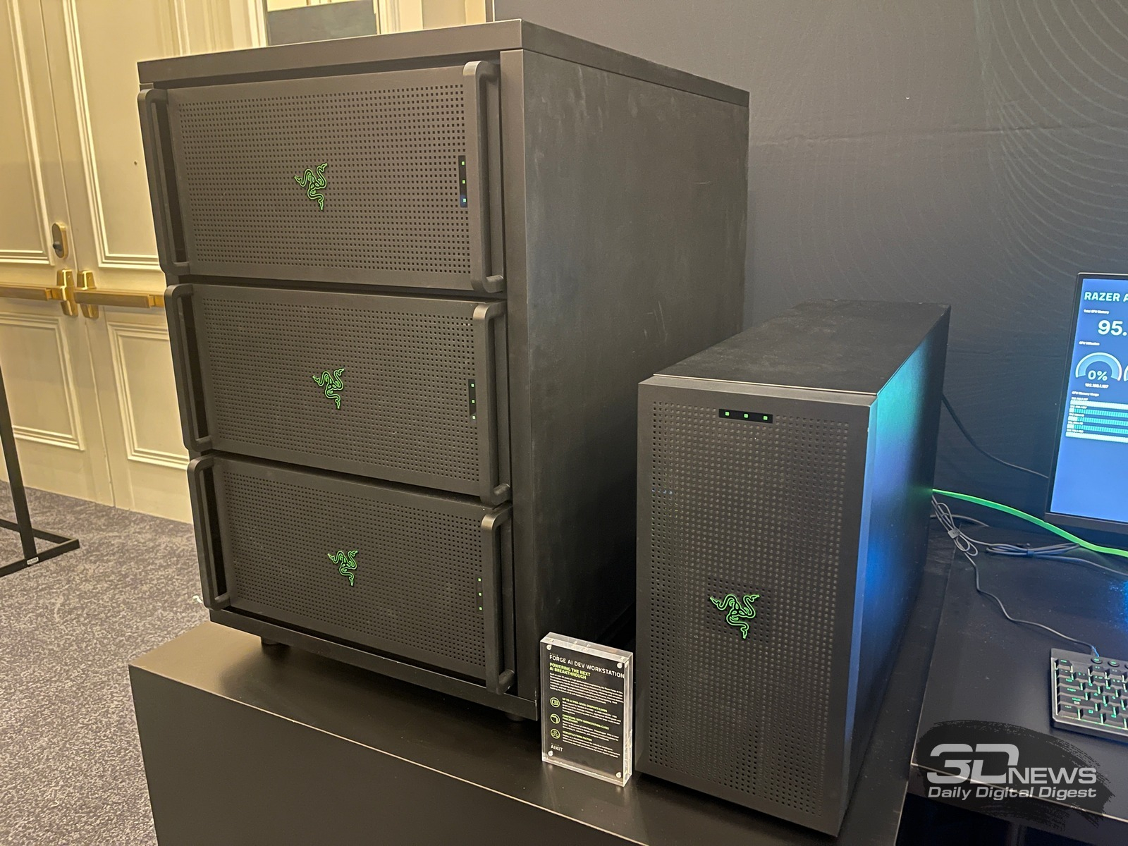 Рабочая станция Razer Forge для разработки ИИ предлагает конструкцию, готовую к установке в серверную стойку, что упрощает создание плотных кластерных конфигураций в составе одного корпуса. Она поддерживает до четырёх видеокарт AMD или Nvidia, имеет восемь слотов DDR5 и работает на базе процессора AMD Ryzen Threadripper Pro. Для Razer Forge заявляется поддержка блоков питания мощностью до 2000 Вт и оснащение двумя LAN-портами с поддержкой до 10 Гбит/с для быстрой передачи данных.
