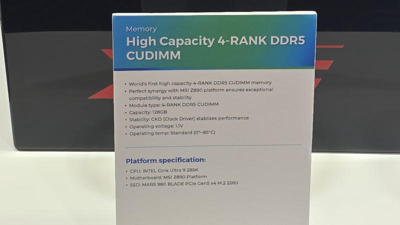 Усилиями MSI, которая предоставила «материнскую плату в разработке», модули Adata DDR5-5600 CUDIMM удалось разогнать до 10 000 МТ/с, то есть на 63 % — следует, однако, отметить, что этого показателя достигли в одноранговом режиме. Разработанные Adata модули отвечают требованиям по оптимизации разгона на материнских платах с одним слотом на канал (1SPC) на высоких ёмкости и частоте, отметили в MSI. Новая технология открывает потенциал для дальнейшего расширения за счёт поддержки многослойных кристаллов, подчеркнул производитель.