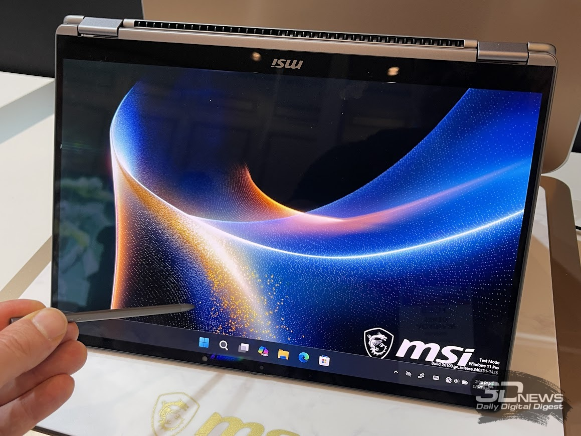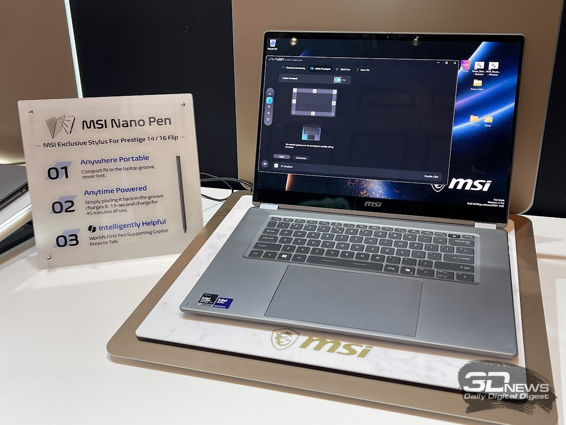 Prestige 14 Flip AI+ и Prestige 16 Flip AI+ дополняют линейку форм-фактором 2-в-1: здесь используются сенсорные OLED-дисплеи, раскрывающиеся на 360°, и поддержка фирменного цифрового пера MSI Nano Pen, которое удобно хранится в корпусе. Стилус быстро заряжается (15 секунд обеспечивают до 45 минут работы) и интегрирован с Microsoft Copilot — всё это делает «флипы» выбором для тех, кто работает с графикой или предпочитает рукописные пометки.