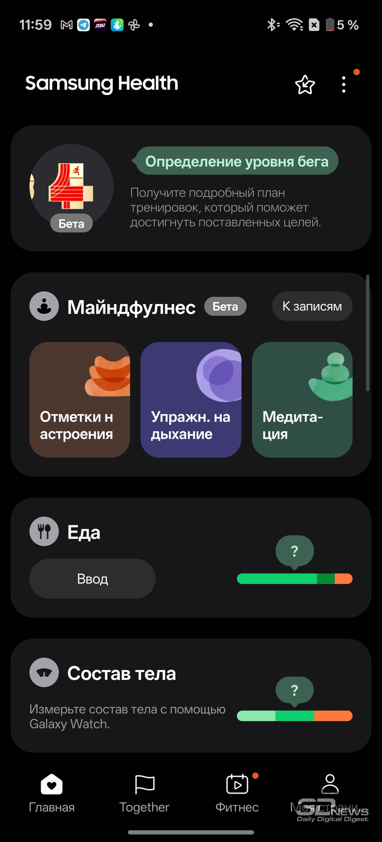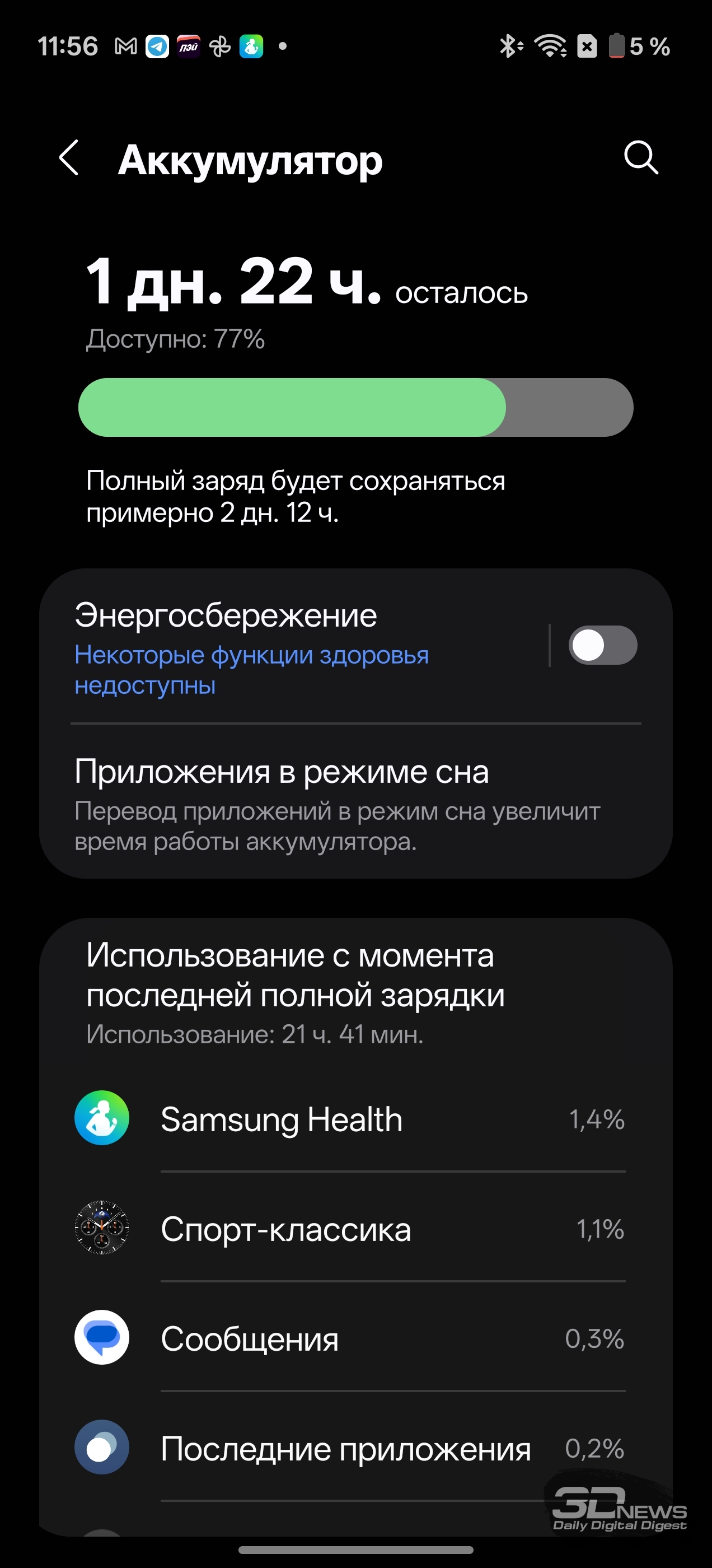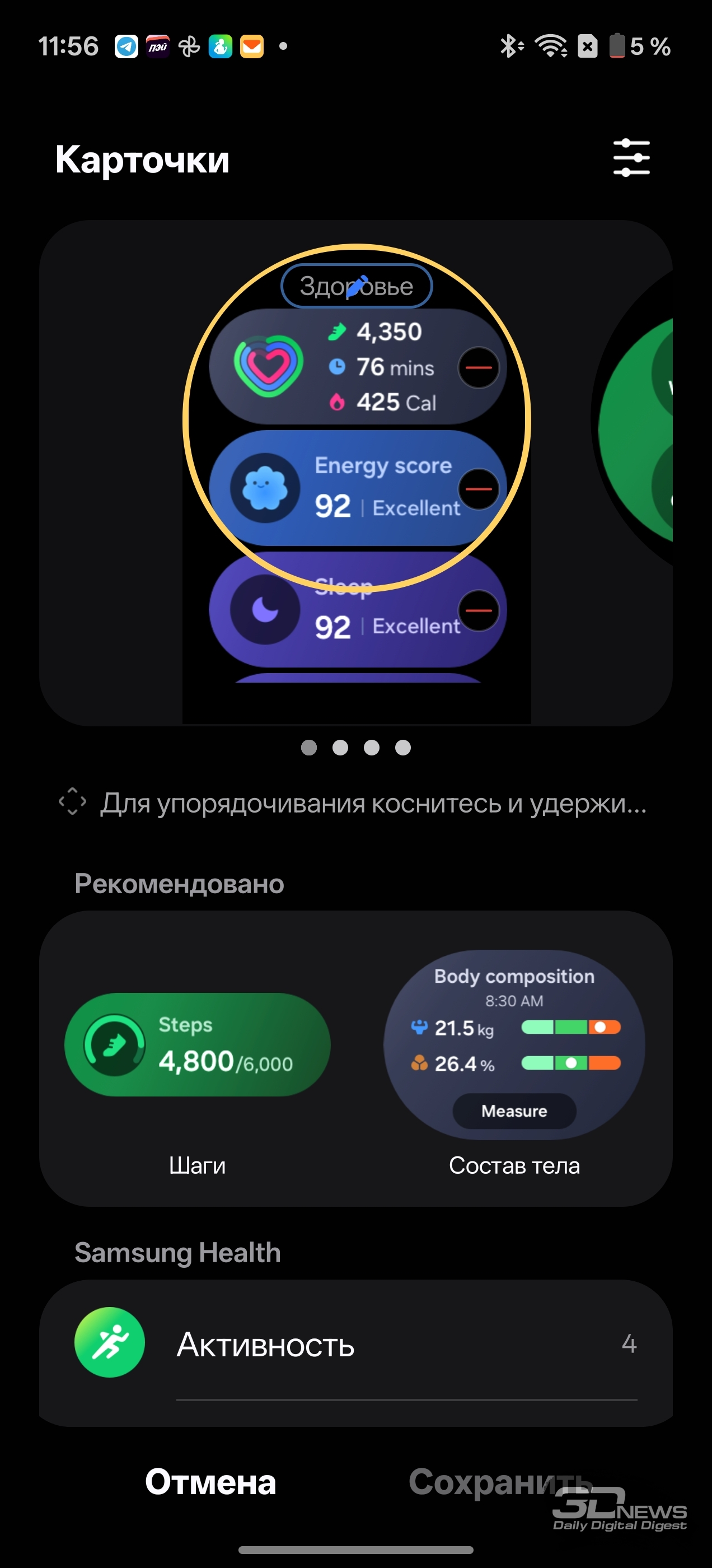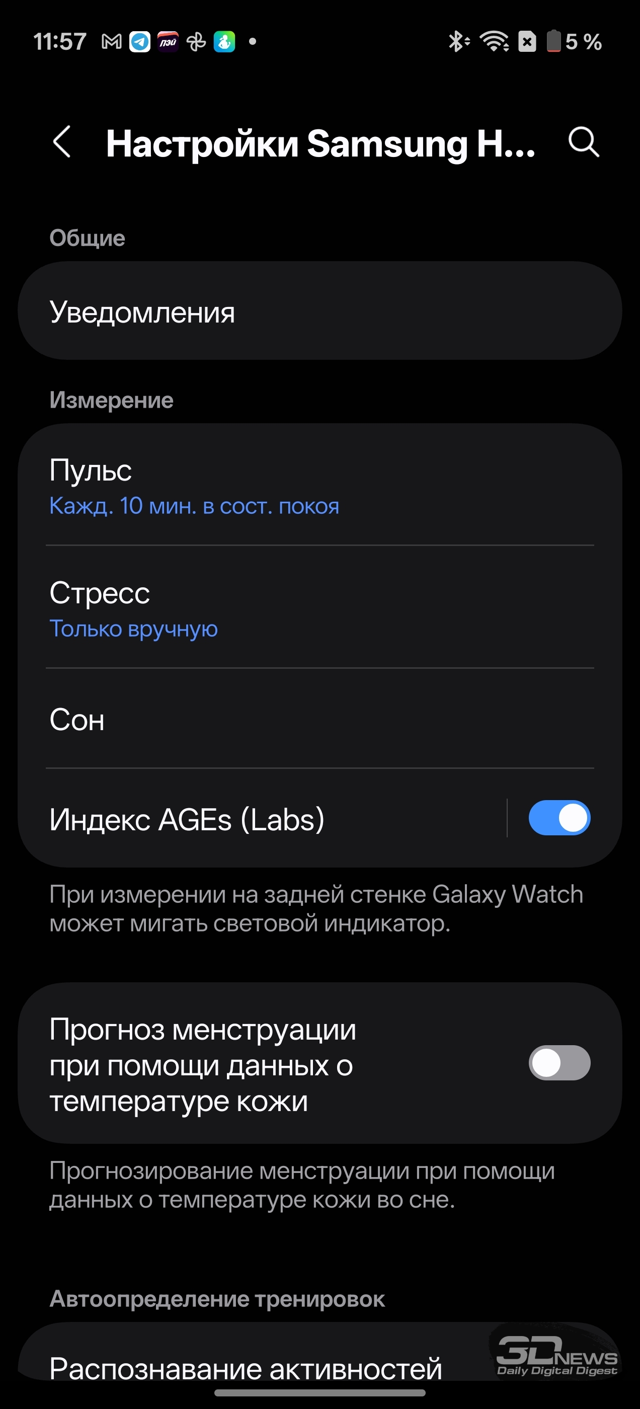 Смотреть все изображения (36) Раз уж мы заговорили о приложениях — одним из самых неоднозначных моментов во взаимодействии с Samsung Galaxy Watch8 Classic мне видится очень долгая и довольно муторная первоначальная настройка часов и необходимость устанавливать минимум два приложения на смартфон (Samsung Wearable и Samsung Health, а желательно еще и Smart Switch). Сами по себе приложения приятные, понятные и функциональные, а изобилие настроек заставит те же часы Huawei (да и Apple) побледнеть от неловкости, но множество лишних действий и само обилие сущностей расстраивает. Конечно, при сопряжении со смартфоном Samsung все намного проще (хотя бы потому, что там все приложения установлены по умолчанию), но столь выраженную «экосистемность» часов я к их плюсам отнести не могу. Тем более что она подчеркивается недоступностью некоторых функций при взаимодействии со сторонними устройствами — речь об измерении ЭКГ, артериальной жесткости и давления. Если же говорить о доступных с обычным смартфоном Android функциях слежения за здоровьем, то вся база на месте: шагомер, пульс, уровень кислорода в крови, уровень стресса (по запросу), отслеживание сна (в том числе качества дыхания, того же кислорода в крови и так далее). Есть и специфические параметры измерения: уровень антиоксидантов в крови (для его измерения как раз надо снять часы и нажать большим пальцем на датчики, расположенные на тыльной поверхности часов), индекс AEGs (текущее состояние метаболизма, очень условно отражающее процесс биологического старения), сосудистая нагрузка (измеряется по запросу во время сна) и возможность определить (опять же, по запросу) состав тела (жир, мускулатура, вода и так далее). Вдобавок в приложении можно вести дневник пищи, отслеживать менструальный цикл, кровяное давление, сахар в крови, часы и приложение могут посоветовать дыхательные упражнения, заполняются привычные «кольца активности». Сочетание «часы + приложение» способно стать отличным подспорьем для каждого, кто следит за своим здоровьем, — далеко не только для спортсменов (хотя зачем нужны умные часы, если вы совсем не занимаетесь спортом, — мне непонятно). Samsung Galaxy Watch8 Classic качественно справляются с функциями инструмента для контроля за тренировками. В них записано более 100 тренировочных программ, базовые (бег, ходьба, велосипед, плавание) часы умеют распознавать самостоятельно и запускать соответствующий режим. Есть встроенный тренер по бегу, который может определить, правильно ли вы двигаетесь, дать советы и составить тренировочный план. Ничего сверхъестественного как тренировочный инструмент Galaxy Watch8 Classic не предлагают, но, опять же, обязательная программа выполнена на очень высокий балл, есть и приятный бонус в виде того самого встроенного ИИ-тренера по бегу. А теперь, пожалуй, о самом главном нюансе, который касается как часов Samsung, так и часов Apple (во многом они побратимы, конечно). Речь об автономности. Здесь установлена батарея емкостью 445 мА·ч — почти в два раза меньше, чем на тех же HUAWEI WATCH 5. При том что Galaxy Watch8 Classic тяжелее — но с экраном меньшей диагонали. А разница в автономности (не в пользу устройства Samsung) даже больше, чем двукратная, — Watch8 Classic надо обязательно заряжать каждые два дня, если не усердствовать с тренировками с записью трека при помощи GPS. Необходимо прямо-таки тщательно следить за своим ритмом, не забывать стави