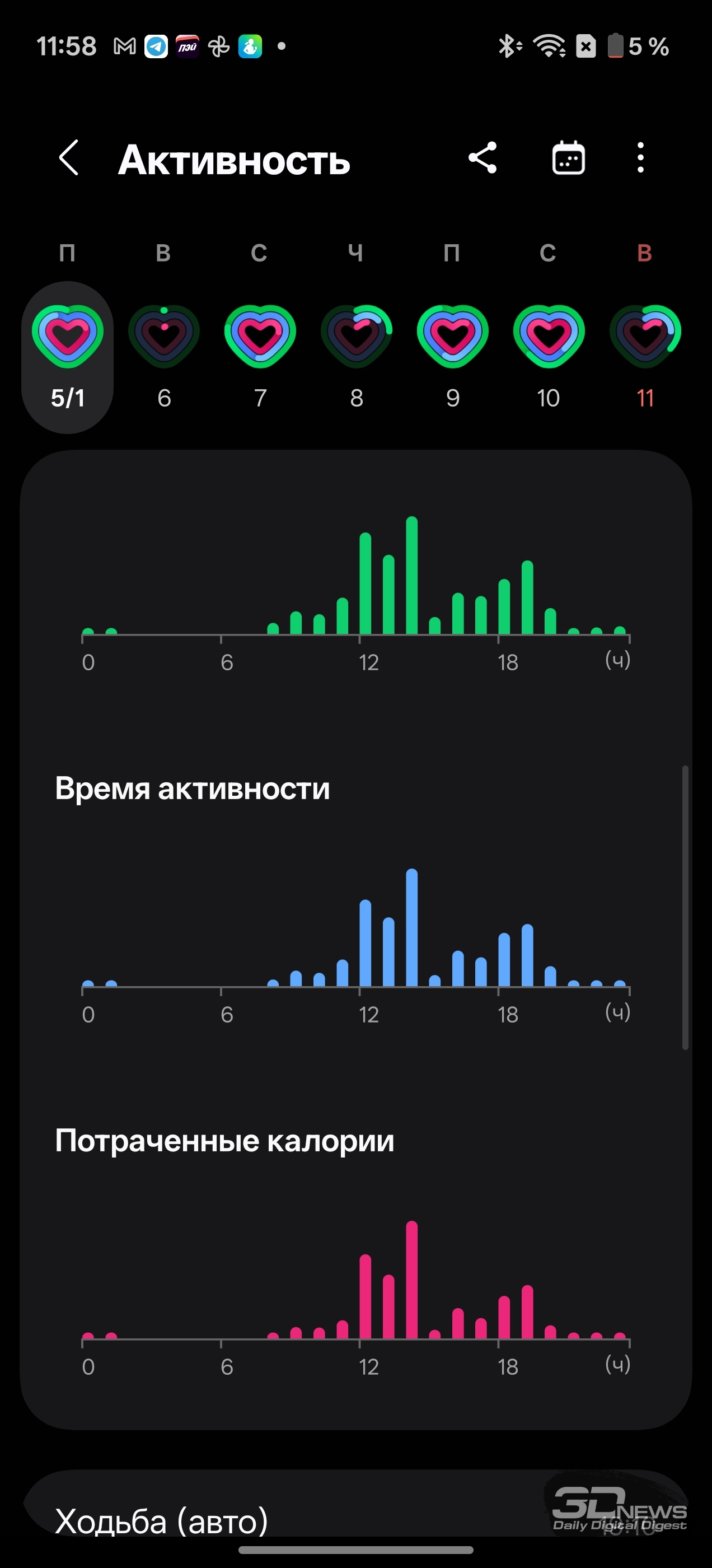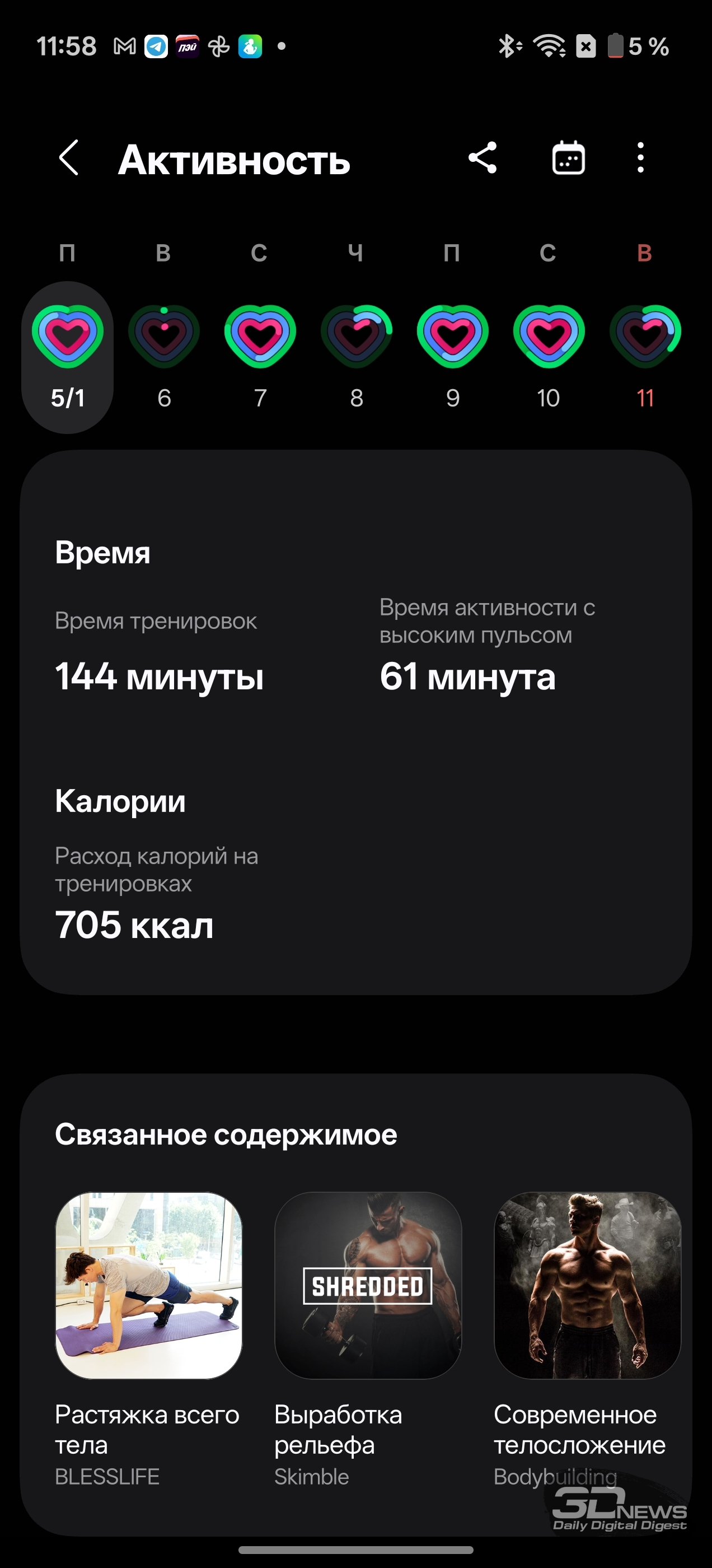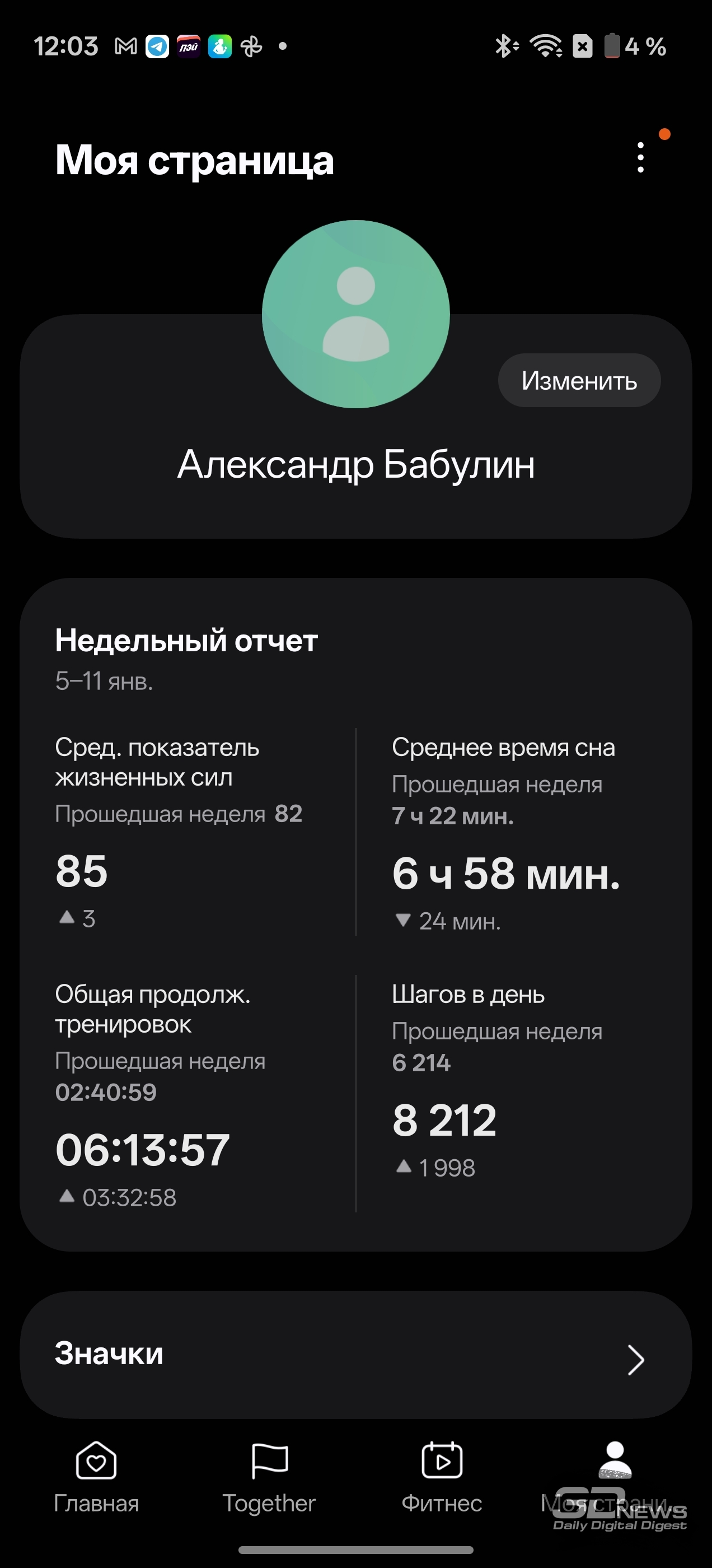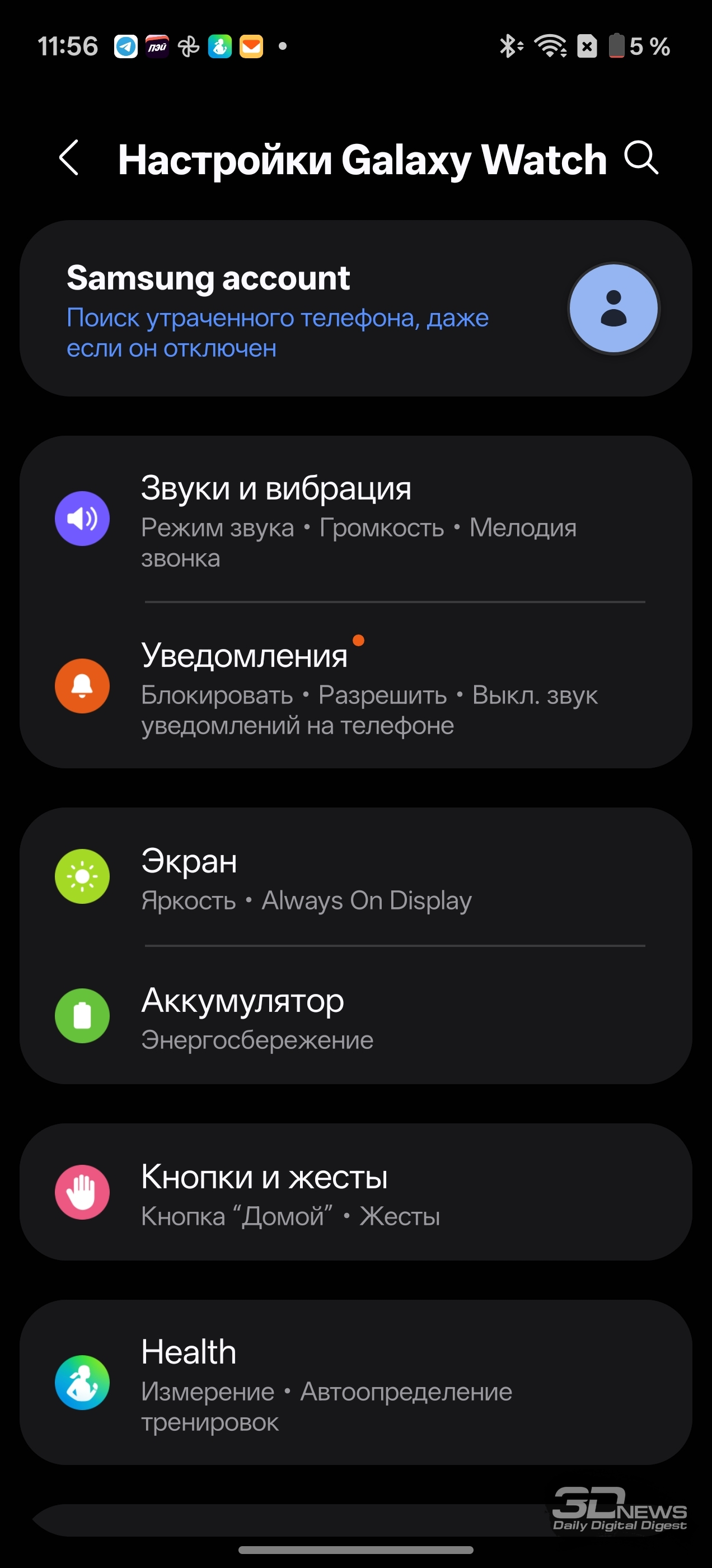 Смотреть все изображения (36) Раз уж мы заговорили о приложениях — одним из самых неоднозначных моментов во взаимодействии с Samsung Galaxy Watch8 Classic мне видится очень долгая и довольно муторная первоначальная настройка часов и необходимость устанавливать минимум два приложения на смартфон (Samsung Wearable и Samsung Health, а желательно еще и Smart Switch). Сами по себе приложения приятные, понятные и функциональные, а изобилие настроек заставит те же часы Huawei (да и Apple) побледнеть от неловкости, но множество лишних действий и само обилие сущностей расстраивает. Конечно, при сопряжении со смартфоном Samsung все намного проще (хотя бы потому, что там все приложения установлены по умолчанию), но столь выраженную «экосистемность» часов я к их плюсам отнести не могу. Тем более что она подчеркивается недоступностью некоторых функций при взаимодействии со сторонними устройствами — речь об измерении ЭКГ, артериальной жесткости и давления. Если же говорить о доступных с обычным смартфоном Android функциях слежения за здоровьем, то вся база на месте: шагомер, пульс, уровень кислорода в крови, уровень стресса (по запросу), отслеживание сна (в том числе качества дыхания, того же кислорода в крови и так далее). Есть и специфические параметры измерения: уровень антиоксидантов в крови (для его измерения как раз надо снять часы и нажать большим пальцем на датчики, расположенные на тыльной поверхности часов), индекс AEGs (текущее состояние метаболизма, очень условно отражающее процесс биологического старения), сосудистая нагрузка (измеряется по запросу во время сна) и возможность определить (опять же, по запросу) состав тела (жир, мускулатура, вода и так далее). Вдобавок в приложении можно вести дневник пищи, отслеживать менструальный цикл, кровяное давление, сахар в крови, часы и приложение могут посоветовать дыхательные упражнения, заполняются привычные «кольца активности». Сочетание «часы + приложение» способно стать отличным подспорьем для каждого, кто следит за своим здоровьем, — далеко не только для спортсменов (хотя зачем нужны умные часы, если вы совсем не занимаетесь спортом, — мне непонятно). Samsung Galaxy Watch8 Classic качественно справляются с функциями инструмента для контроля за тренировками. В них записано более 100 тренировочных программ, базовые (бег, ходьба, велосипед, плавание) часы умеют распознавать самостоятельно и запускать соответствующий режим. Есть встроенный тренер по бегу, который может определить, правильно ли вы двигаетесь, дать советы и составить тренировочный план. Ничего сверхъестественного как тренировочный инструмент Galaxy Watch8 Classic не предлагают, но, опять же, обязательная программа выполнена на очень высокий балл, есть и приятный бонус в виде того самого встроенного ИИ-тренера по бегу. А теперь, пожалуй, о самом главном нюансе, который касается как часов Samsung, так и часов Apple (во многом они побратимы, конечно). Речь об автономности. Здесь установлена батарея емкостью 445 мА·ч — почти в два раза меньше, чем на тех же HUAWEI WATCH 5. При том что Galaxy Watch8 Classic тяжелее — но с экраном меньшей диагонали. А разница в автономности (не в пользу устройства Samsung) даже больше, чем двукратная, — Watch8 Classic надо обязательно заряжать каждые два дня, если не усердствовать с тренировками с записью трека при помощи GPS. Необходимо прямо-таки тщательно следить за своим ритмом, не забывать стави