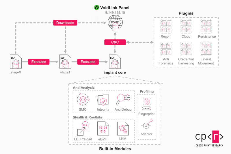 Эксперты в области кибербезопасности из компании Check Point Research обнаружили нестандартный вредонос, для которого в исходном коде указывается название VoidLink. К нему можно подключить более 30 модулей и настроить возможности атаки в соответствии с потребностями злоумышленников на каждой заражённой машине.