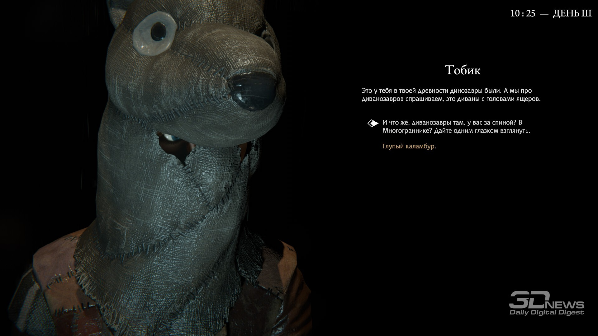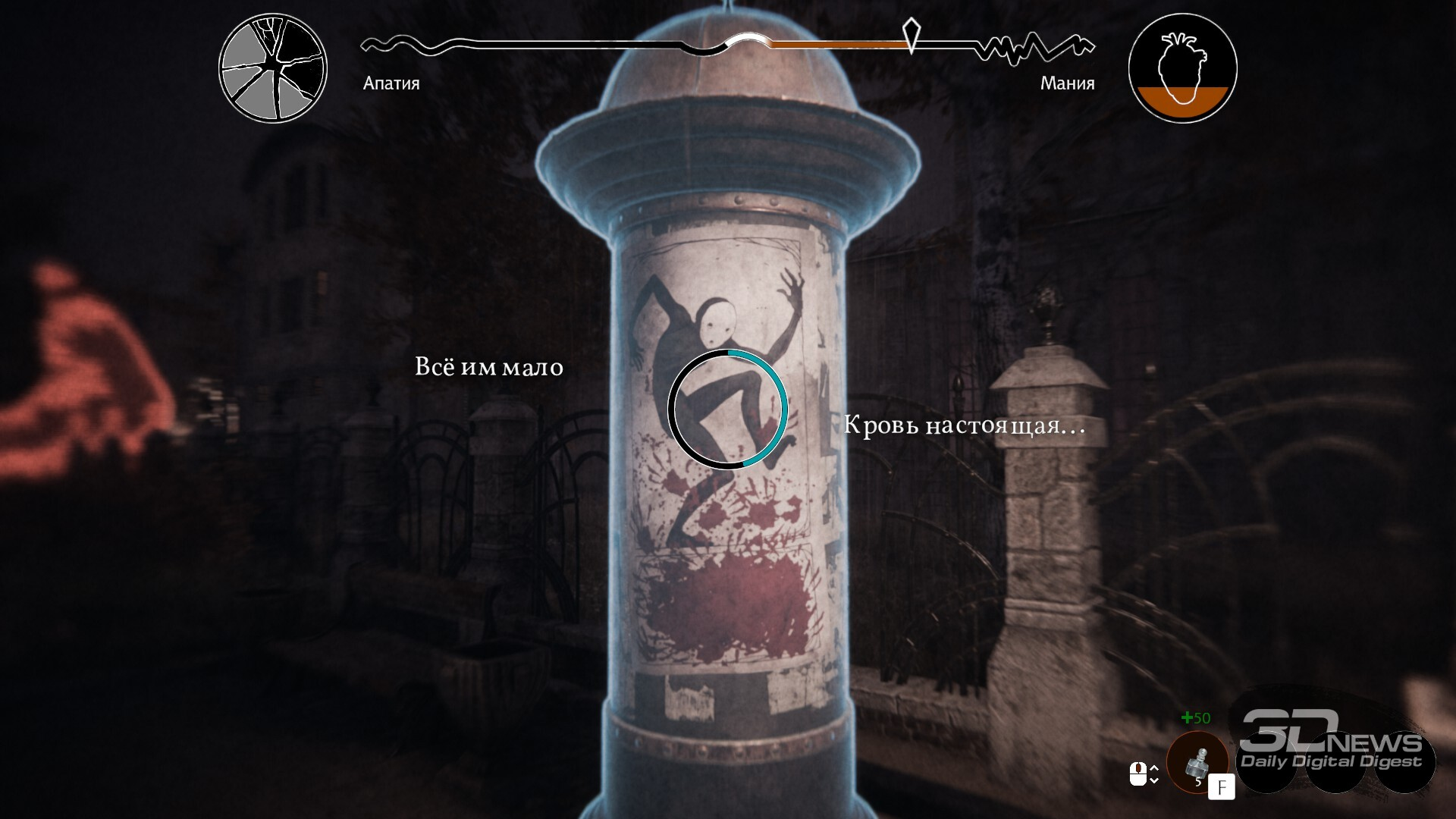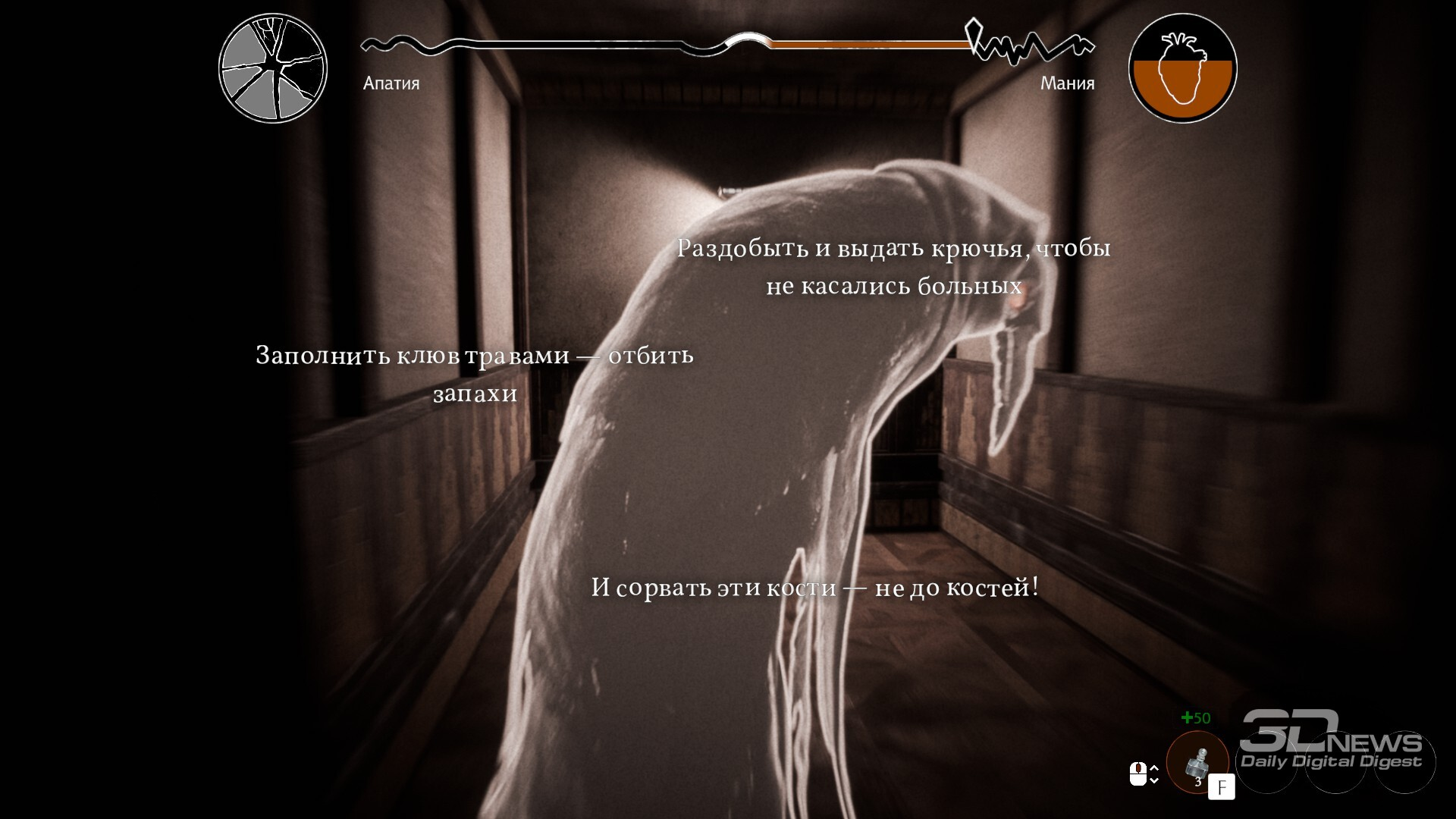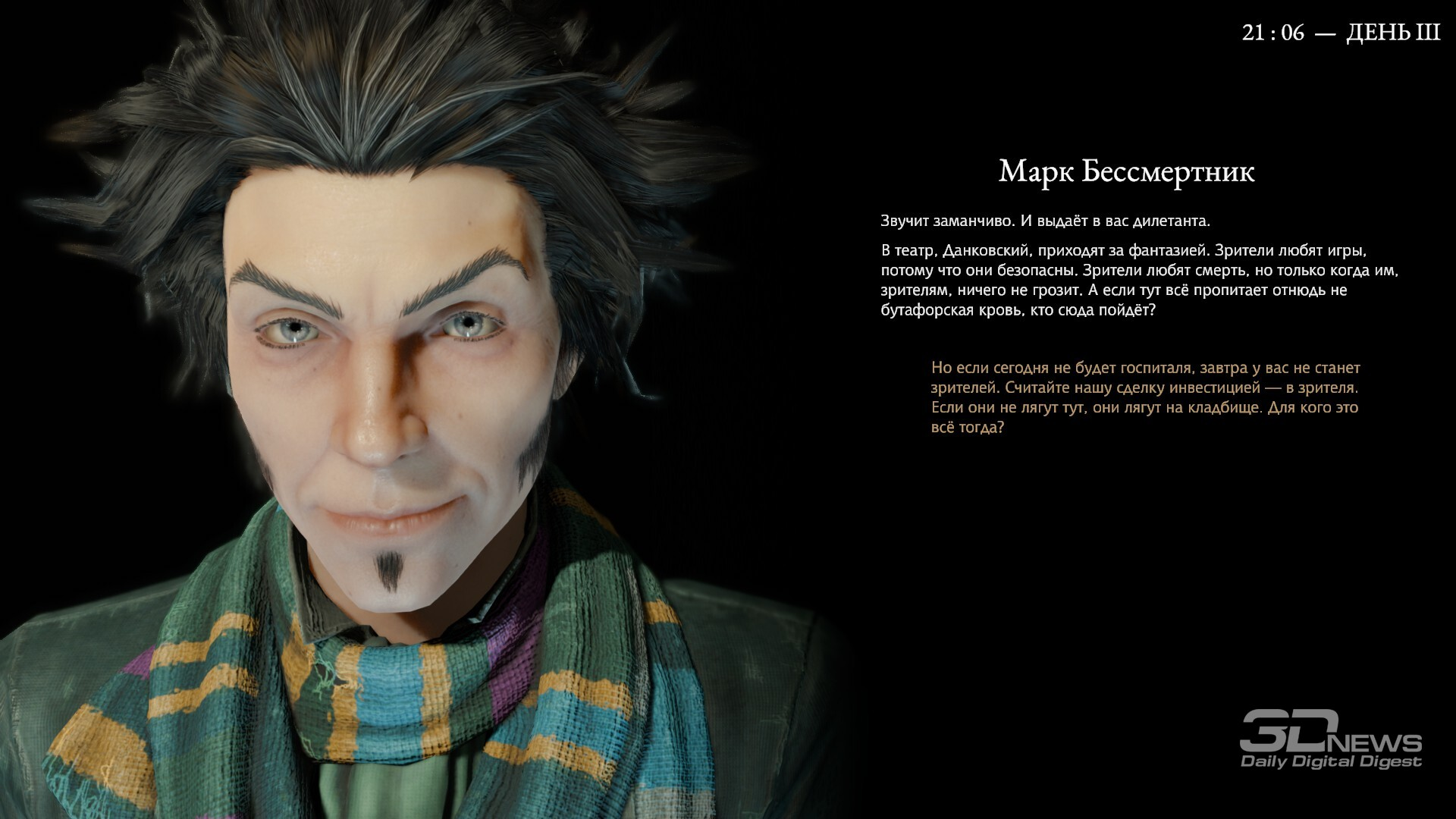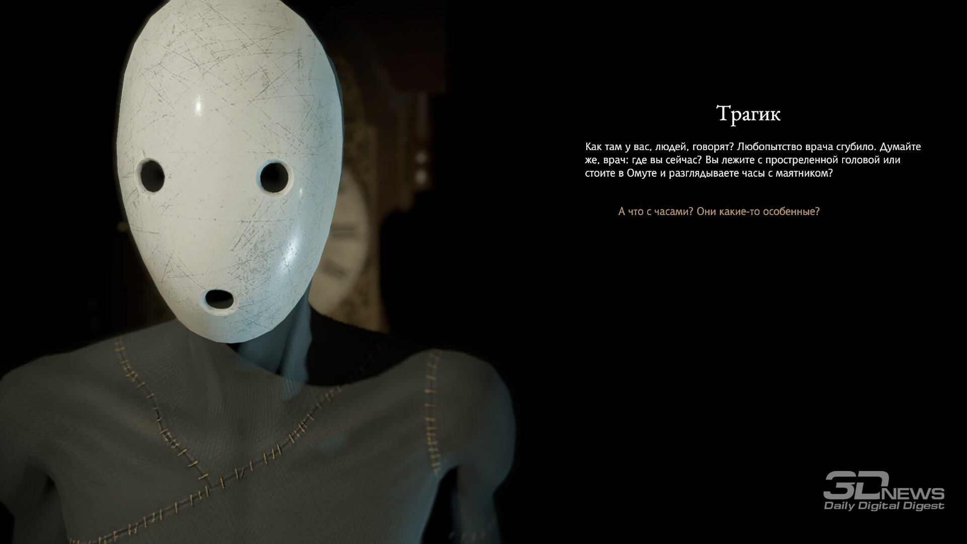 В заражённых кварталах можно встретить воплощение чумы, что начнёт нас преследовать. Или же это воплощение больного сознания Данковского? Или что-то ещё? Добавьте к этому довольно неловкие комментарии и реакции на каждую предыдущую реплику собеседника (приём, который даже в литературе ощущается дурным тоном, не то что в нарративном дизайне), и получите абсолютно утомительные и бессодержательные блоки текста, читать которые — истинное мучение. Допускаю, что в действительности это ловкий ход, чтобы дать игрокам возможность лучше прочувствовать психологический слом и умственное истощение Бакалавра. Но что-то мне подсказывает, что тоску Данковский не испытывает, и перебороть зевоту не силится. А вот игрок… *** Pathologic 3 — любопытный проект: интересный, захватывающий, многообразный. И оттого тем обиднее, что игре не хватает изящества в подаче — вместо него она раз за разом совершает лобовые атаки пластами многозначительности и рассуждений о метафизических материях. Увы, из-за этого теряется всякая ценность подобных размышлений. Не умаляю всех оригинальных и удачных находок, но мне сложно было искренне наслаждаться игрой и испытывать сильное эмоциональное вовлечение. Впрочем, как это часто бывает с авторскими высказываниями, Pathologic 3 вполне может понравиться вам ровно за те же самые вещи, которые меня оттолкнули… Достоинства: