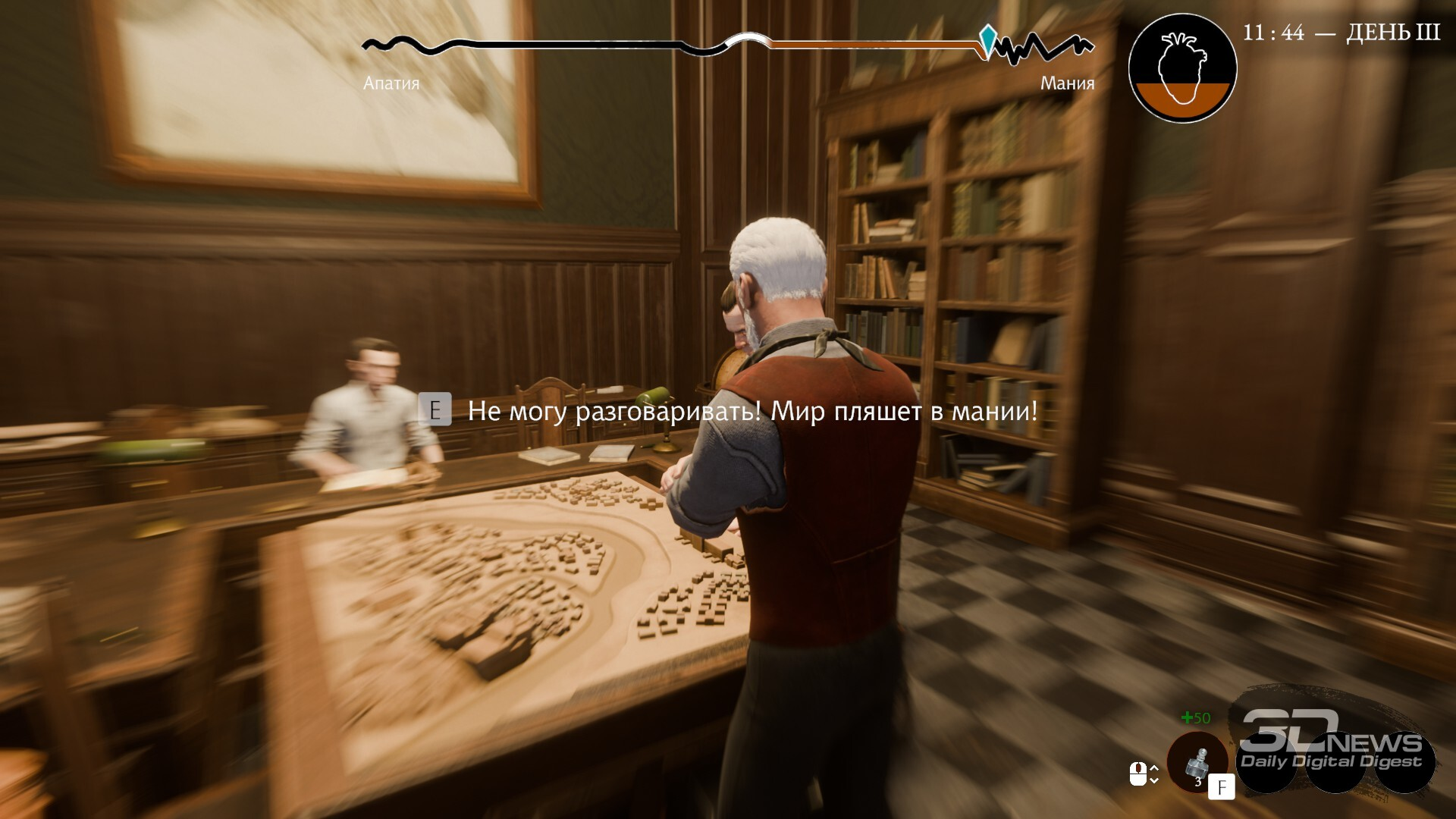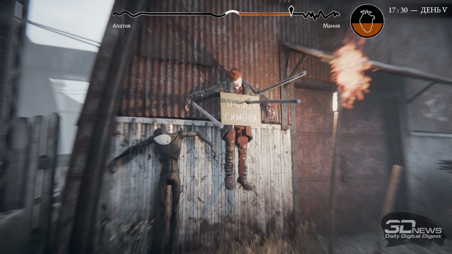 Стрелять на поражение не обязательно — иногда достаточно взять противника на мушку, а если он засомневается в наличии у вас патронов, всегда можно дать предупредительный в воздух ⇡#Простота хуже воровства?Количество интересных игровых решений и необычных механик впечатляет. И играть в Pathologic 3 невероятно интересно… на бумаге. Но в процессе у вас не раз и не два возникнет мысль: а мне вообще это надо? Ведь всё занимательное разделено куда менее увлекательными занятиями. Например, бесконечной ходьбой. Передвигаться на своих двоих предстоит много, и хоть в игре предусмотрено быстрое перемещение, проходить заражённые или враждебные кварталы всё равно нужно самостоятельно. Да и на ключевых локациях побегать (или побродить, если вы в апатии) придётся изрядно. Поначалу это не кажется проблемой, но возвращаться на каждую из локаций предстоит часто даже в рамках одного дня, а уж в контексте всей игры, учитывая повторы дней — неисчислимое количество раз. В конце очередного такого дня уже не протагонист, а игрок чувствует самое настоящее истощение, а мотивация продолжать стремительно тает. Не воодушевляет двигаться дальше и другая основополагающая часть игры — диалоги. Их здесь, ожидаемо, много: с каждым из персонажей можно детально проговорить многие аспекты городской жизни, обсудить чудовищную напасть или затронуть философские материи. С одной стороны, проработка действительно впечатляющая — из бесед можно почерпнуть множество полезного и как следует проникнуться миром. С другой — каким же грузным и порой излишне претенциозным языком написана большая часть диалогов. Буквально все герои, включая Данковского, стремятся вывалить на игрока весь свой внутренний мир чуть ли не каждой фразой. Порой даже смешно, как вместо быстрого и содержательного ответа на вас обрушивается очередное размышление о природе бытия (уже пятое за последние пару минут). Да и сами персонажи и их характеры как-то теряются и размываются из-за всей этой напускной гиперосмысленности.