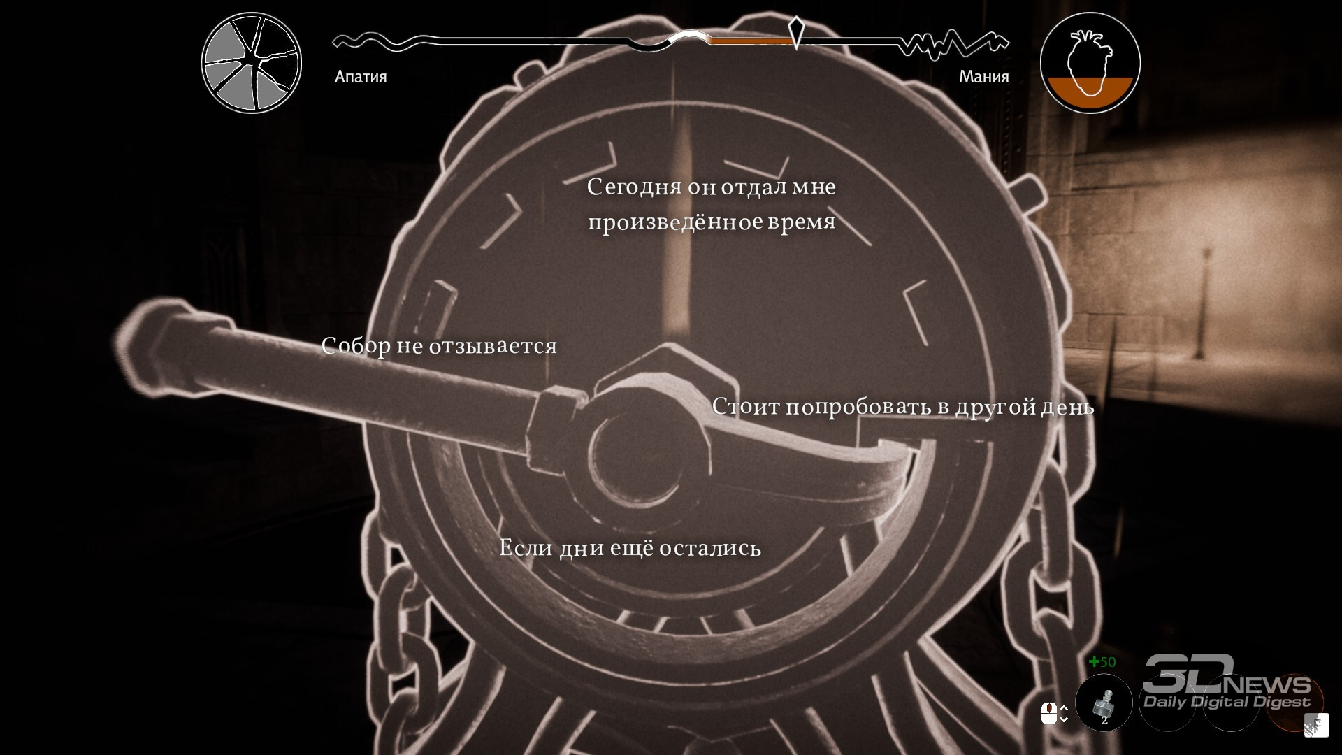 Карта мыслей номинально помогает сориентироваться во всех событиях дня, персонажах и целях Данковского Обусловлена нелинейная структура повествования и одной из ключевых механик игры — путешествиями во времени. И в Pathologic 3 это клише современного массового искусства обставлено с выдумкой. Отчаявшись и зайдя в тупик, Бакалавр не находит лучшего выхода из ситуации, кроме как спустить курок револьвера, направленного себе в лицо. Но этот финал — лишь одна из вероятностей; очутившись в Омуте, особенном метафизическом месте, врач узнаёт, что полотно времени можно переткать. С этого момента Данковскому и нам предстоит возвращаться в разные дни своего нахождения в городе, пытаясь что-то понять, что-то изменить, что-то исправить. Сфокусироваться, конечно же, стоит на борьбе с песчаной чумой. И с этим связаны наиболее любопытные элементы игры. А нам предстоит проводить практически детективные изыскания, общаясь в прошлом с теми, чьё течение «песчанки» в будущем выбивалось из общей клинической картины, проводить самые настоящие осмотры и даже ставить диагнозы. А уже на их основе оказывать влияние на важных людей города и таким образом избежать ошибок, которые в ином потоке времени уже привели к катастрофе.