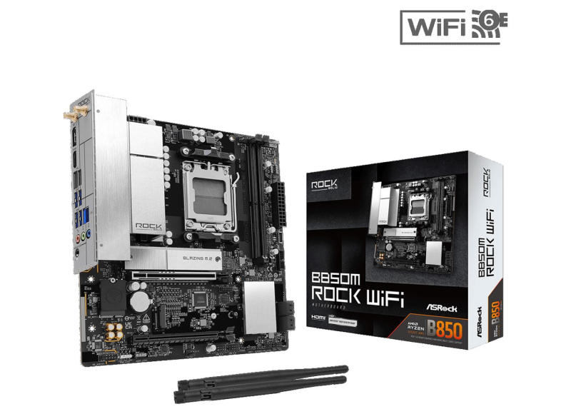 Модель B850M Rock WiFi представляет собой вариацию в формате Micro-ATX. Производитель заявляет для неё два слота DDR5 с поддержкой памяти DDR5-8200+ (через разгон), один PCIe 5.0 x16, два M.2 для NVMe-накопителей (один PCIe 5.0, другой — PCIe 4.0), а также поддержку Wi-Fi 6E.