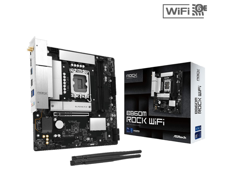 Модель B860M Rock WiFi выполнена в формате Micro-ATX. Она получила два слота для памяти DDR5 с поддержкой DDR5-8333+ (через разгон), два M.2 для NVMe-накопителей (один PCIe 5.0, другой — PCIe 4.0) и поддержку Wi-Fi 6E. ASRock также отмечает у неё наличие заднего разъёма USB 3.2 Gen2x2 Type-C.