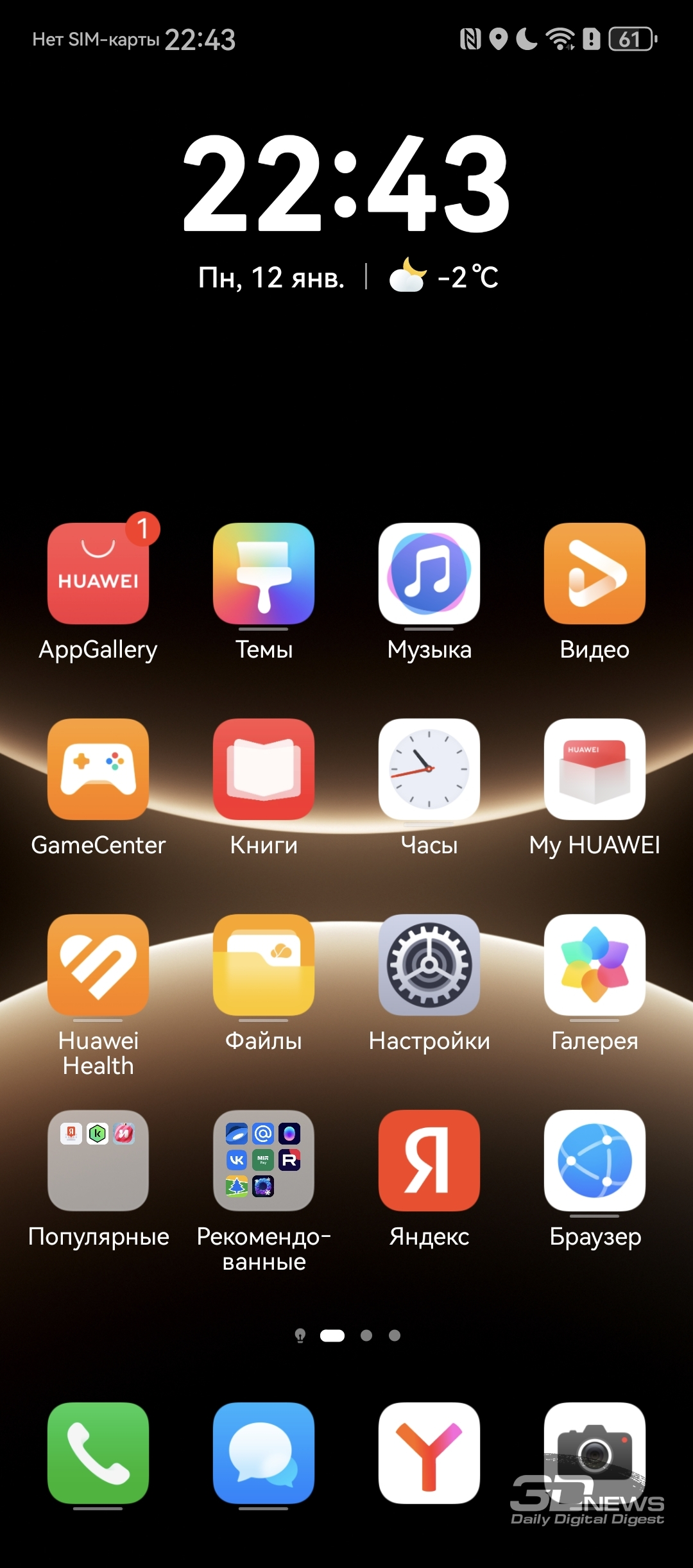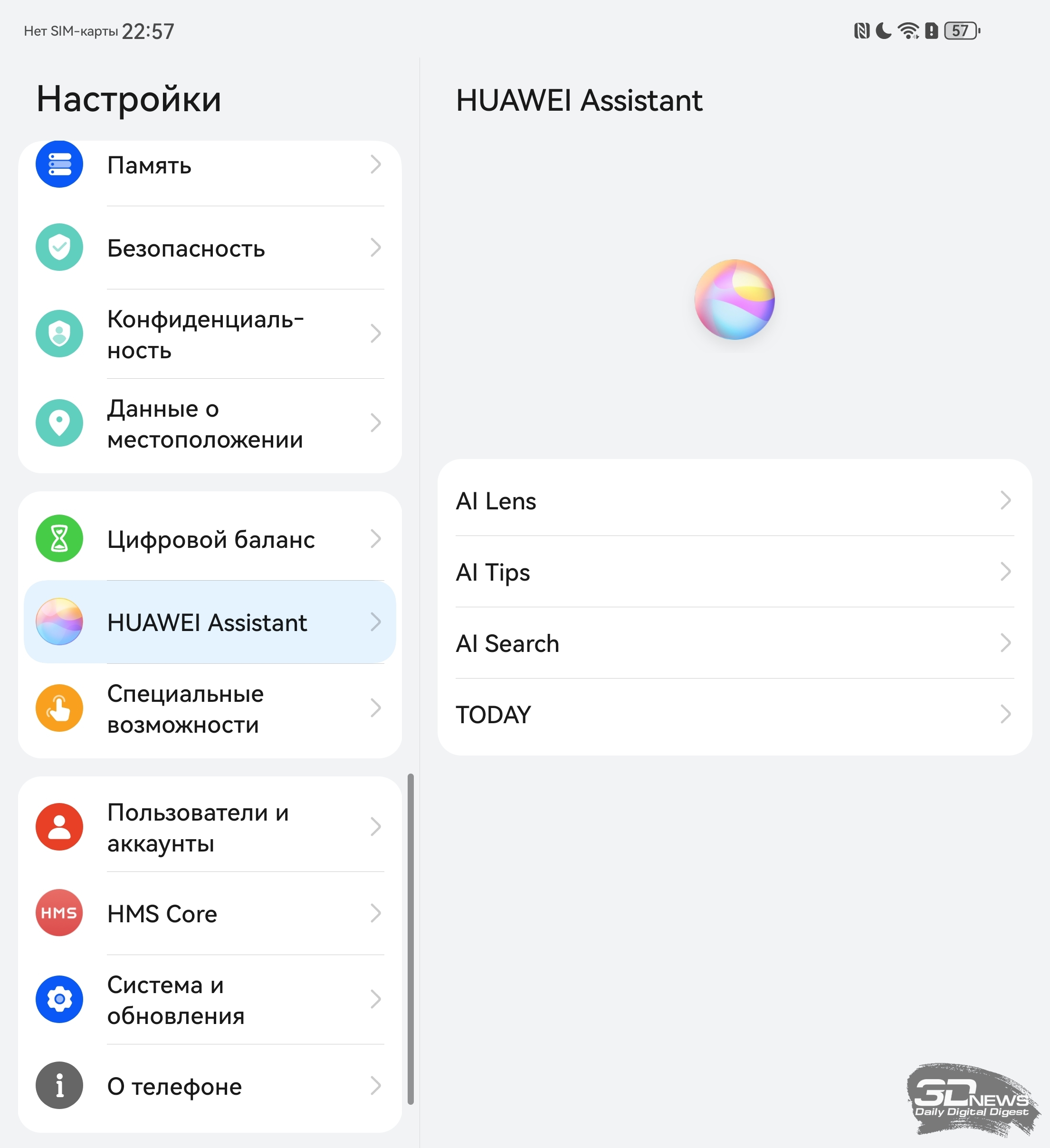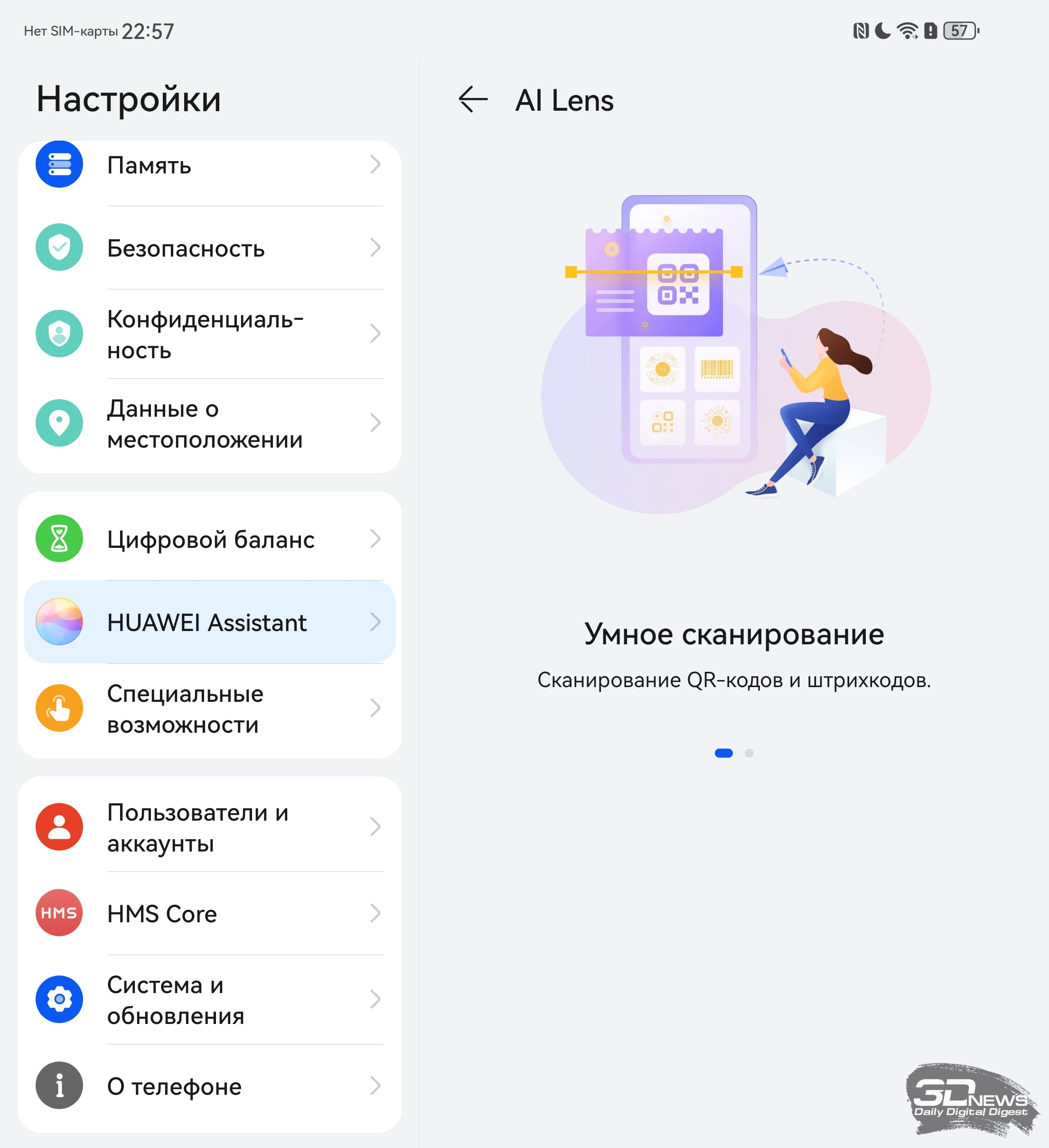 В остальном можно сказать, что EMUI – быстрая и симпатичная среда, но с чрезмерным количеством рекомендованного для установки софта, да и предустановленных программ много. Навигация по системе устроена вполне понятно, возможности кастомизации интерфейса неплохие. А вот привычной для сегодняшних смартфонов интеграции нейросетей тут нет — Huawei в этом плане немного отстает от конкурентов. Да, есть некоторые опции обработки изображений (удаление объектов, выбор портрета из серии с лучшей мимикой, повышение яркости, выравнивание картинки, повышение четкости текста) и набор не самых заметных функций, вроде интерактивных тем для экрана блокировки с реакцией на жесты, умного поиска и сервиса рекомендации приложений. Частично это компенсируется полноценной интеграцией «Алисы» от «Яндекса», которая вызывает при коротком нажатии на клавишу питания. Подобный подход мы уже видели, например, на HUAWEI nova 14 Pro и планшетах бренда. Это, конечно, базовая «Алиса», без Live-режима, но в качестве ИИ-помощника она проявляет себя неплохо. Кстати, любопытный нюанс — «Алиса» активируется только при установленной российской SIM-карте (можно даже вставить и убрать ее или использовать eSIM, но это обязательное условие). Нейросетевые возможности HUAWEI Mate X7