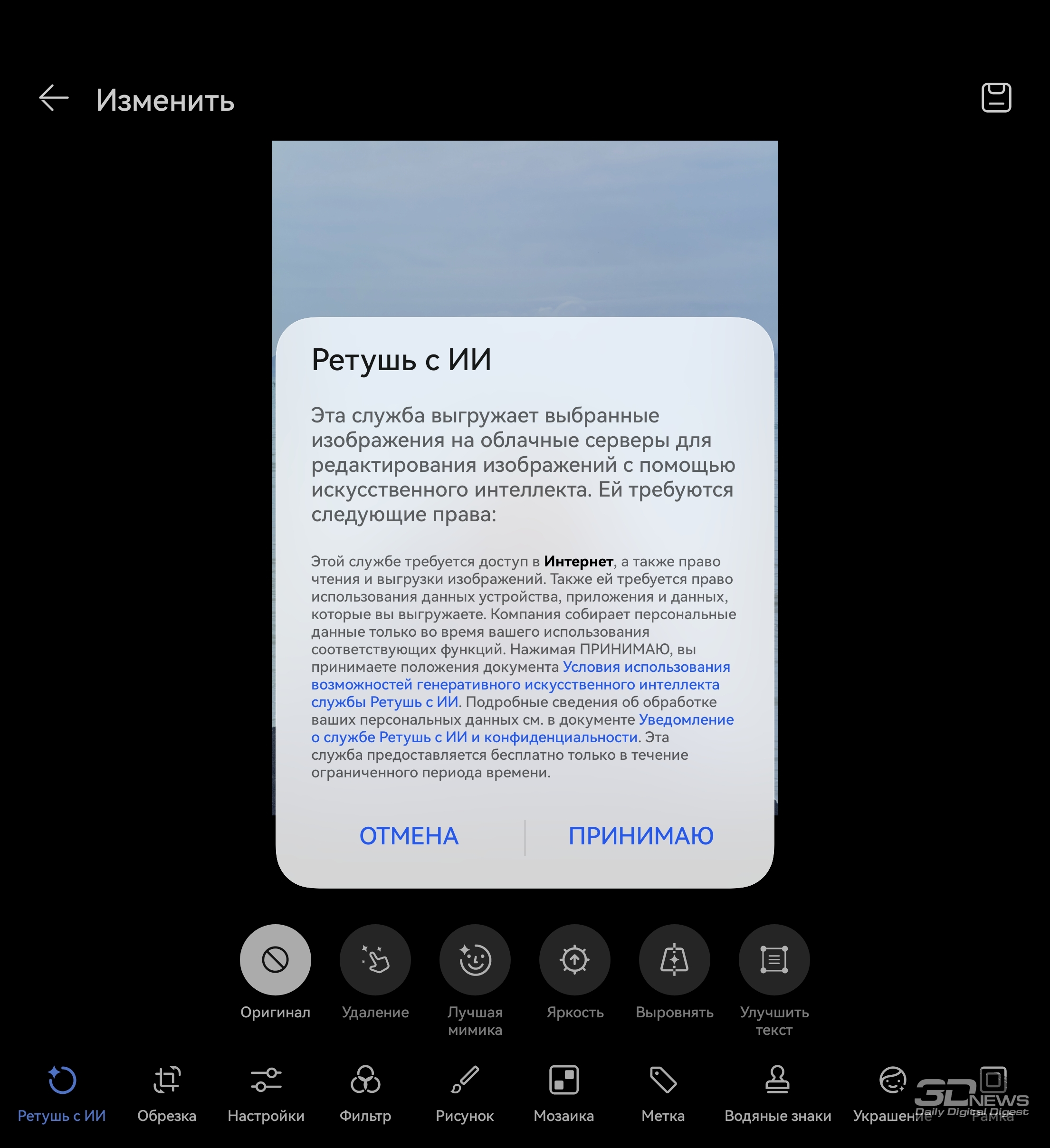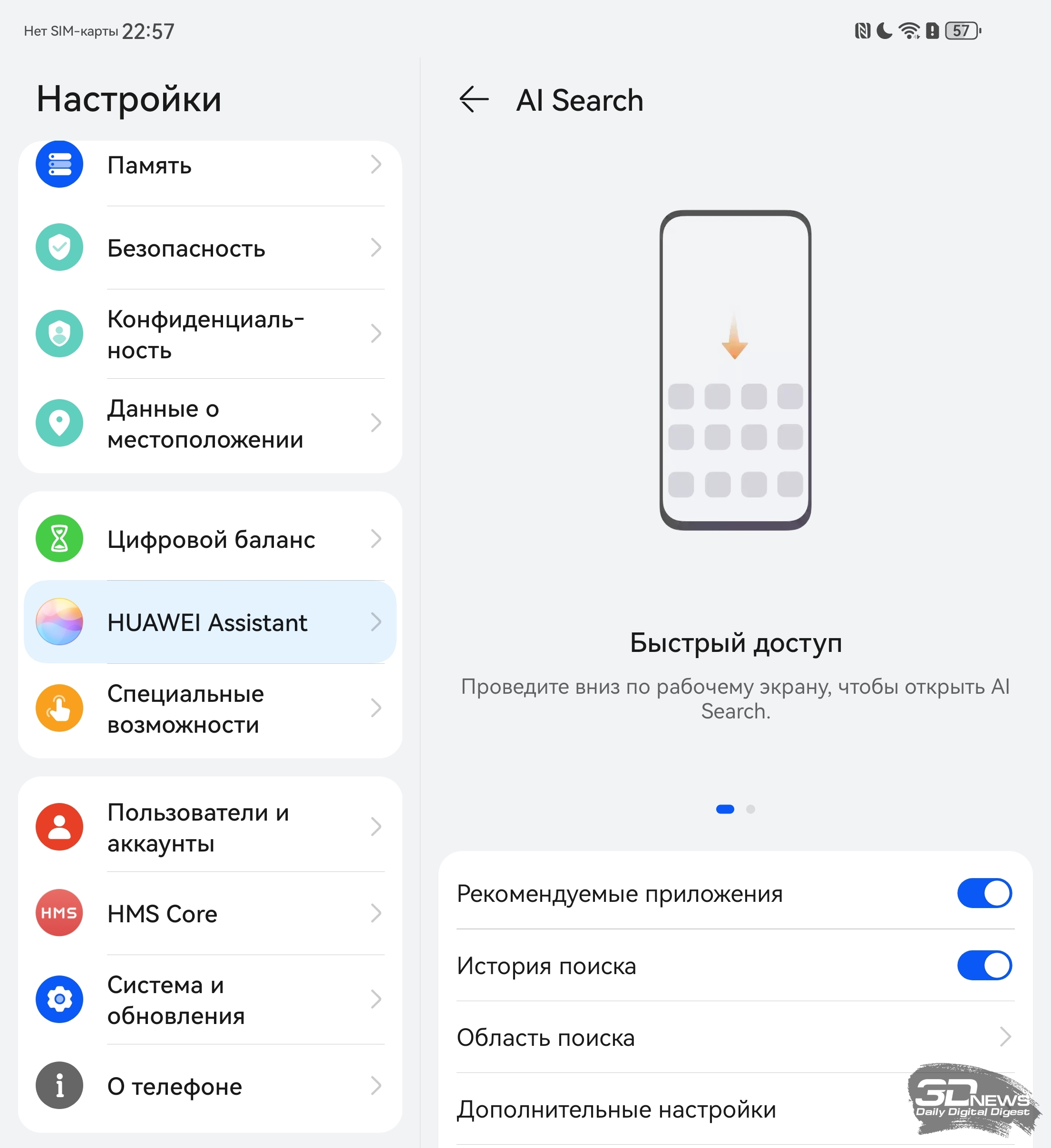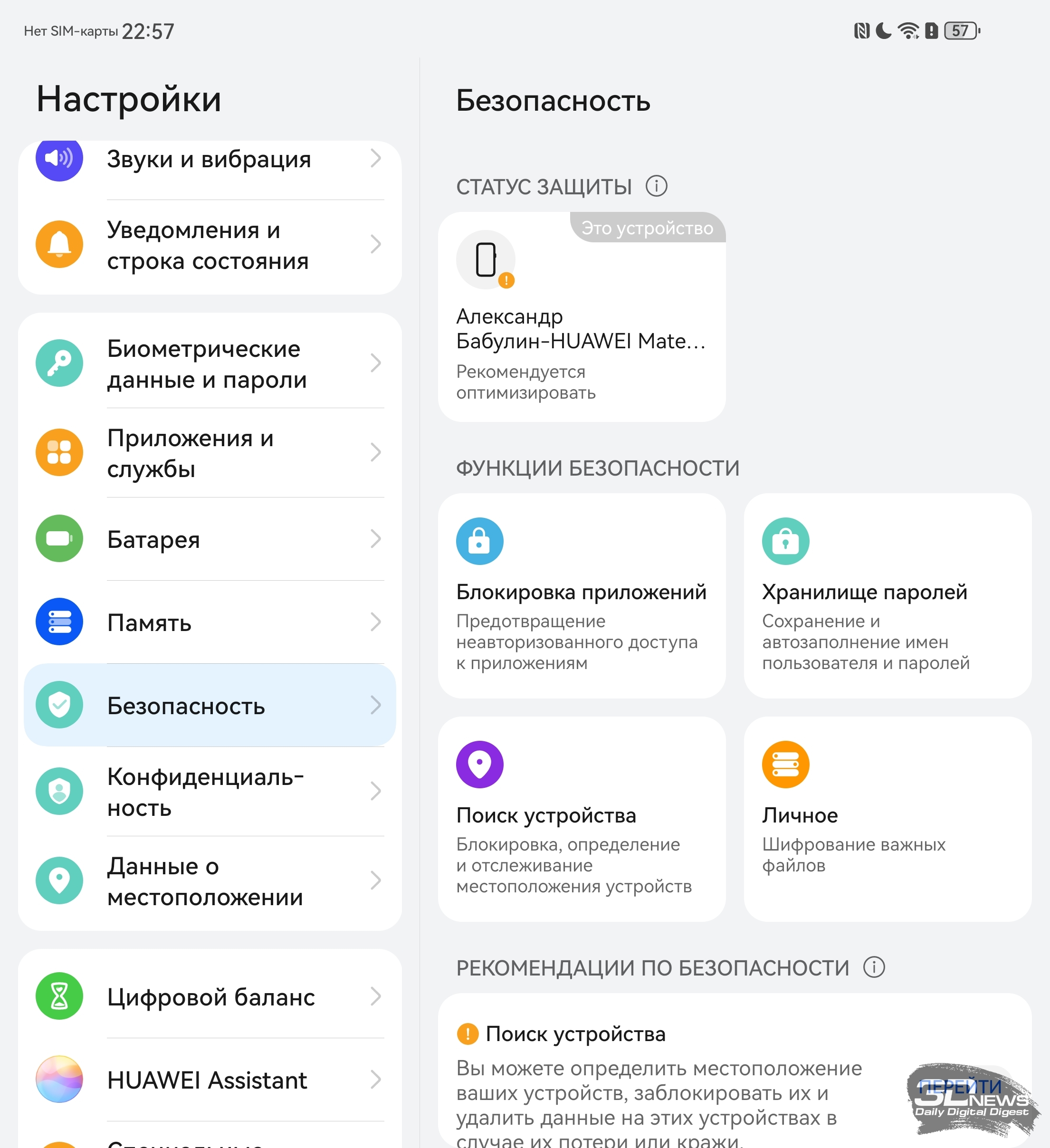 В остальном можно сказать, что EMUI – быстрая и симпатичная среда, но с чрезмерным количеством рекомендованного для установки софта, да и предустановленных программ много. Навигация по системе устроена вполне понятно, возможности кастомизации интерфейса неплохие. А вот привычной для сегодняшних смартфонов интеграции нейросетей тут нет — Huawei в этом плане немного отстает от конкурентов. Да, есть некоторые опции обработки изображений (удаление объектов, выбор портрета из серии с лучшей мимикой, повышение яркости, выравнивание картинки, повышение четкости текста) и набор не самых заметных функций, вроде интерактивных тем для экрана блокировки с реакцией на жесты, умного поиска и сервиса рекомендации приложений. Частично это компенсируется полноценной интеграцией «Алисы» от «Яндекса», которая вызывает при коротком нажатии на клавишу питания. Подобный подход мы уже видели, например, на HUAWEI nova 14 Pro и планшетах бренда. Это, конечно, базовая «Алиса», без Live-режима, но в качестве ИИ-помощника она проявляет себя неплохо. Кстати, любопытный нюанс — «Алиса» активируется только при установленной российской SIM-карте (можно даже вставить и убрать ее или использовать eSIM, но это обязательное условие). Нейросетевые возможности HUAWEI Mate X7